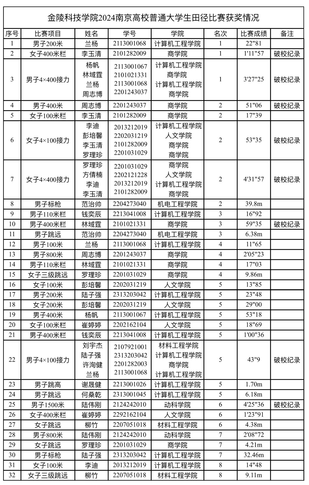 经过激烈角逐,田径队在比赛中共破8项校记录,摘得3枚金牌、5枚银牌、3枚铜牌,取得了男子团体第二、女子团体第四、男女团体第二的历史最好成绩。