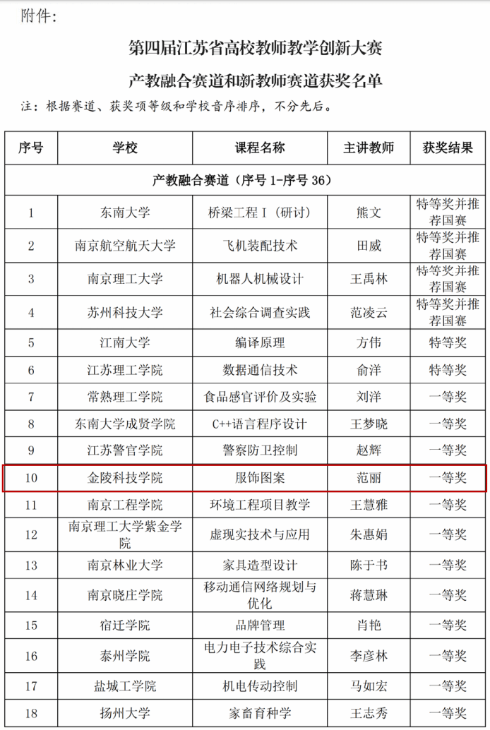 自本届赛事开赛以来,教学质量评估中心认真研读比赛方案,精准吃透评价标准,会同相关学院及部门协同发力,以学校教师教学奖评选为平台,开展第四届江苏省高校教师教学创新大赛校赛选拔赛,合计推荐6位老师参加省赛,其中4位教师获奖。范丽老师的《服饰图案》、李恩康老师的《城乡规划原理》等2门课程作品在全省参赛作品中脱颖而出,顺利进入省赛决赛并获得一等奖。
