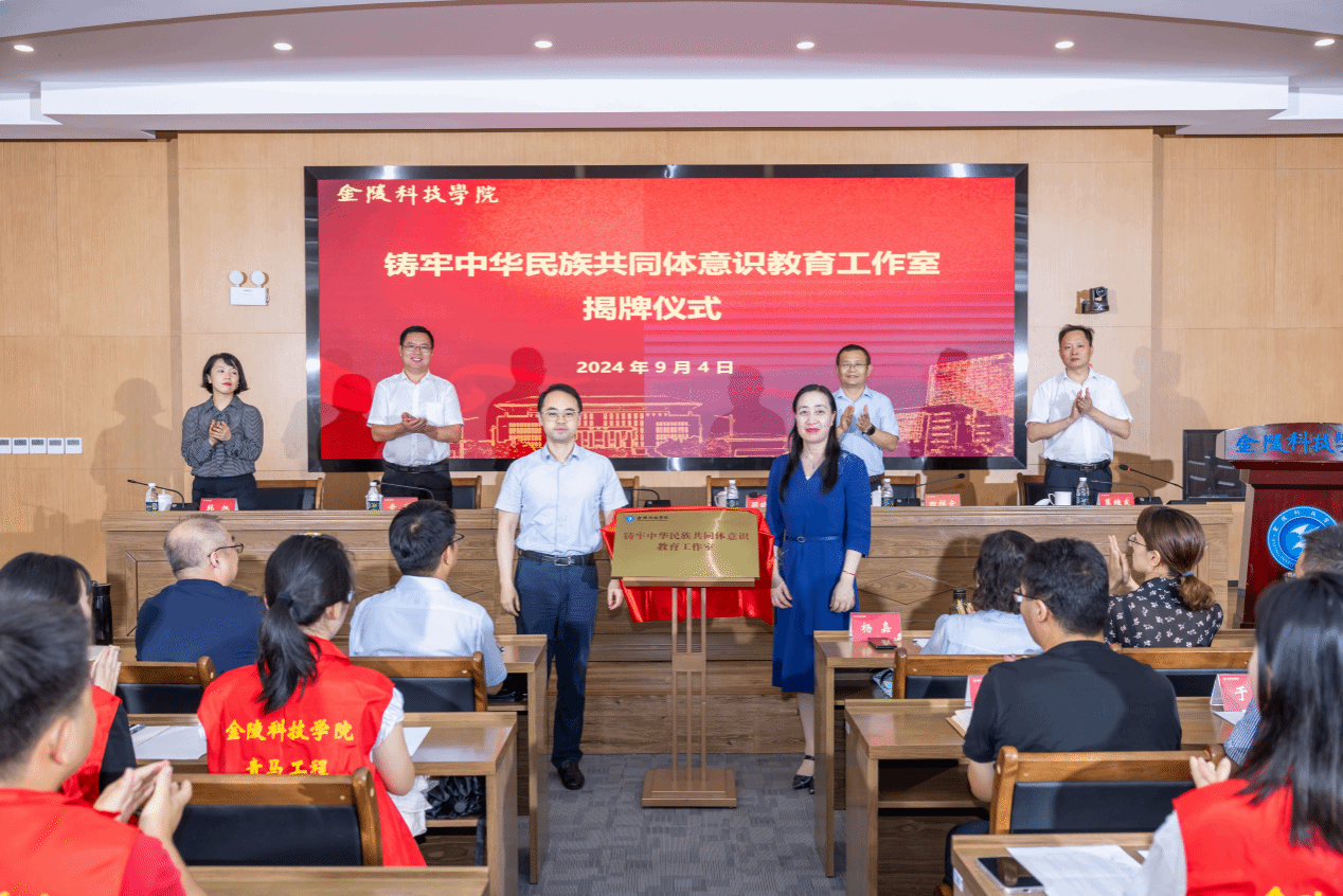 9月4日下午,我校在行政楼报告厅举行《中华民族共同体概论》开课仪式,校党委副书记单晓峰、副校长顾晓燕出席。开课仪式由马克思主义学院党总支部书记、副院长葛维东主持,党委统战部、教务处、团委等部门主要负责人,课程教学团队成员及选修该课程的学生参加开课仪式。单晓峰和顾晓燕共同为“铸牢中华民族共同体意识教育工作室”揭牌,马克思主义学院教授吴锦旗为选课学生讲授第一讲“中华民族共同体基础理论”。