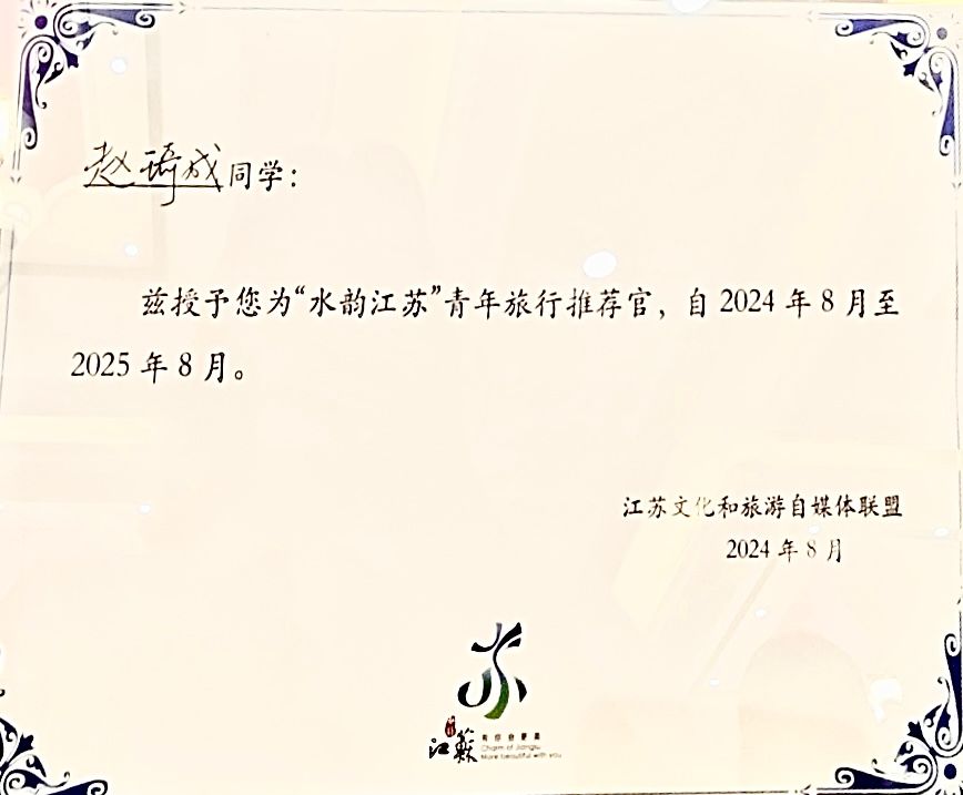 为全面推广江苏优质文化和旅游资源,打造一系列具有广泛吸引力的新媒体产品,进一步扩大“水韵江苏”和“江苏共青团”两大政务新媒体的品牌影响力,江苏省文化和旅游厅与共青团江苏省委联合指导,省数字文化和智慧旅游发展中心与团省委新媒体发展中心共同发起了2024年“苏团青媒”培育计划及“水韵江苏”青年旅行推荐官训练营。我校团委新媒体运营中心赵琦成同学获首批4名“水韵江苏”青年旅行推荐官之一,他的原创作品《运河百景——水与火之歌》以诗意盎然的语言和画面,引领观众深入探索南京文化底蕴,展示了水运历史与现代南京的活力。省文化和旅游厅党组成员、副厅长钱宁,共青团江苏省委副书记韩淼出席结营仪式,并为“水韵江苏”青年旅行推荐官颁发证书。