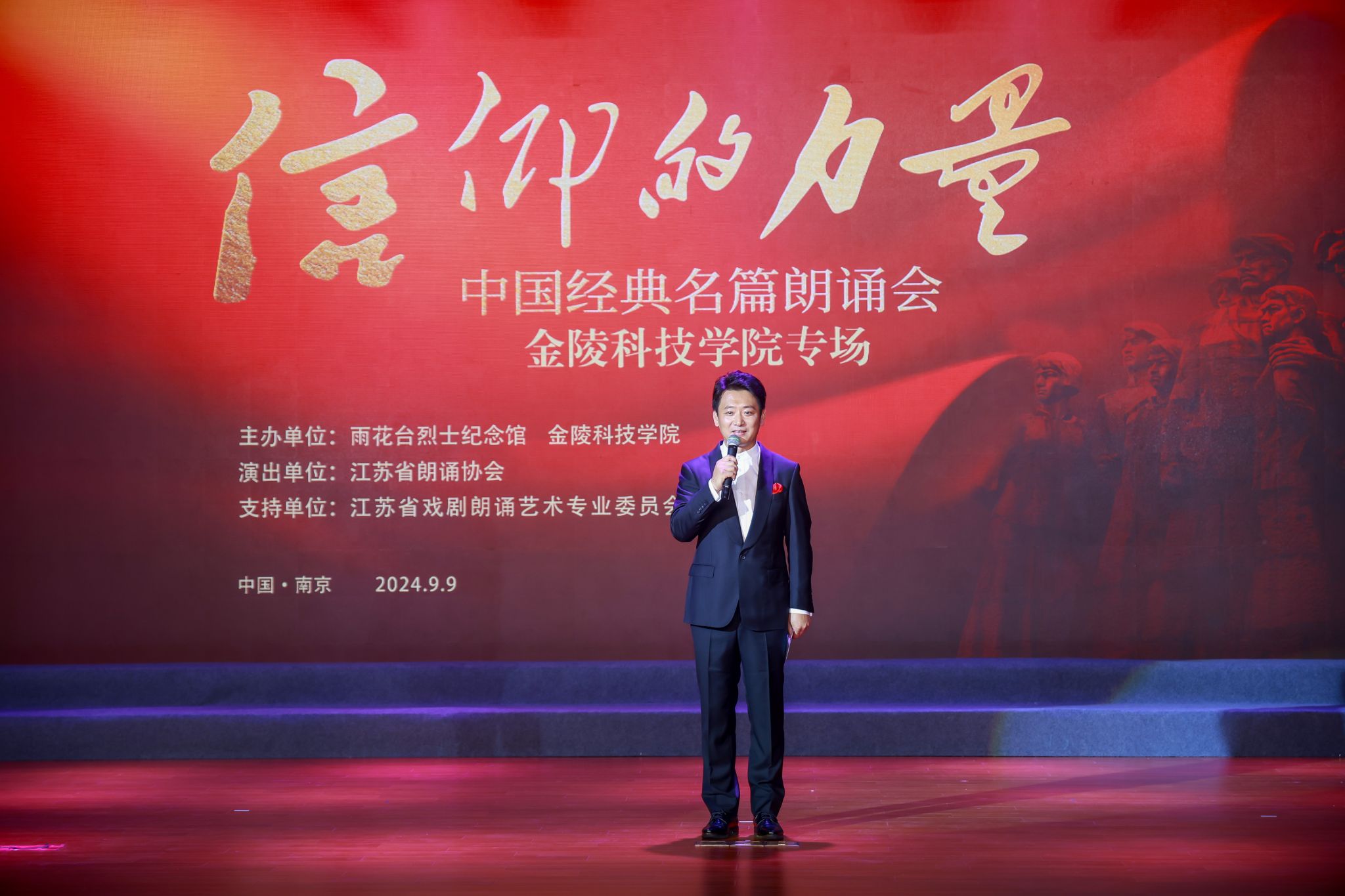 今年是新中国成立75周年,为进一步宣传与弘扬雨花英烈事迹与精神,近日,由雨花台烈士纪念馆、开云在线联合主办,携手江苏省朗诵协会、江苏省戏剧朗诵艺术专业委员会共同举办的“信仰的力量”中国经典名篇朗诵会开云在线专场顺利上演,讲述英烈故事,传承革命精神。副校长张燕、副校长王延光、副校长顾晓燕、纪委书记王靖华,我校和高新区中学、齐武路小学的师生代表以及雨花台烈士纪念馆新入职员工等近1100人现场观看。南京市科教卫体工会联合会主席程晓燕应邀观演。
