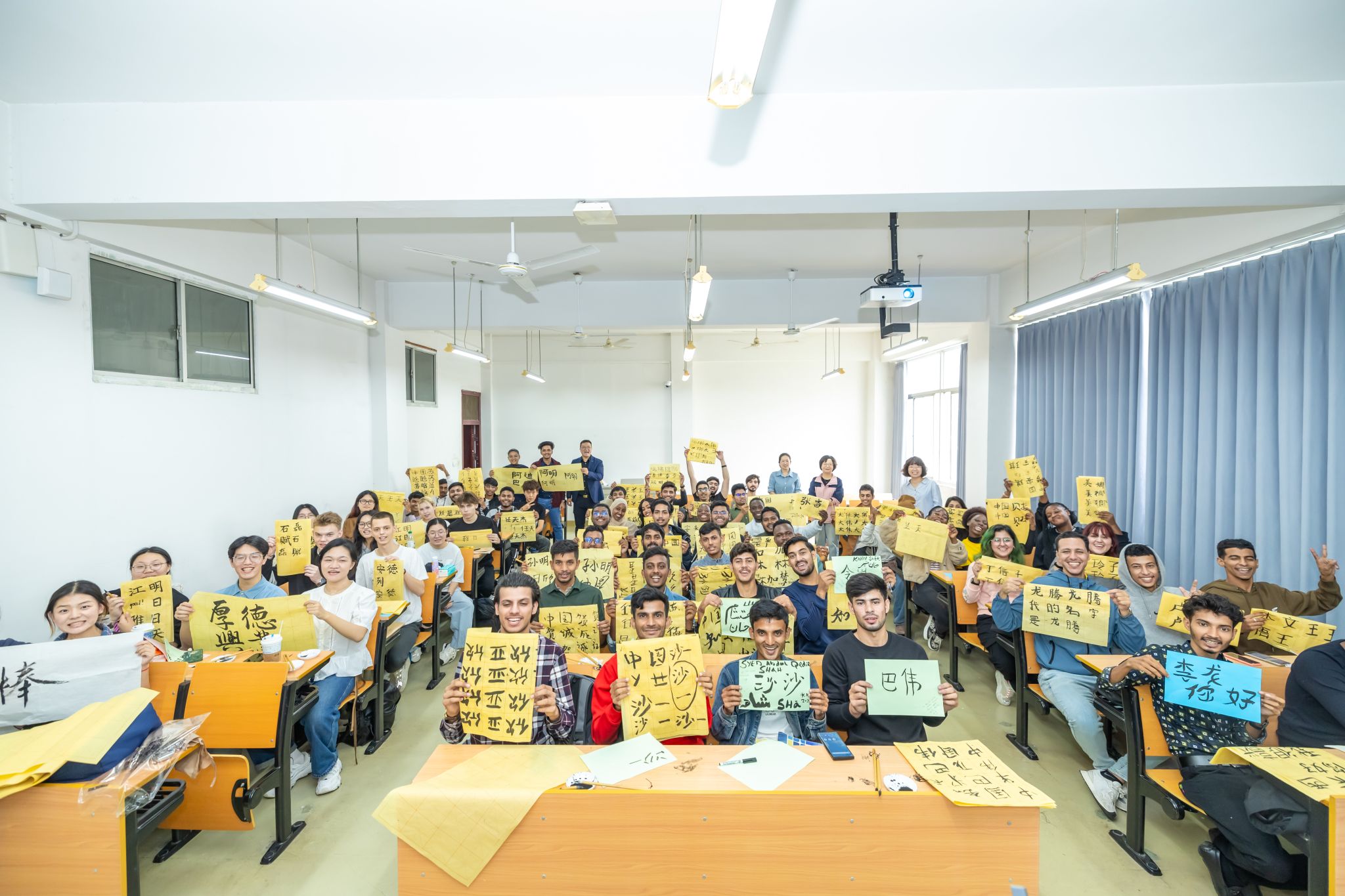 10月14日,来华留学生正式进入课程学习。为培养“知华、友华、爱华”的来华留学生,国际合作与交流处组织留学生们集中观看了“江苏省高校来华留学生开学第一课”,国际合作与交流处、国际教育学院相关人员参加视频学习。为增进留学生的中国文化认同感,在中国传统文化课上,人文学院方芳老师带领对外汉语专业的志愿者,和留学生一起书写中文名字。