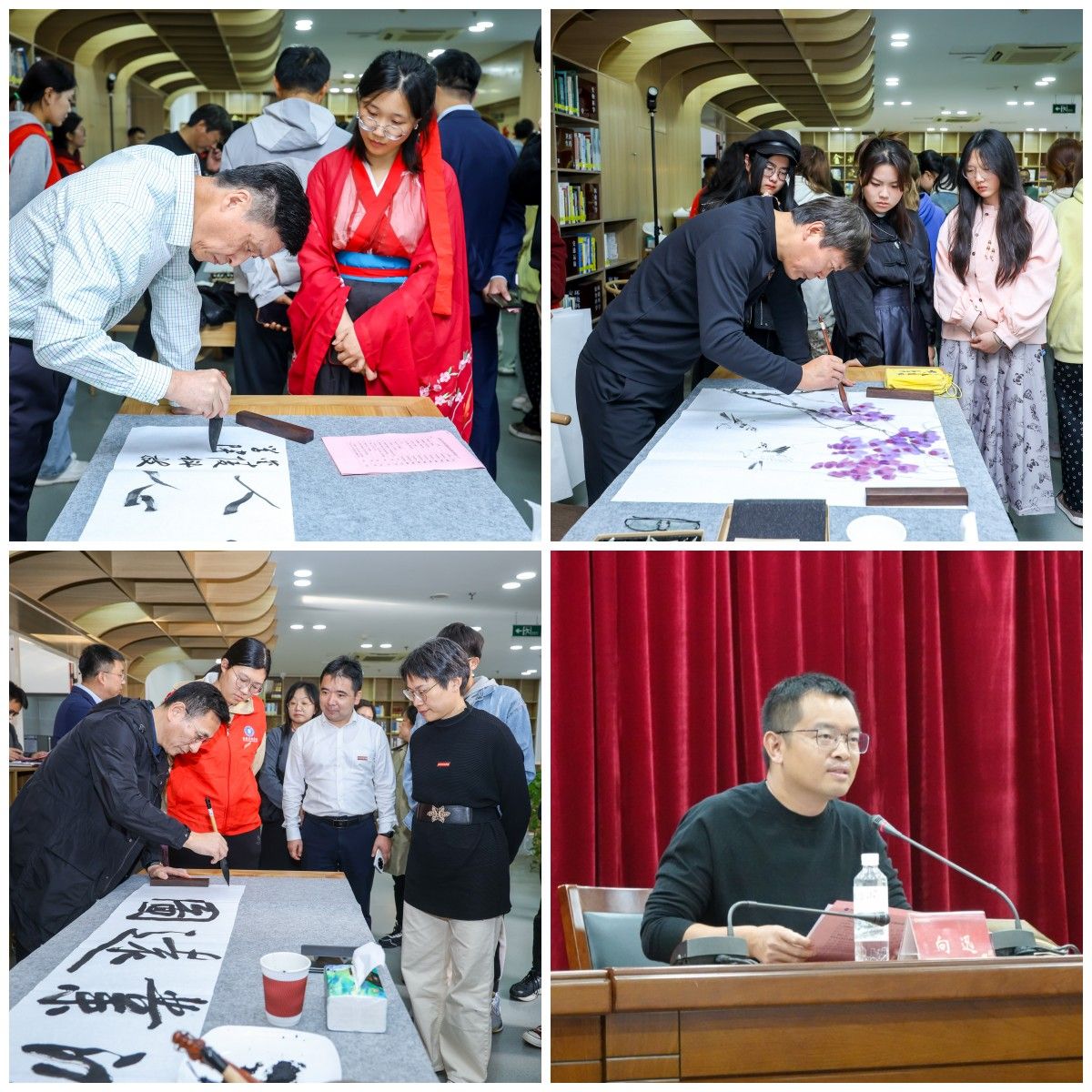 会后,文化艺术名家们来到图书馆职工书屋铺纸蘸墨,尽情展示精湛的书画技艺,笔到之处或苍劲有力,或厚重敦实,或飘逸灵动,或温和圆润,一幅幅书画作品引得在场师生驻足许久,赞叹喝彩。与此同时,一场文学沙龙在图书馆第二报告厅开展,向迅带来题为《童年生活经验对文学创作的影响》的精彩报告,分享了自己对文学的一些基本看法以及文学创作的方法与心得。书法、绘画、文学“好戏连台”,让师生们享受了一场高雅的美学盛宴,感受到文都南京的独特魅力。