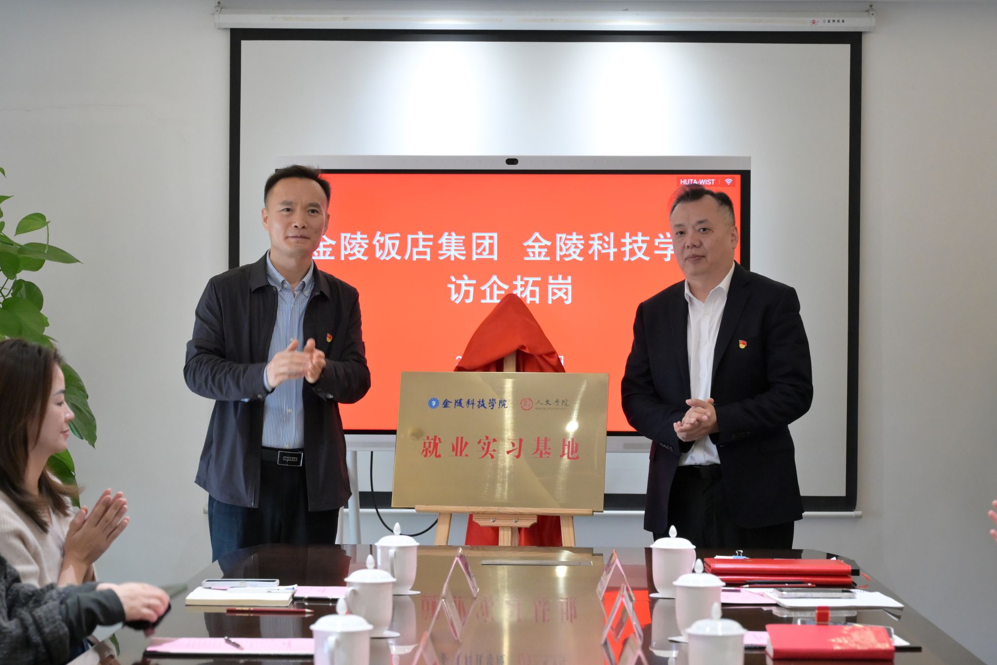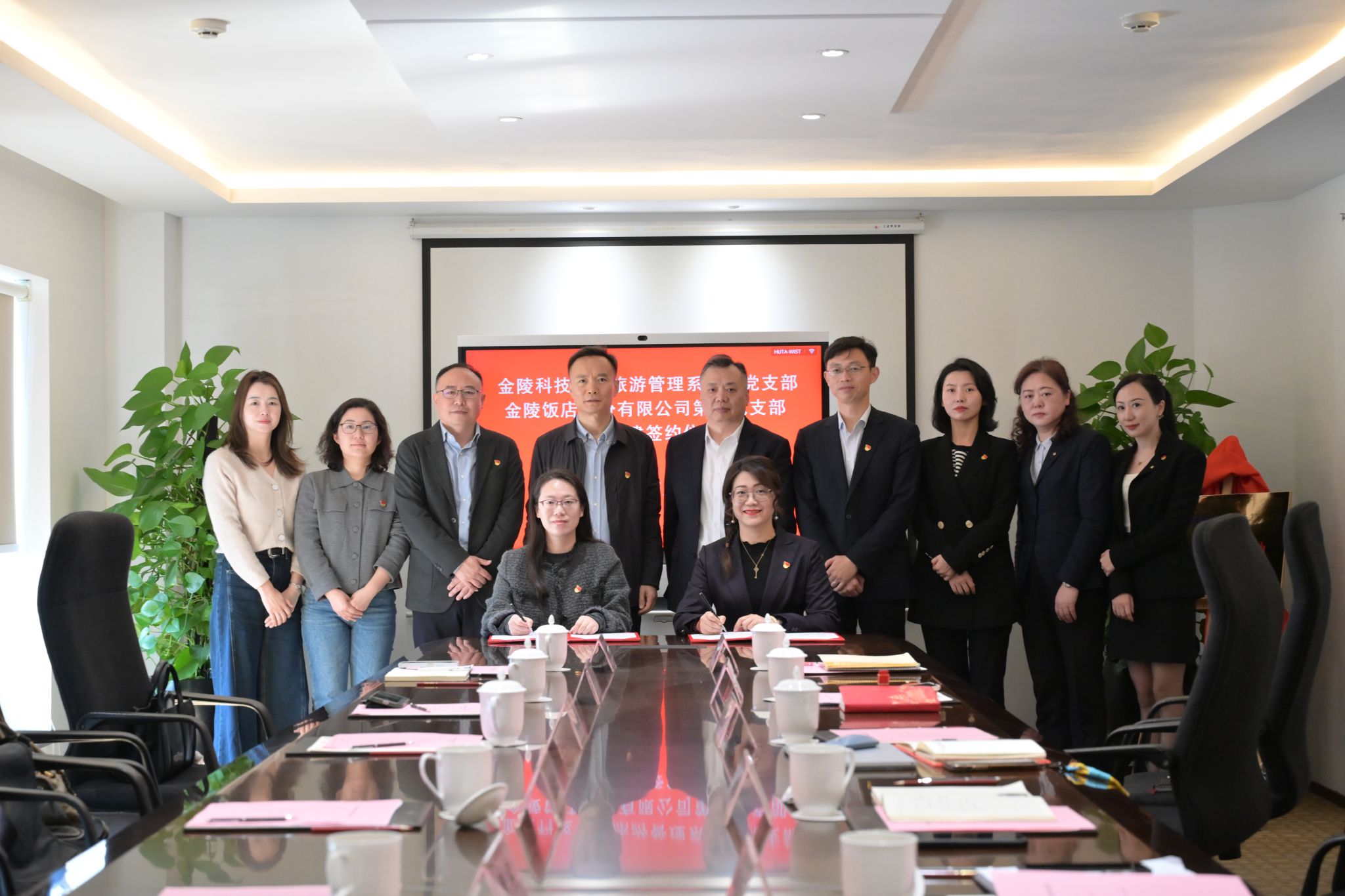 访企拓岗期间,双方举行了就业实习基地揭牌和党支部共建协议签约活动。我校人员参观了金陵饭店股份有限公司“六高先锋”党建阵地、亚太商务楼,并看望了在金陵饭店工作的校友。