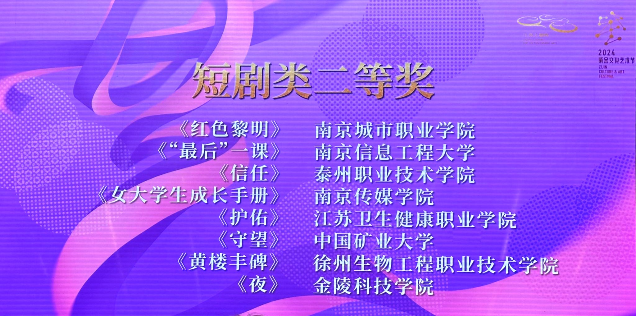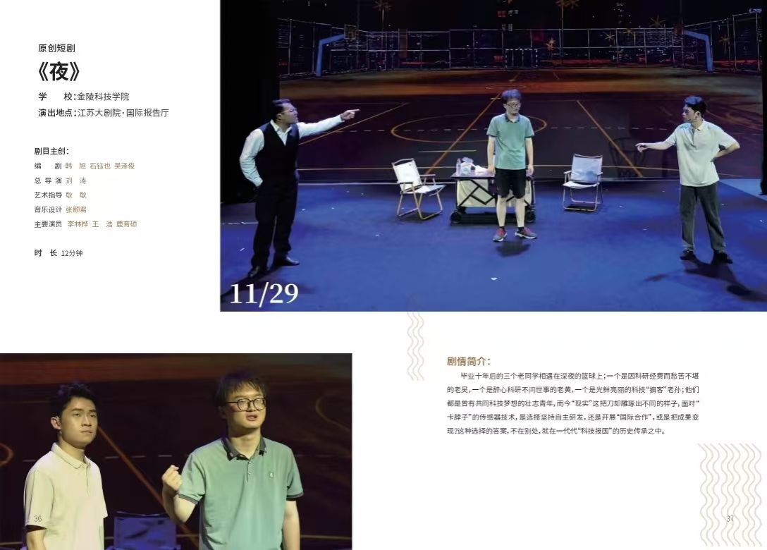 近日,由中共江苏省委宣传部、江苏省教育厅主办,江苏省戏剧家协会、江苏大剧院、江苏省大学生艺术团联合会承办的2024江苏省大学生戏剧展演颁奖仪式在江苏大剧院国际报告厅隆重举行。全省共有62所高校申报了96部作品,其中长剧11部、短剧75部、戏曲10部。经资格审查、评委现场审看申报视频、集中评议和分别打分等环节,26所高校的8部长剧、20部短剧、7部戏曲作品入围终评展演。我校原创短剧《夜》脱颖而出,获得2024江苏省大学生戏剧展演短剧类二等奖。