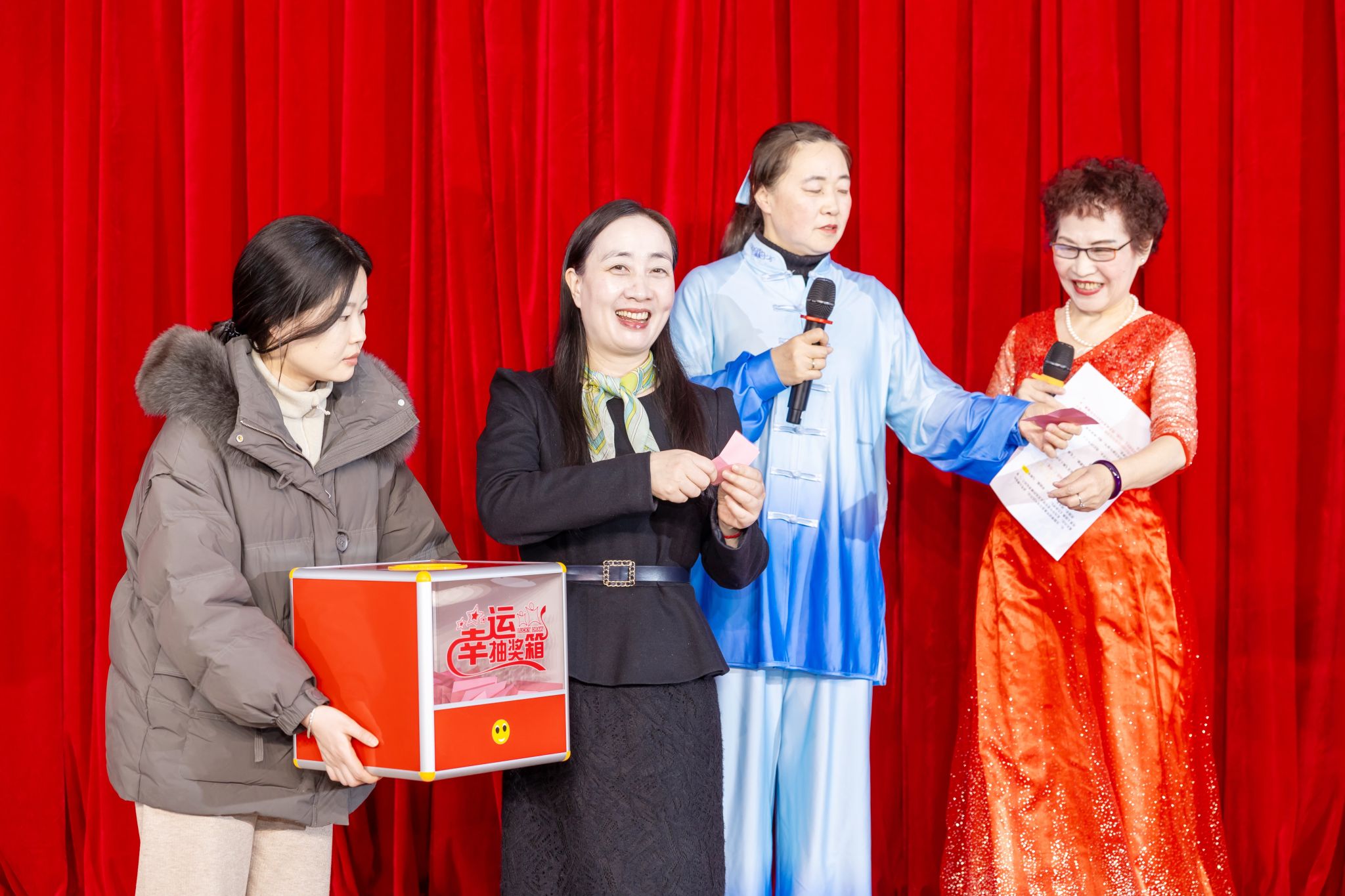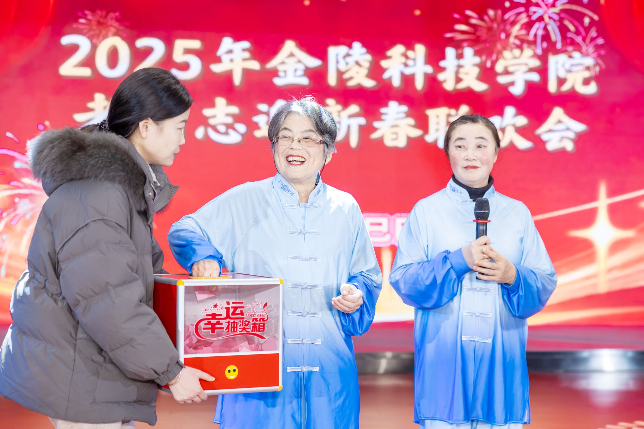 幸运抽奖环节为联欢会增添了乐趣和惊喜,现场气氛持续升温,副校长顾晓燕、校关工委常务副主任谢培苏、校退教协会会长刘卫东分别抽取一、二、三等奖项,为获奖人员颁奖并合影留恋。