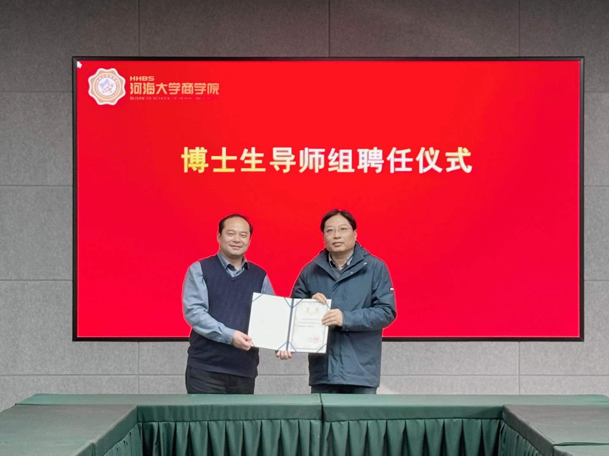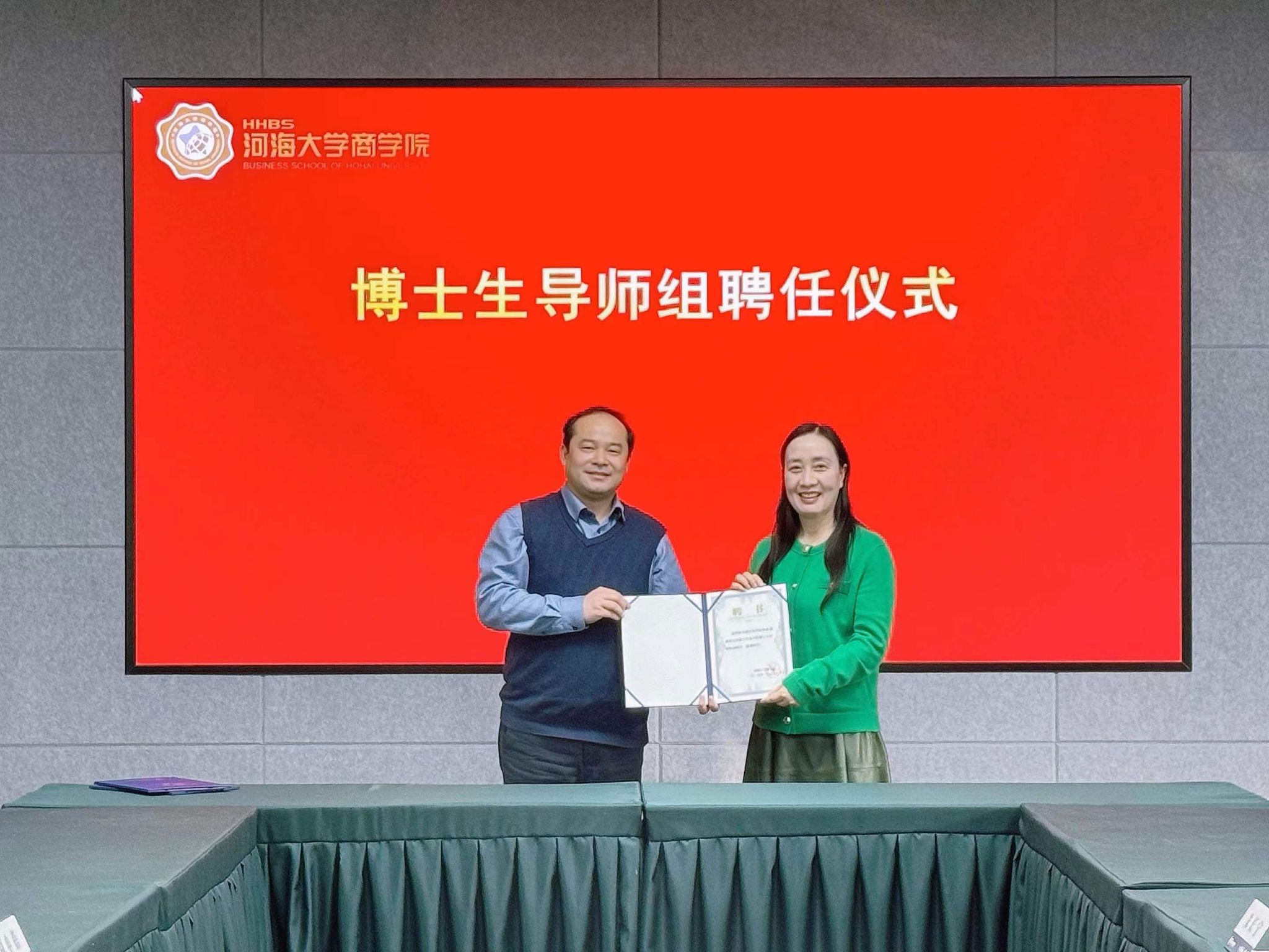 1月21日,我校商学院与河海大学商学院在河海大学博学楼A101会议室举行人才培养合作框架协议签约暨博士生导师组聘任仪式。河海大学商学院党委书记陈杰、副院长(主持工作)张长征、副院长张可、院长助理周申蓓、会计系党支部书记新夫及博士研究生代表;我校副校长顾晓燕,研究生处处长张长青,商学院院长刘磊、副院长黄阳、朱长宁教授参加活动。