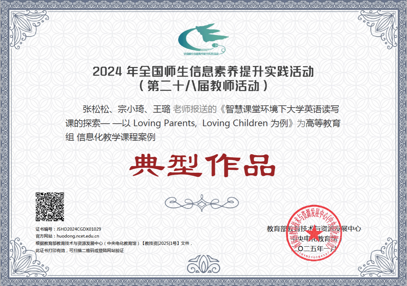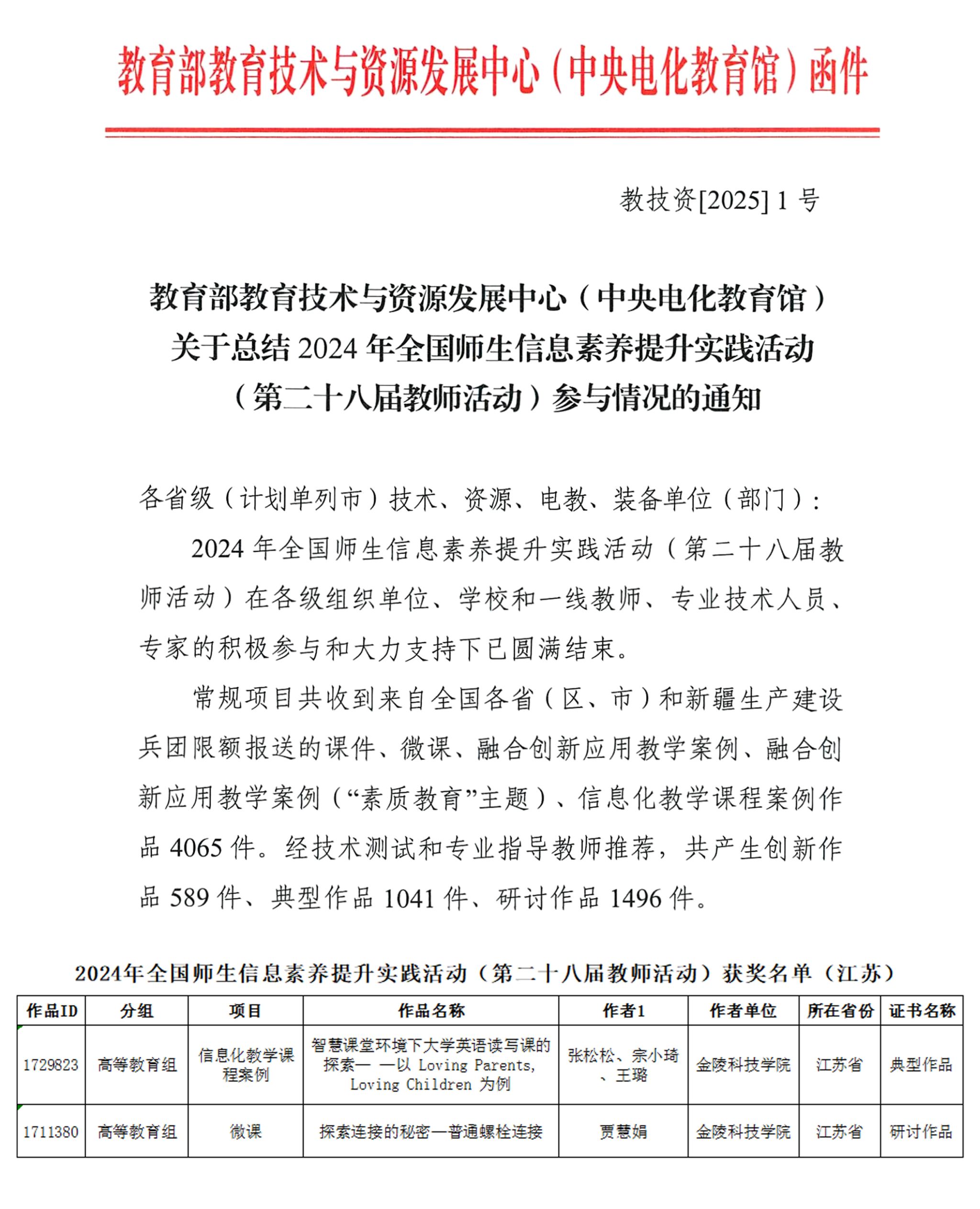 近日,教育部教育技术与资源发展中心(中央电化教育馆)发布《关于总结2024年全国师生信息素养提升实践活动(第二十八届教师活动)参与情况的通知》(教技资〔2025〕1号),我校两项作品在活动中荣获佳绩,《智慧课堂环境下大学英语读写课的探索——以Loving Parents , Loving Children为例》信息化教学课程案例被评为“典型作品”,《探索连接的秘密—普通螺栓连接》微课被评为“研讨作品”。