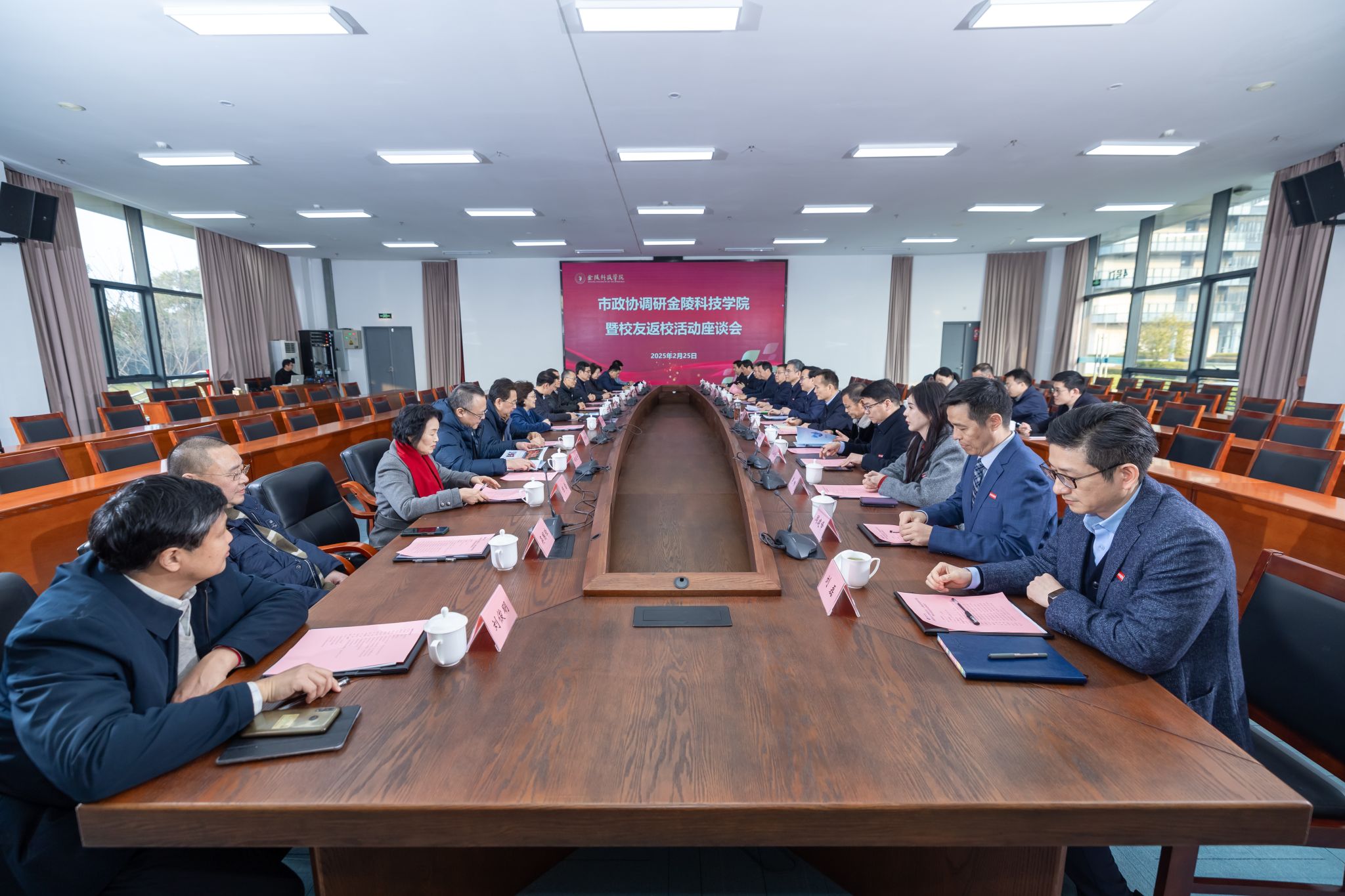 2月25日下午,南京市政协来校调研指导暨校友返校座谈会在江宁校区举行。市政协党组副书记、副主席吴卫国,西部战区陆军政治工作部原少将副主任、1982级文法专业校友丁爱国,市政协原副主席朱晓琳,市政府原秘书长、1981级财税专业校友翁国玖,市政协原秘书长、1980级中文专业校友彭振宁,市政协原党组成员、1980级中文专业校友朱志宏,市政协副秘书长、1981级财税专业校友钱建宁,市政协副秘书长、1982级文法专业校友丁璇,市人大原副秘书长、1980级城建专业校友陈雷,市人大原副秘书长、1981级法律专业校友周樱,市政协研究室原主任、1982级中文专业校友吴国璋,玄武区政协原主席、1980级中文专业校友邱小凡,市政协委员工作委员会主任刘俊明,我校党委书记刘志远、副校长高永祥、副校长王延光以及相关职能部门和二级学院主要负责人参加活动。座谈会由校长刘永彪主持。