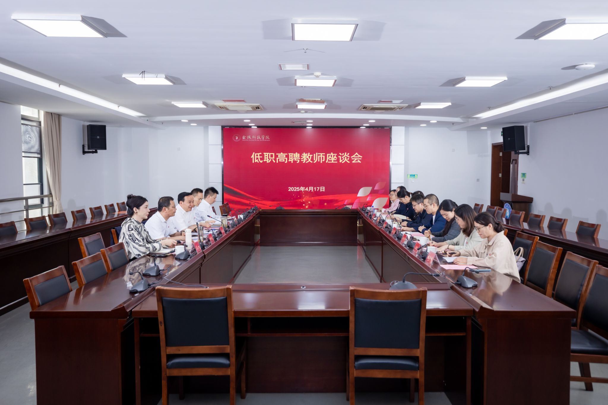 4月17日下午,我校在江宁校区图书馆第一报告厅召开低职高聘教师座谈会。校长刘永彪主持会议并讲话,副校长王延光,校长办公室、教务处、人力资源处、科技处负责人及2024年度低职高聘教师参加会议。