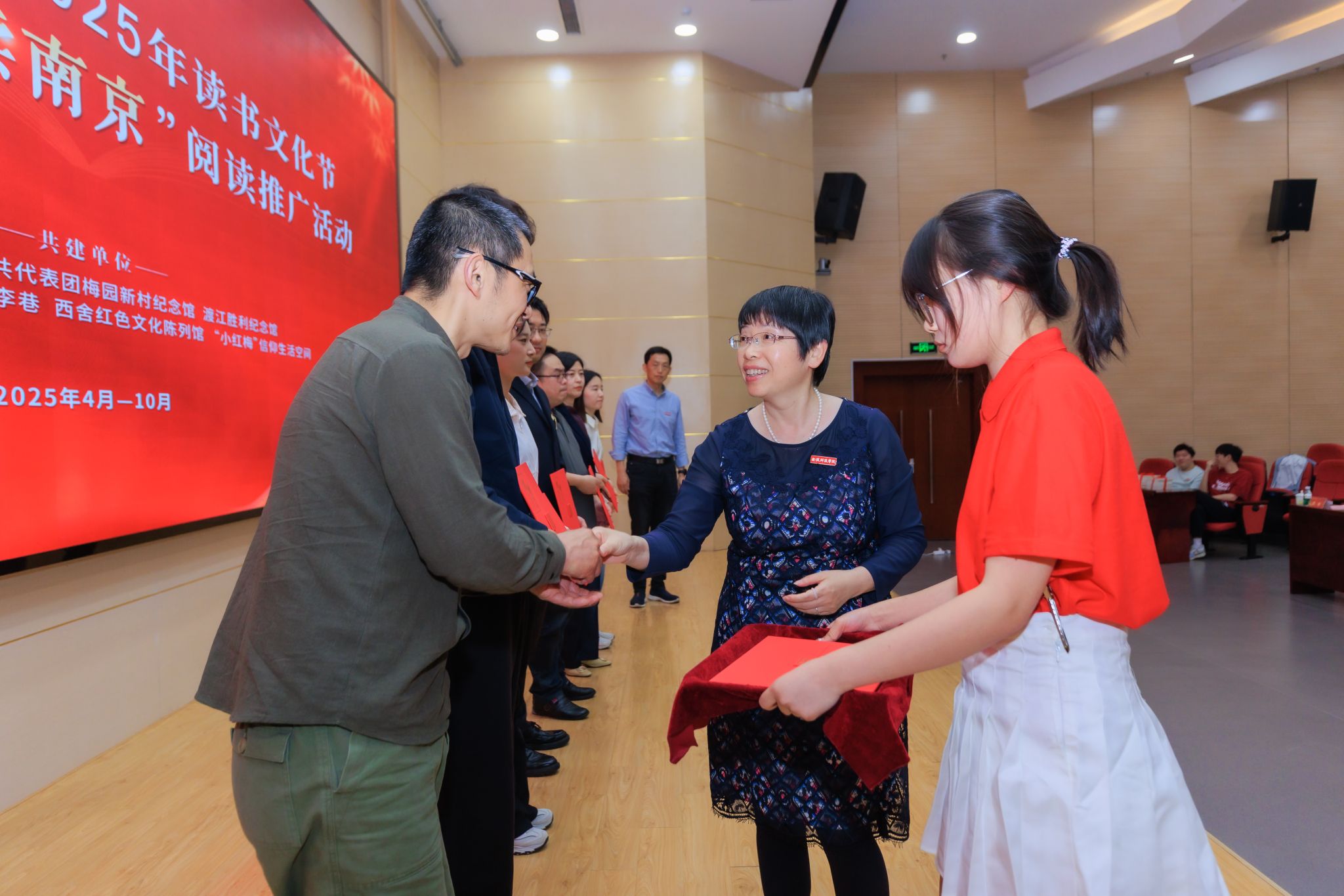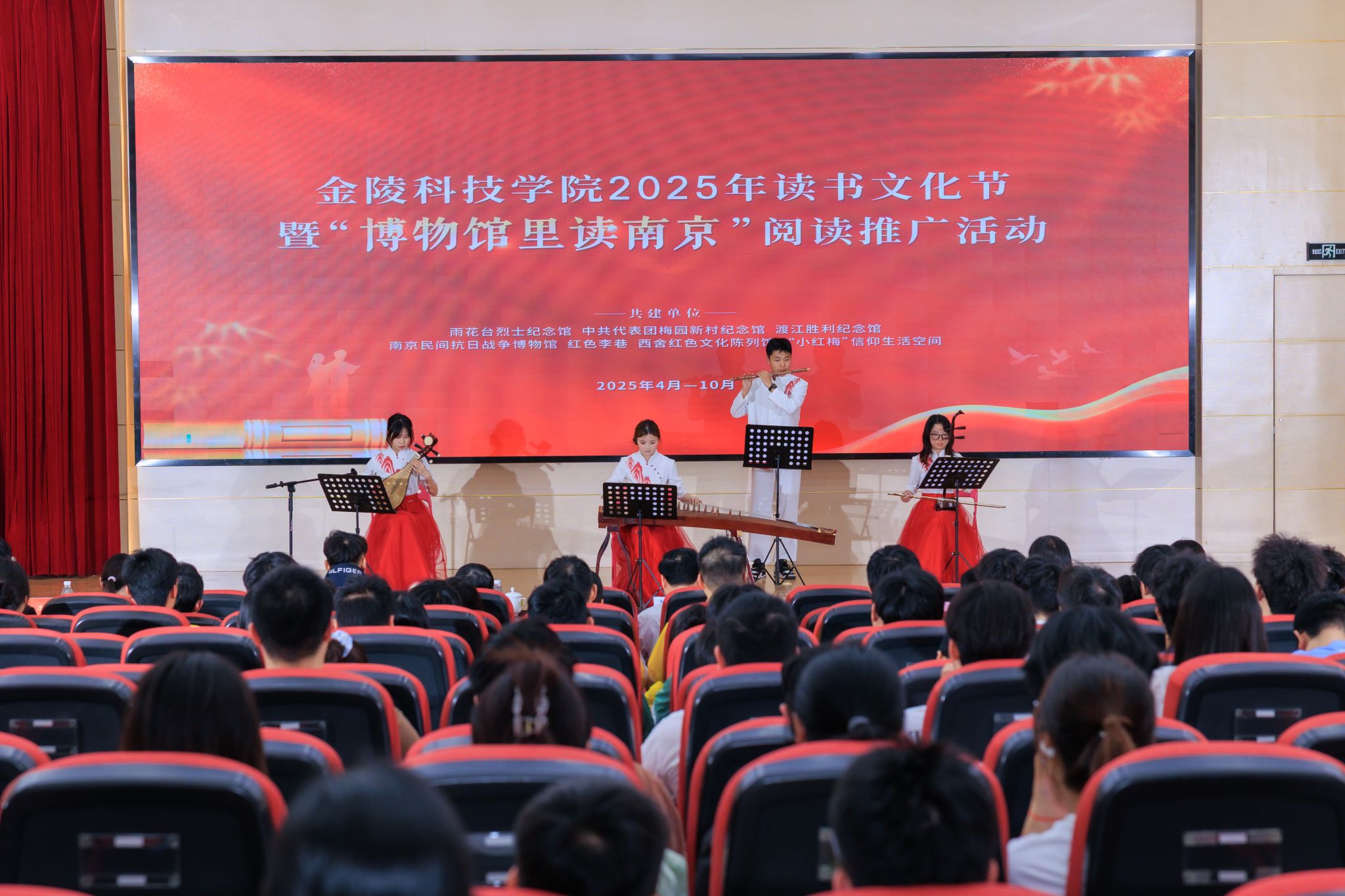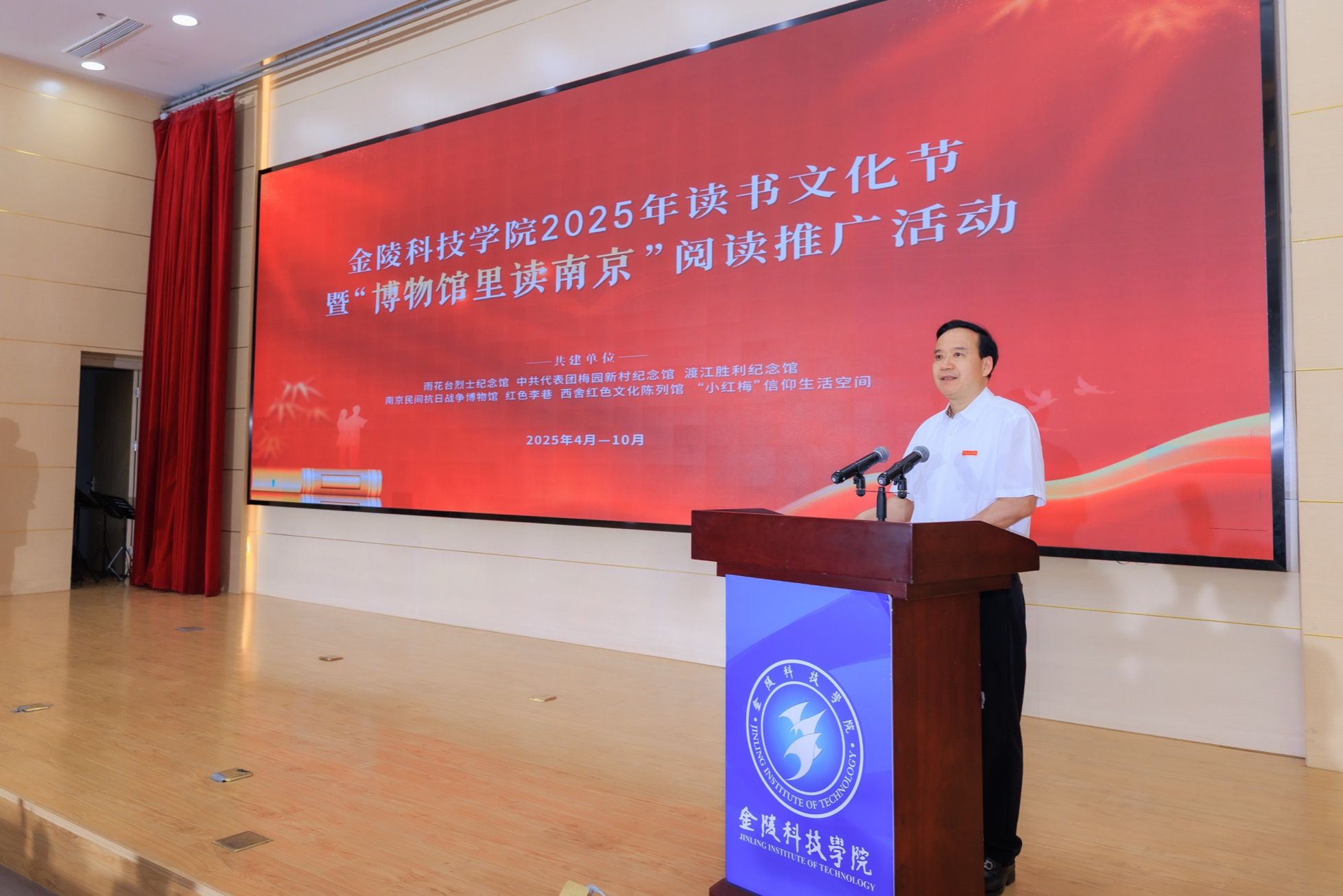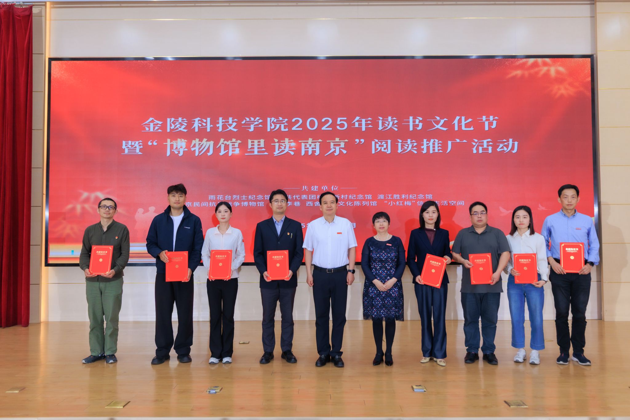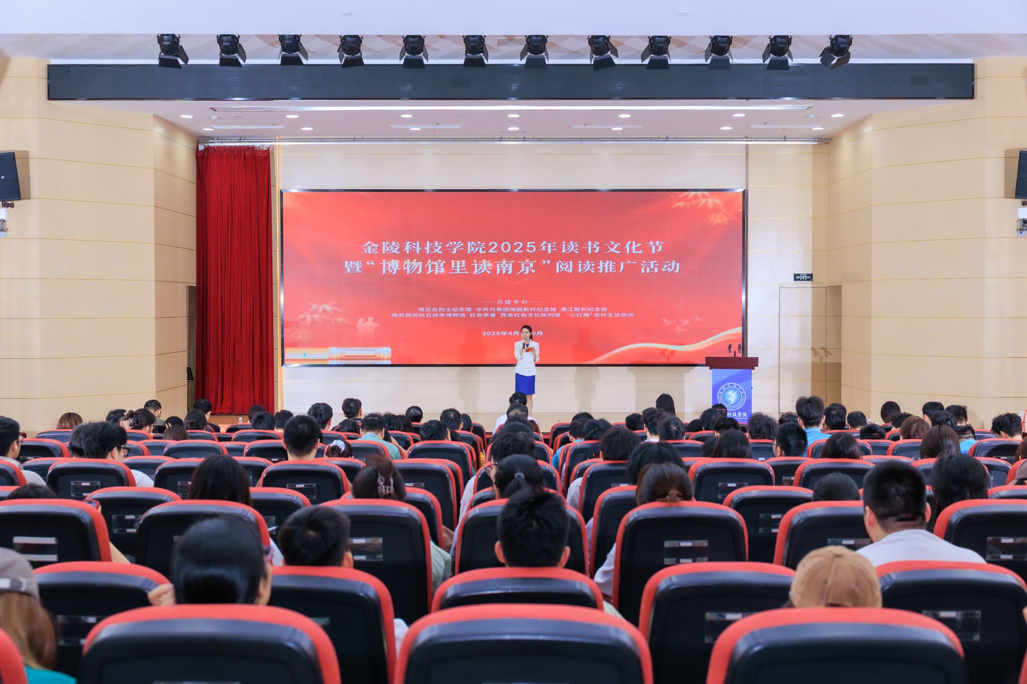 春色恰如许,读书正当时。在迎来第30个世界读书日之际,4月28日下午,我校2025年读书文化节启动暨“博物馆里读南京”阅读推广首场活动在科技楼报告厅举行。校长刘永彪教授,副校长张燕教授,南京市雨花台烈士陵园管理局、中共代表团梅园新村纪念馆、渡江胜利纪念馆、南京民间抗日战争博物馆、溧水红色李巷、西舍红色文化陈列馆、“小红梅”信仰生活空间等文博场馆代表,校长办公室、党委宣传部、学生工作处、工会、团委和马克思主义学院、机电工程学院、软件工程学院、艺术学院、园艺园林学院负责人,以及师生代表共计200余人参加活动。