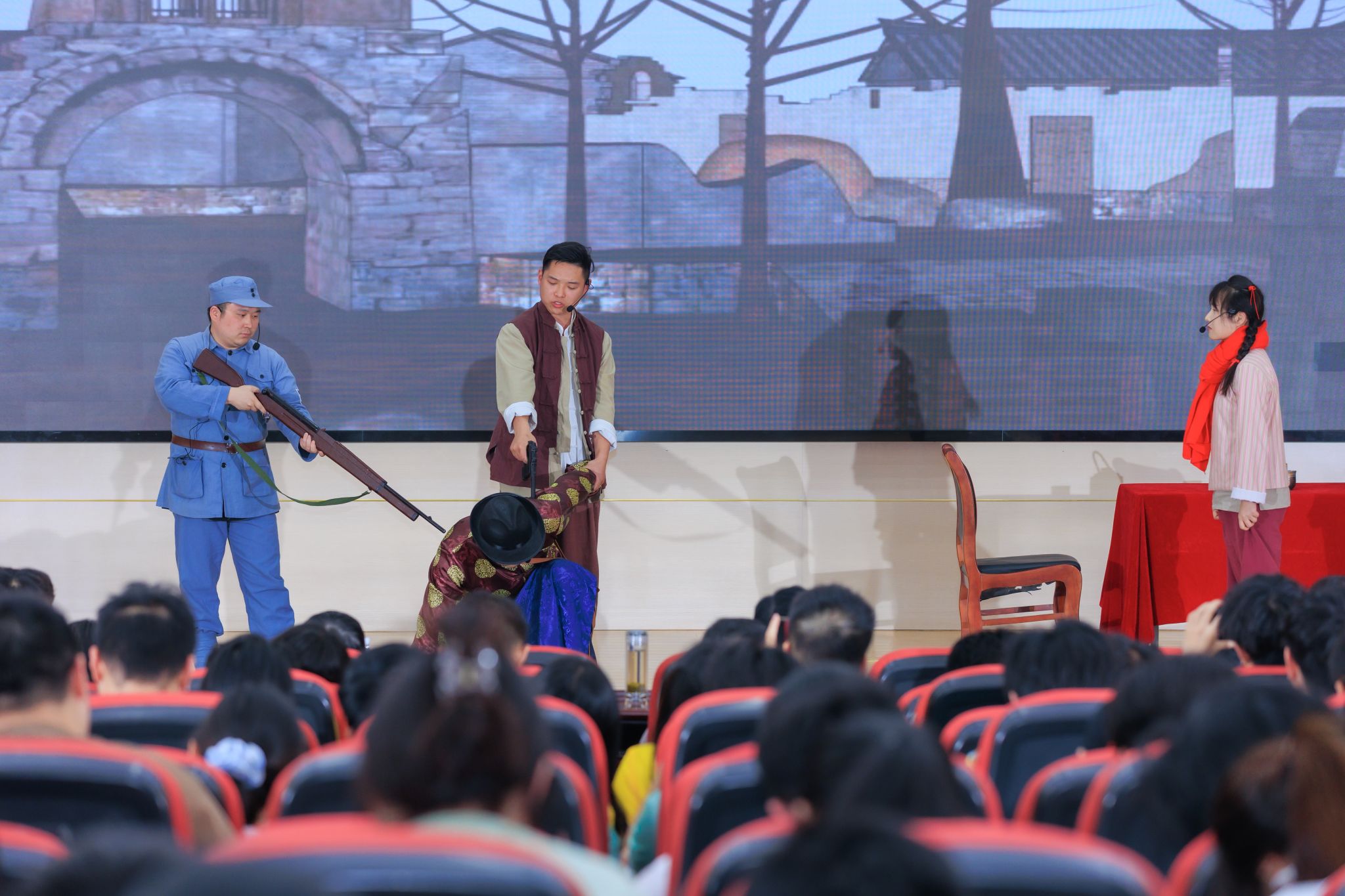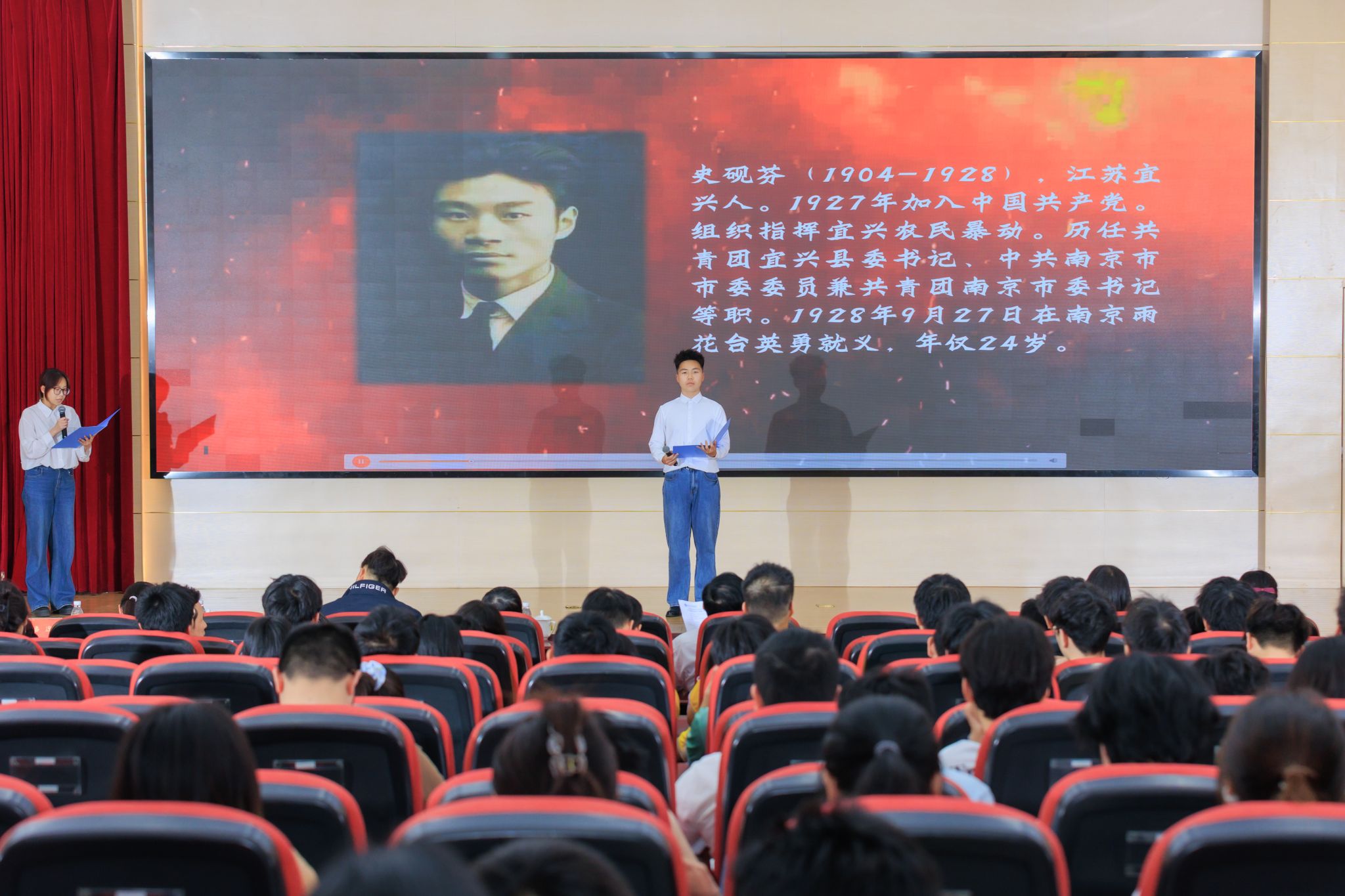 在“博物馆里读南京•致敬英雄之城”展示环节,首批共建文博场馆代表和我校师生代表通过讲述、朗诵、舞台剧等方式呈现了南京丰厚的红色基因和英雄事迹,抒发了强烈的爱党爱国之情。其中,校大学生艺术团的汪希晨、何俊德、查伊诺、邱奕宁合奏了民乐《万疆》,张思晟、丁一凡深情并茂地讲述了雨花英烈史砚芬给弟弟妹妹的一封信。渡江胜利纪念馆的陈晓阳老师讲述了《冷少农写给儿子的信》背后的故事。中共代表团梅园新村纪念馆的张怡然老师以《红绸良缘印红心》为题讲述了中共代表团的红绸贺礼这一珍贵文物。“小红梅”信仰生活空间的朱源老师以《从无字句处读书》讲述了对读懂“无字句处”的理解和建议。红色李巷的史阳、潘凤、程康、陆澄、刘启康老师带来了红色剧目《嗨,一郎》选段。