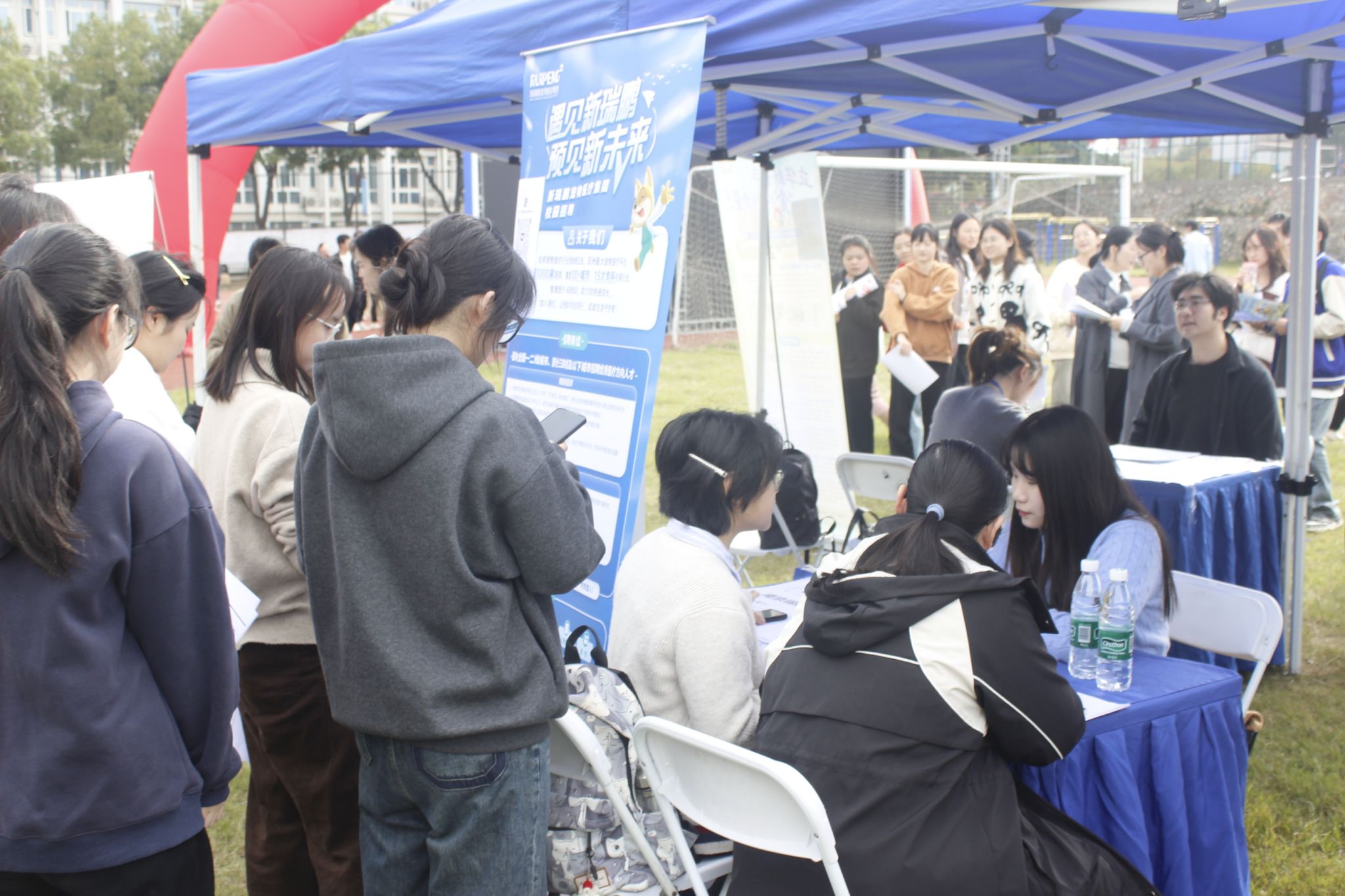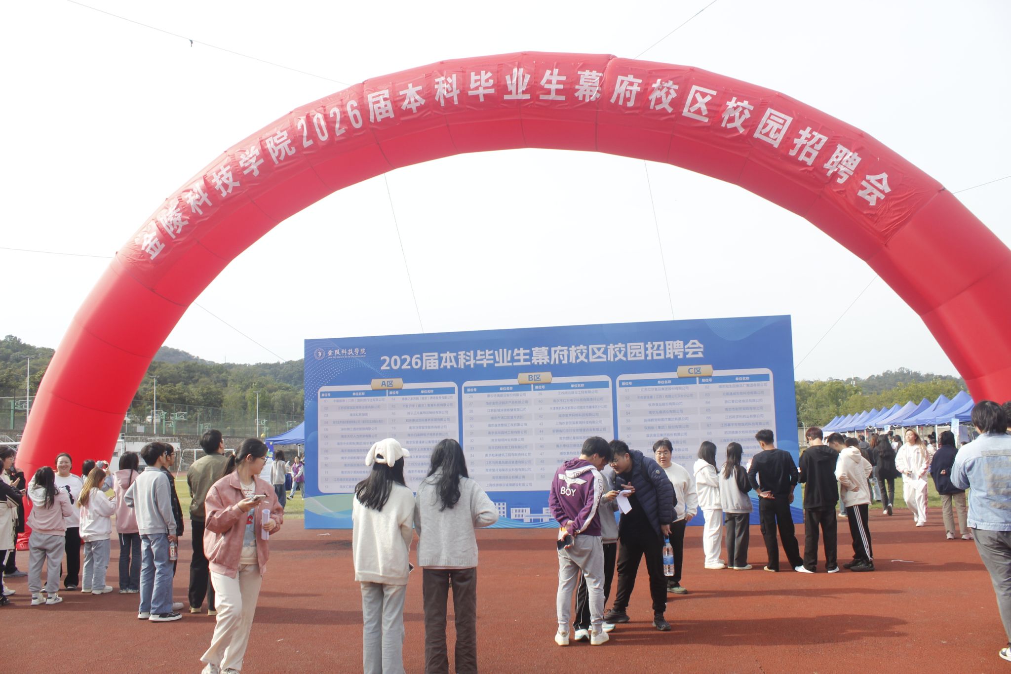 当天下午,我校在幕府校区运动场举办了“2026届本科毕业生校园招聘会——幕府校区专场”, 此次招聘会共60多家企业前来招聘,其中包括中国国旅(江苏)国际旅行社有限公司、孩子王儿童用品股份有限公司、双胞胎(集团)股份有限公司、上海棕源绿谷城镇建设有限公司、江苏立华食品集团股份有限公司、牧原食品股份有限公司等知名企业,累计提供岗位1800余个,覆盖幕府校区三个学院所有专业,为毕业生提供了丰富的就业选择。招聘会现场人头攒动,热闹非凡,求职学生络绎不绝,毕业生们携带精心准备的简历奔赴心仪企业展位,企业招聘人员耐心细致地解答求职学生的问题。据统计,此次招聘会现场企业共收到简历1300余份。