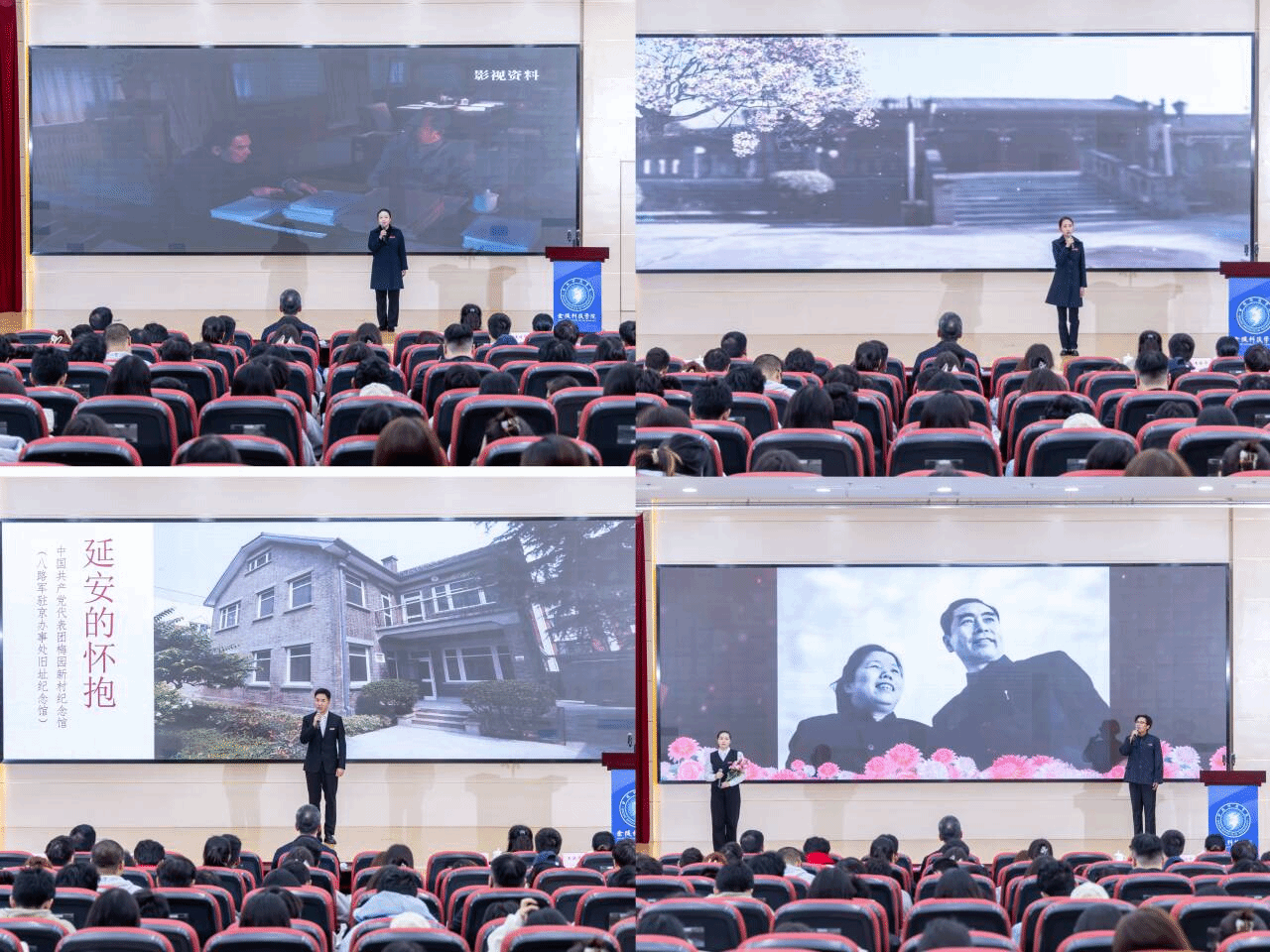 现场,学校图书馆与周恩来故居管理处、中共代表团梅园新村纪念馆签约共建“红色文化育人实践基地”,三方将围绕红色资源共享、研学活动开展、文化成果推广等深化合作。两所纪念馆向学校赠送了一批红色书籍,并带来了思政微课《周恩来“过五关”崇高风范情景故事》、党史宣讲《延安的怀抱》等节目展示,以饱含深情的讲述传递了共产党人坚守初心、廉洁奉公的精神内核。全体人员集中观看了人物纪录片《把一切献给教育》,深切体悟我校前身之一——金陵职业大学首位校长朱刚“坚守初心、潜心育人”的奉献情怀,进一步筑牢“廉洁从教、廉洁修身”的思想根基与责任意识。校大学生艺术团成员深情朗诵《海棠花祭》,用饱含敬意的语调追忆周恩来同志的高尚品格与家国情怀。