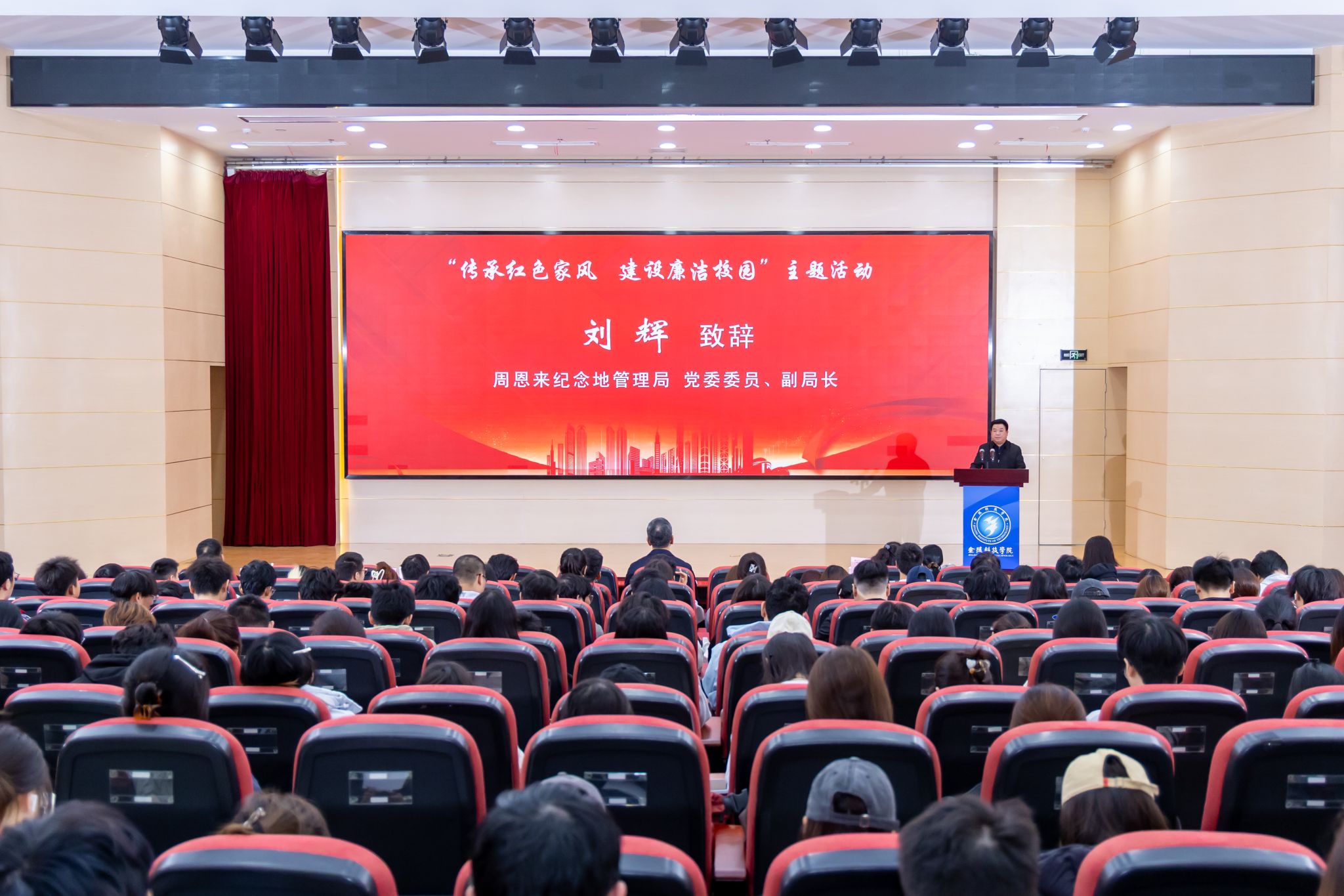 主会场活动在科技楼报告厅举行,刘志远致辞。他指出,本次与周恩来故居管理处、中共代表团梅园新村纪念馆开展“红色文化育人实践基地”共建,是学校推进“传承红色家风 建设廉洁校园”主题活动的重要举措,也是我校落实立德树人根本任务、创新思想政治教育模式的积极探索。他强调,周恩来的红色家风和崇高风范是中华民族的宝贵精神财富,对于加强校园廉洁文化建设、引导师生树立正确的价值观具有深远意义。学校将依托两所纪念馆所承载的丰富史料,开展形式多样的红色教育活动,将红色故事转化为“鲜活课堂”,紧扣立德树人根本任务,持续提升思政教育的引领力和渗透力。他希望,三方合作能够以基地建设为纽带,通过师生走进纪念馆、馆内专家进校园、开发红色校本课程等一系列活动,让红色文化深度融入校园生活。最后,刘志远希望全体师生珍视此次学习机会,自觉从伟人的精神风范中汲取奋进力量,将红色基因内化于心、外化于行,共同传承和弘扬廉洁文化。