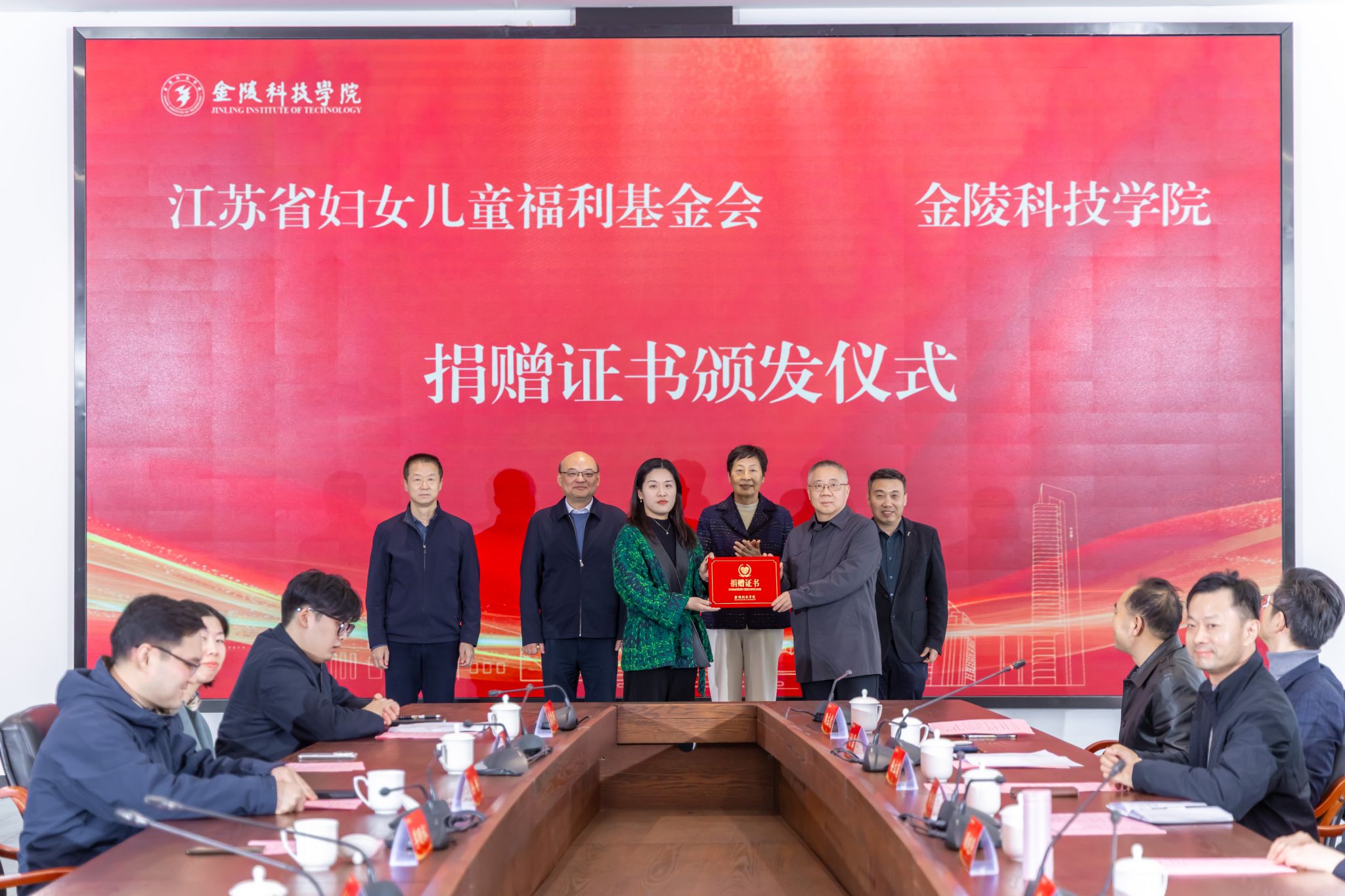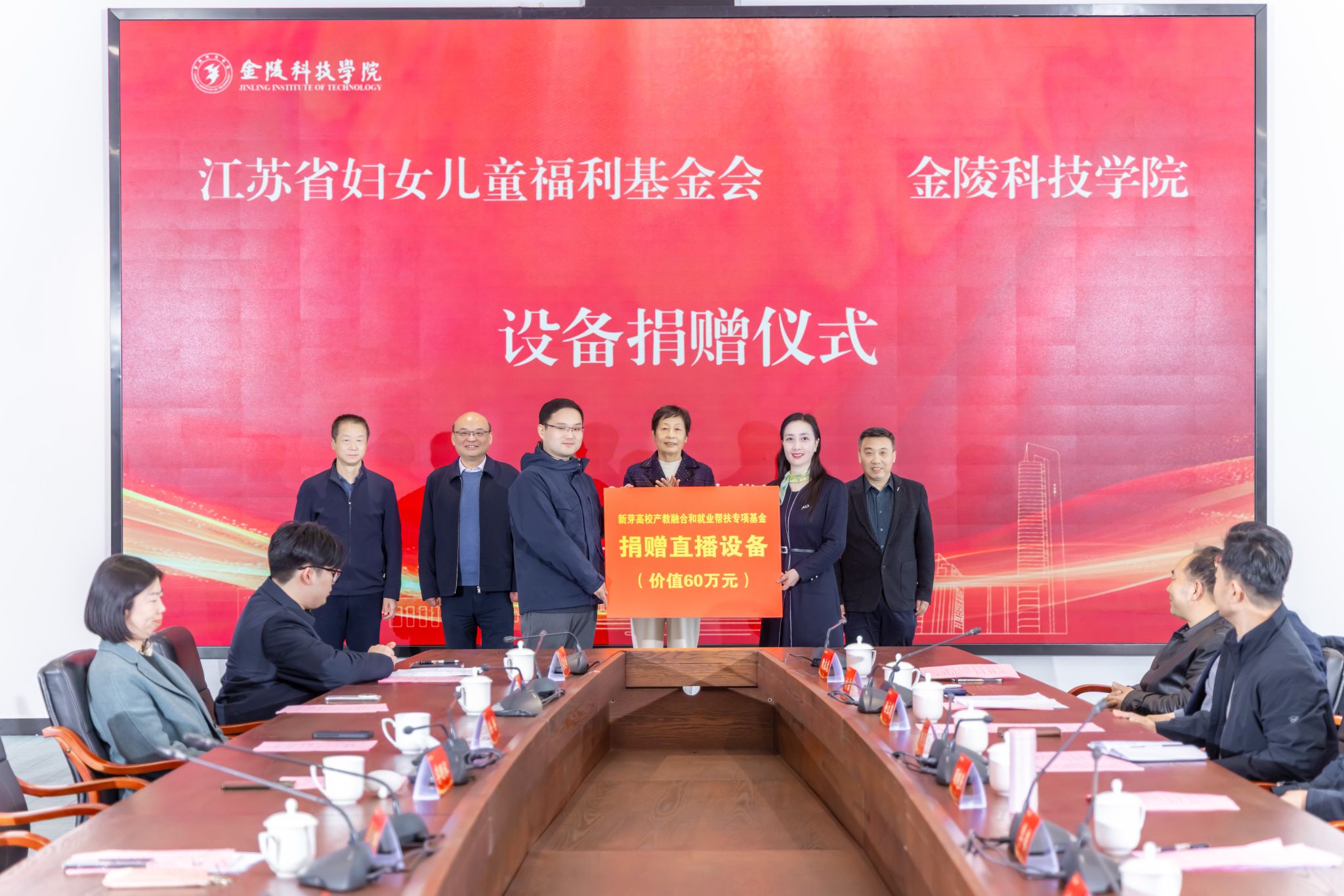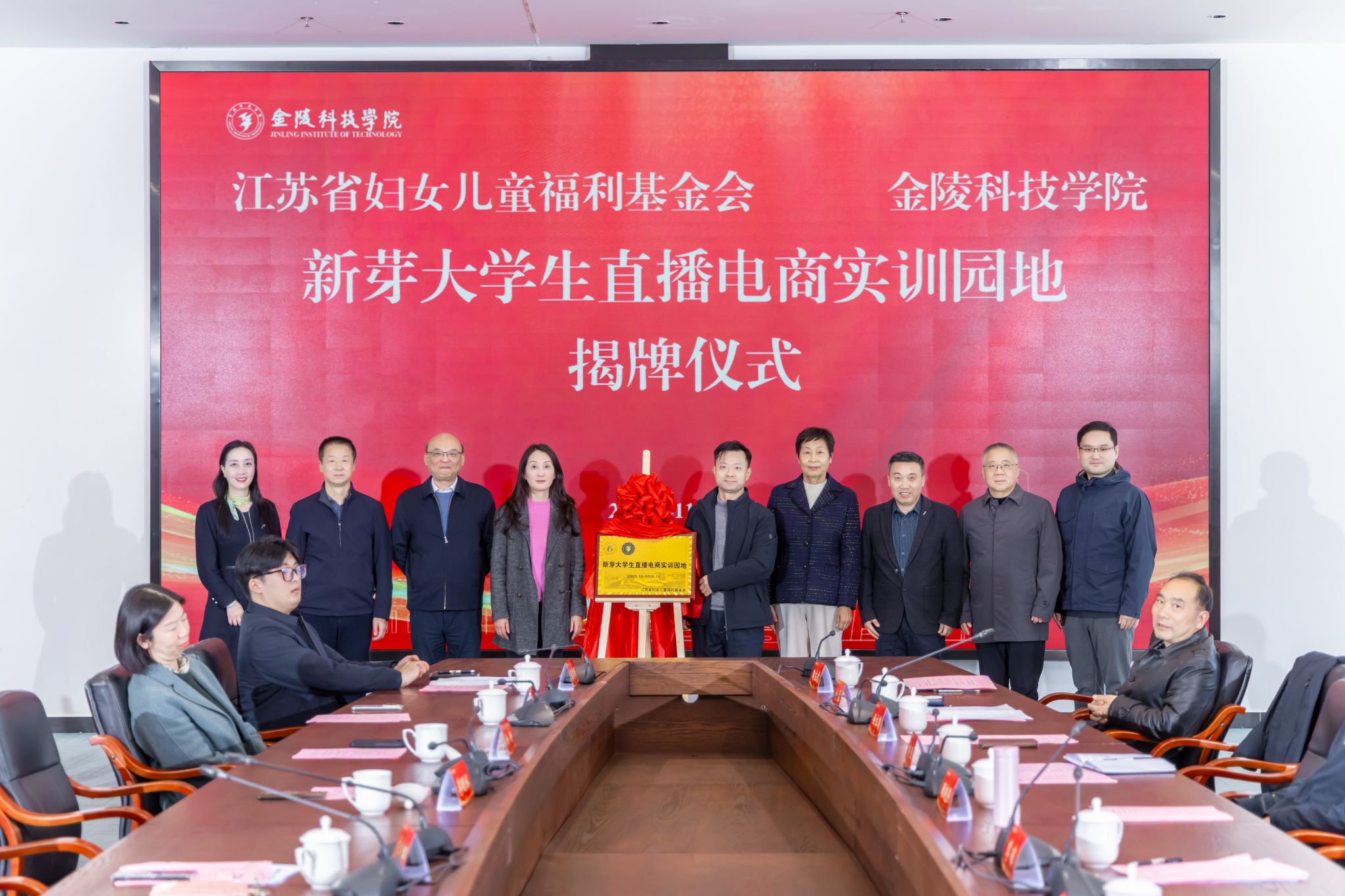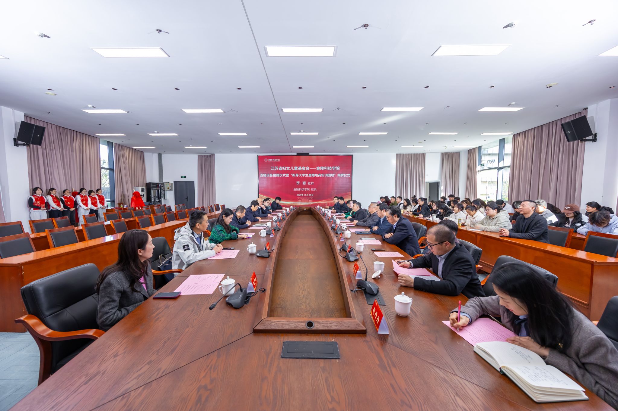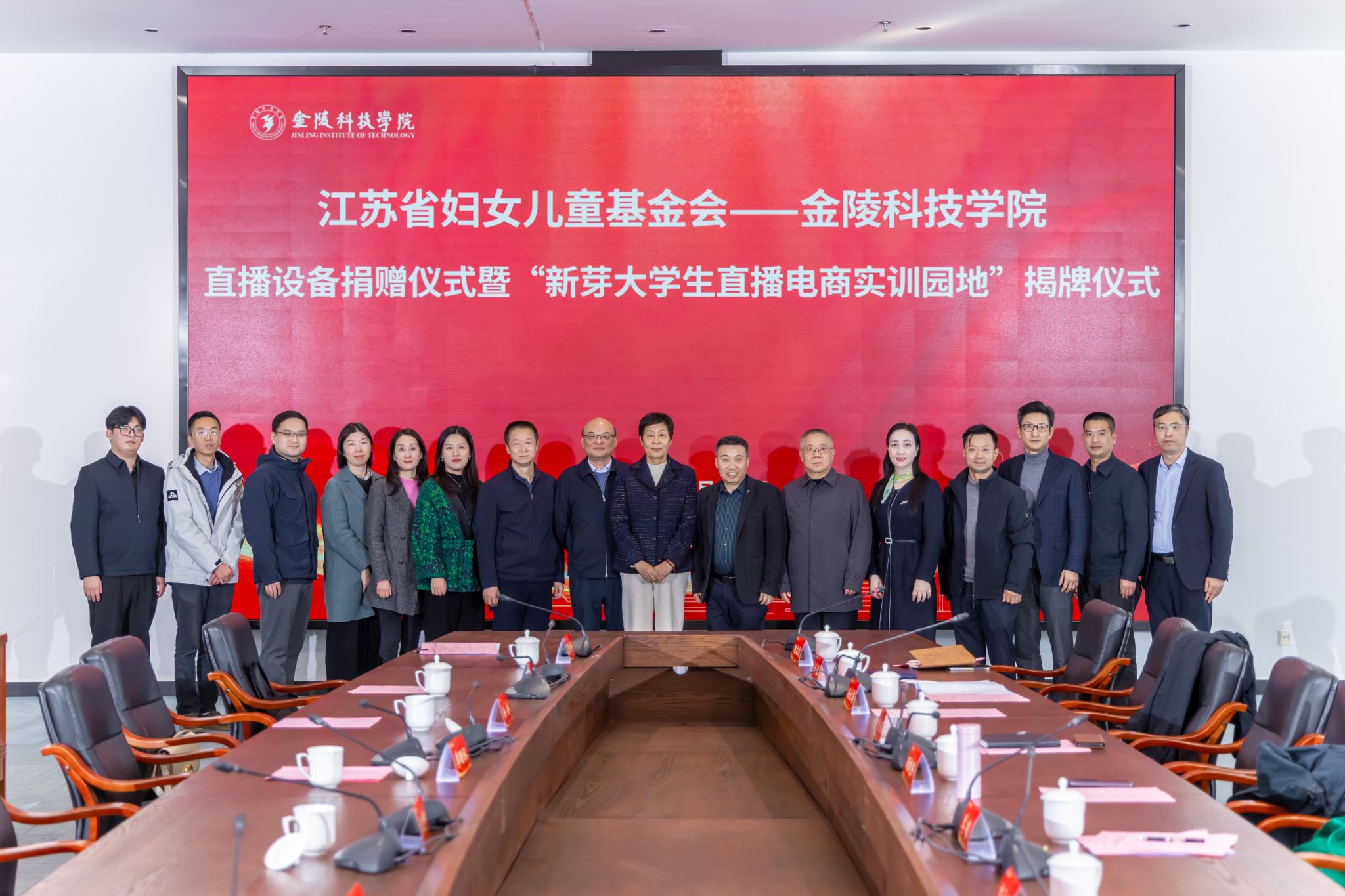 11月25日下午,我校与江苏省妇女儿童福利基金会在3号科技楼110会议室举行直播设备捐赠暨“新芽大学生直播电商实训园地”揭牌仪式。江苏省妇女儿童福利基金会副理事长宋晓辉,南京市农业农村局副局长李明水,南京市人社局一级调研员吴传军,我校校长季赛、副校长高永祥、副校长顾晓燕以及合作与发展规划处、教育发展基金会、招生与就业指导处、教务处、商学院相关负责人出席活动。仪式由商学院院长刘磊主持。
