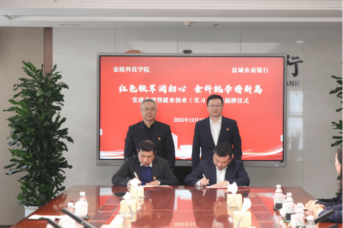盐城农商银行党委书记、董事长许闯与校党委常委、副校长高永祥共同为就业创业(实习)基地揭牌