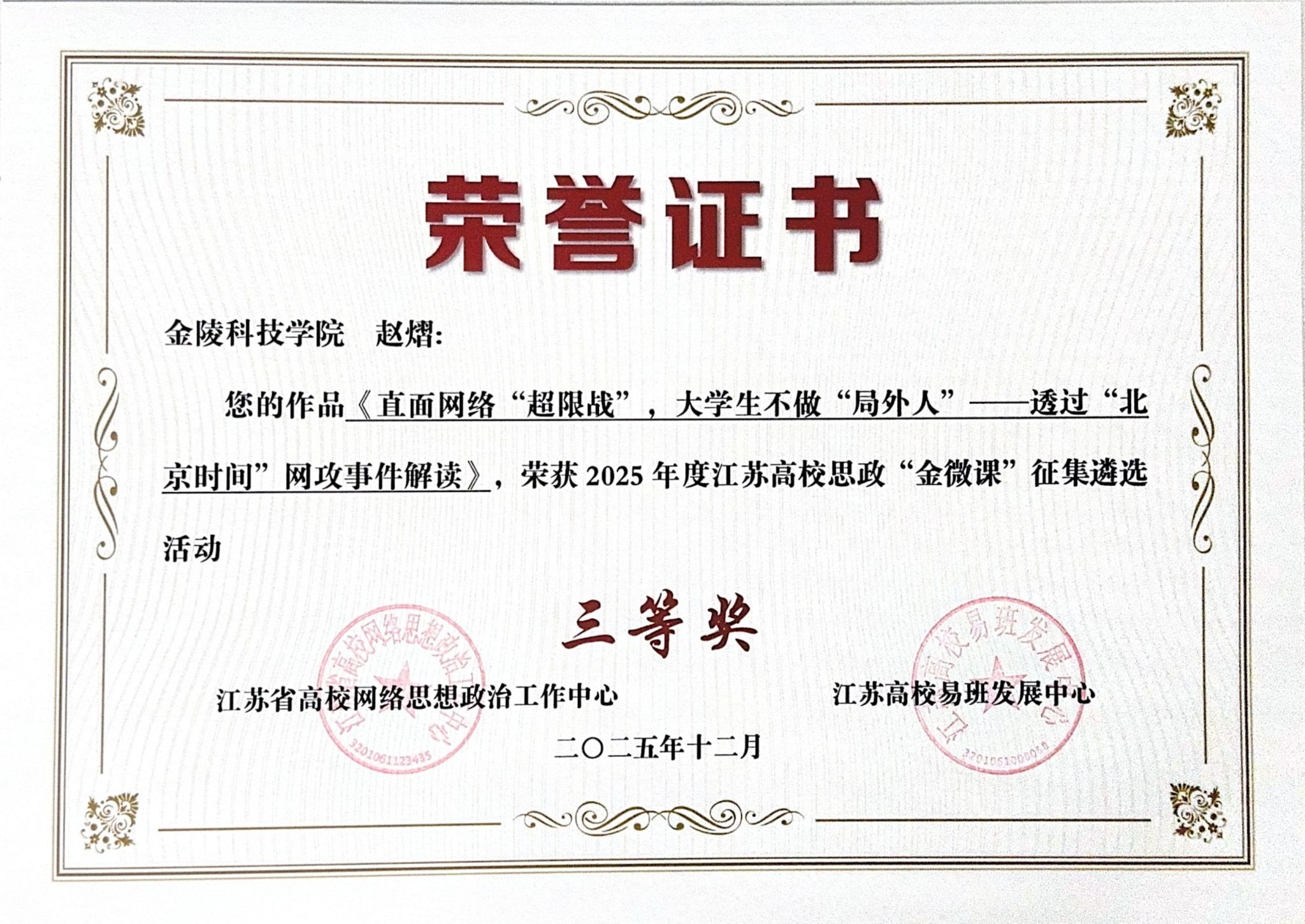 近日,2025年度江苏高校思政“金微课”征集遴选活动获奖名单揭晓,我校网络思想政治工作中心选送的两项作品获三等奖。网络育人名师“熠熠生辉”工作室负责人、学生工作处赵熠的《直面网络“超限战”,大学生不做“局外人”——透过“北京时间”网攻事件解读》获国家安全教育类三等奖,崇文工作室成员、人文学院高欢欢的《从指尖到心间:照亮我们共同的网络家园》获网络思想政治教育类三等奖。这是我校连续第二年在此项省级赛事中获奖,彰显了学校网络思政育人的扎实成效。