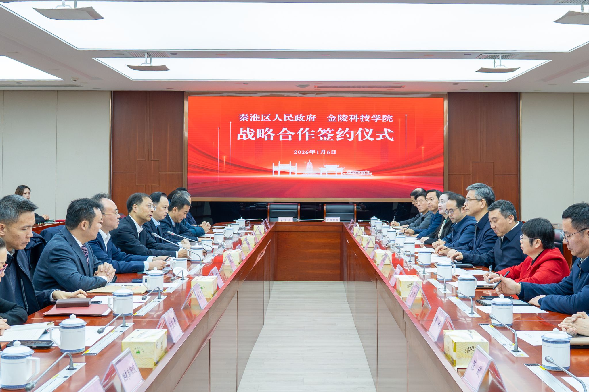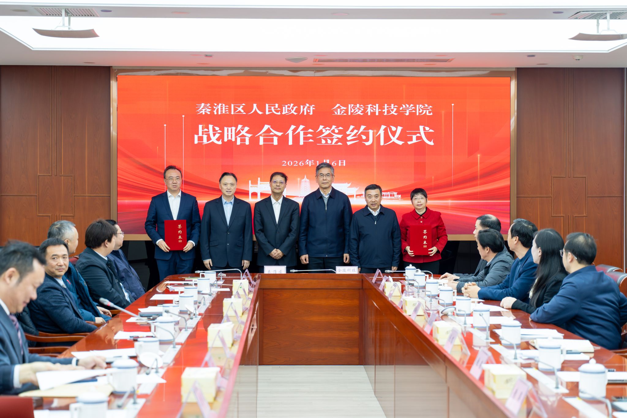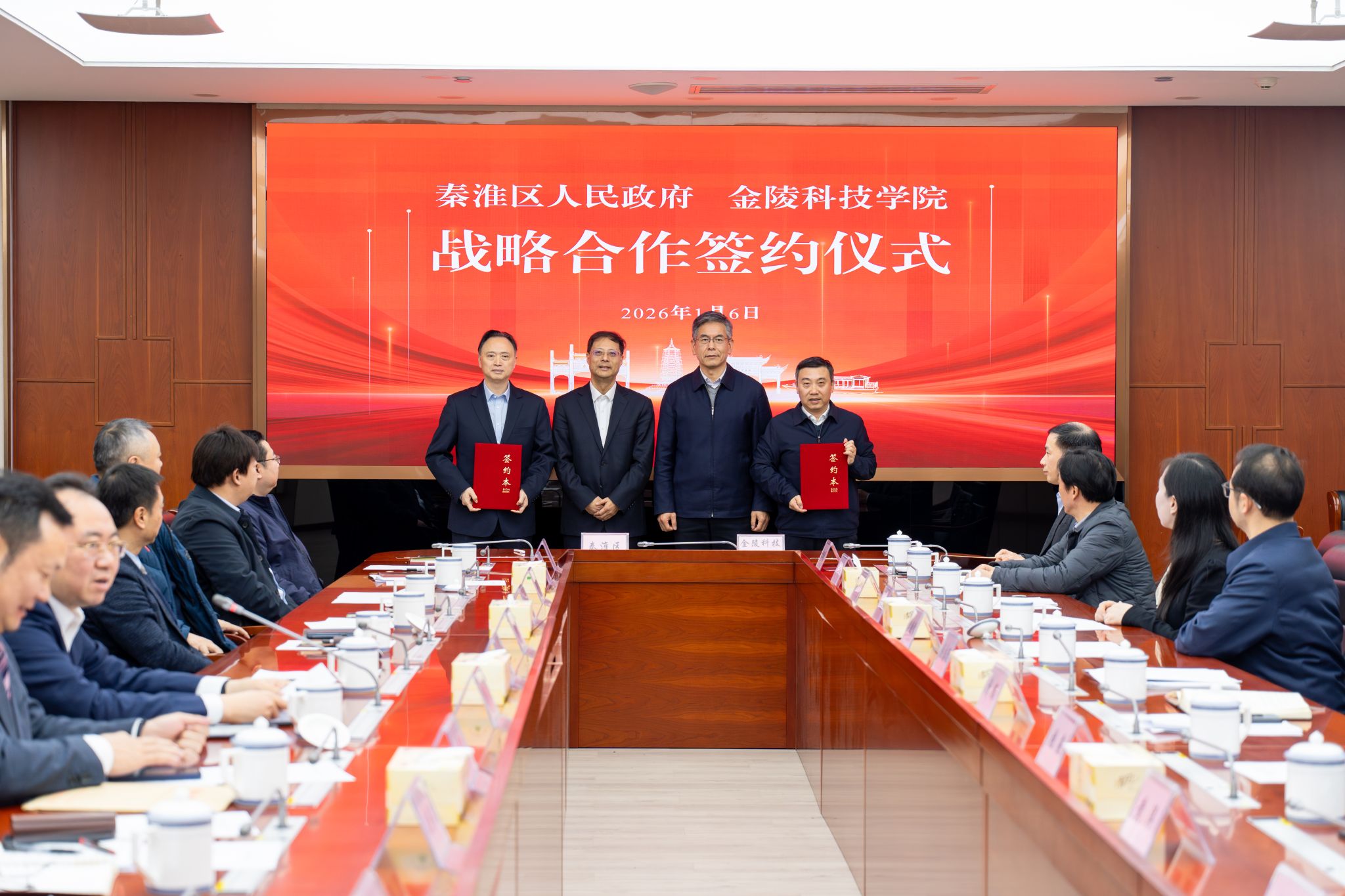 1月6日上午,我校与秦淮区人民政府签署战略合作协议。秦淮区委书记王生,区委副书记、区长凌向前,区委常委、副区长傅浩,白下高新区党工委书记蔡嘉,白下高新区主任金界春,我校党委书记刘志远,校长季赛,党委副书记单晓峰,副校长张燕,党委常委、副校长顾晓燕出席签约仪式。活动由傅浩主持。