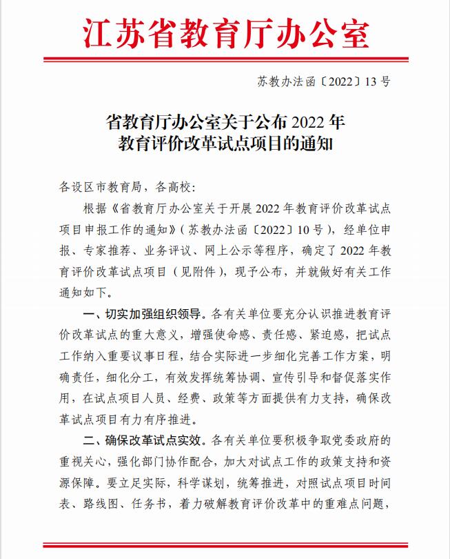 江苏省教育厅立项的教育评价改革试点项目主要围绕《深化新时代教育评价改革总体方案》《江苏省深化新时代教育评价改革实施方案》等文件要求,通过改革试点示范推动改革任务落实落地。近年来,我校认真学习贯彻习近平总书记关于教育的重要论述精神和全国教育大会精神,落实立德树人根本任务,遵循教育规律,坚持改革创新,树立科学成才观念,稳步推进学校教育评价改革工作。
