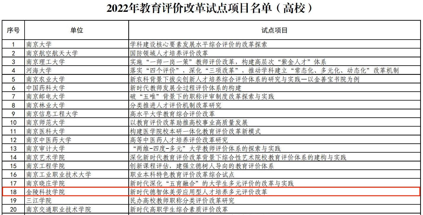 近日,江苏省教育厅发布《省教育厅办公室关于公布2022 年教育评价改革试点项目的通知》(苏教办法函〔2022〕13号),我校申报的《新时代德智体美劳应用型人才培养多元评价改革》获批立项。本次教育评价改革试点项目共计立项96项,其中设区市试点项目38项、高校试点项目58项。