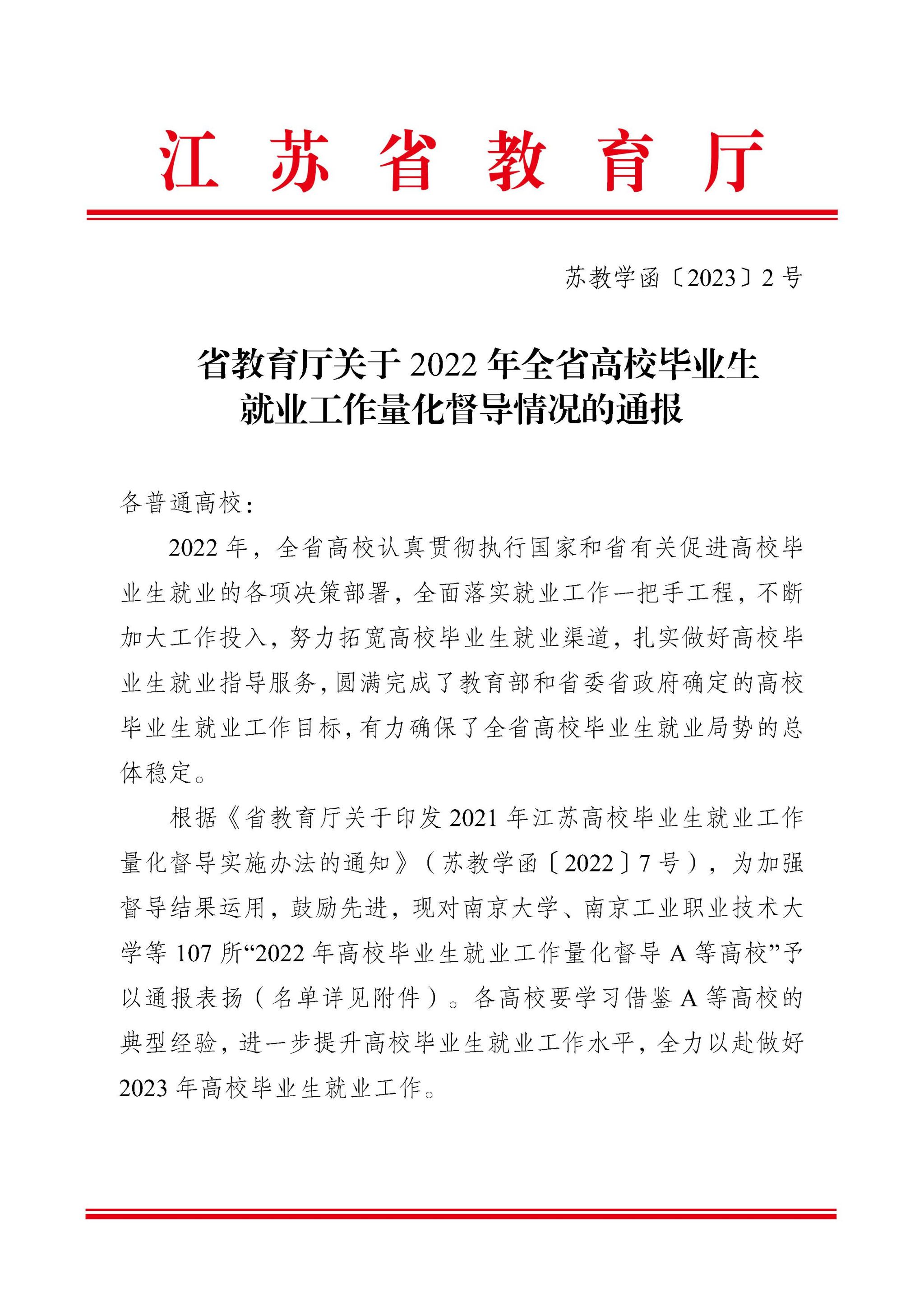 近日,江苏省教育厅通报了2022年全省高校毕业生就业工作量化督导情况,经督导考核,我校与南京大学等高校一起获评“2022年江苏省高校毕业生就业工作量化督导A等高校”,这是学校毕业生就业工作连续第三年荣获此殊荣。