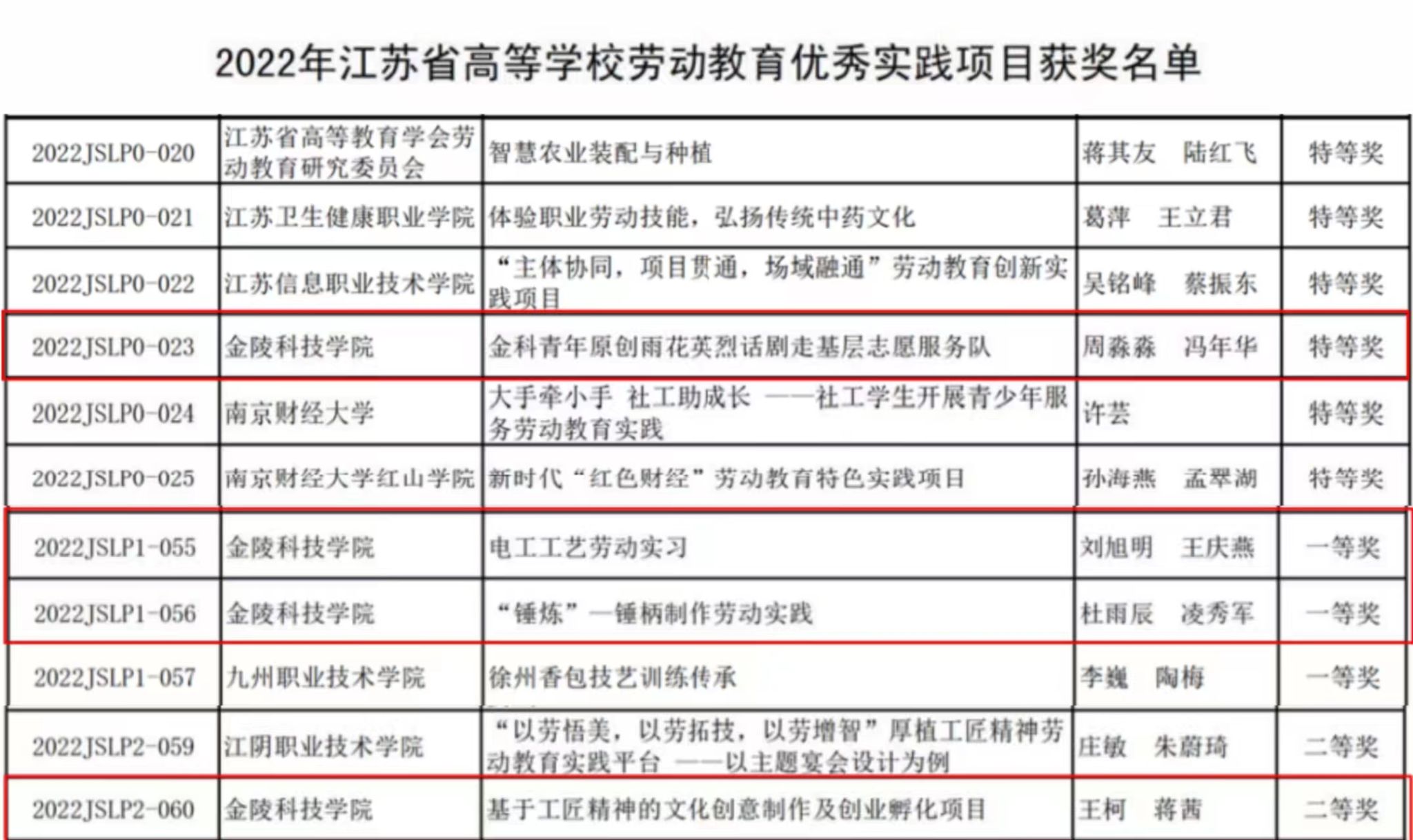 根据《关于公布2022年江苏省高等学校劳动教育优秀实践项目评选结果的通知》(苏高教会﹝2023﹞5号)文件,我校择优报送的4个项目全部获奖,其中特等奖1个、一等奖2个、二等奖1个。由于项目评选组织规范、成绩优异,学校同时被授予“优秀组织奖”。
