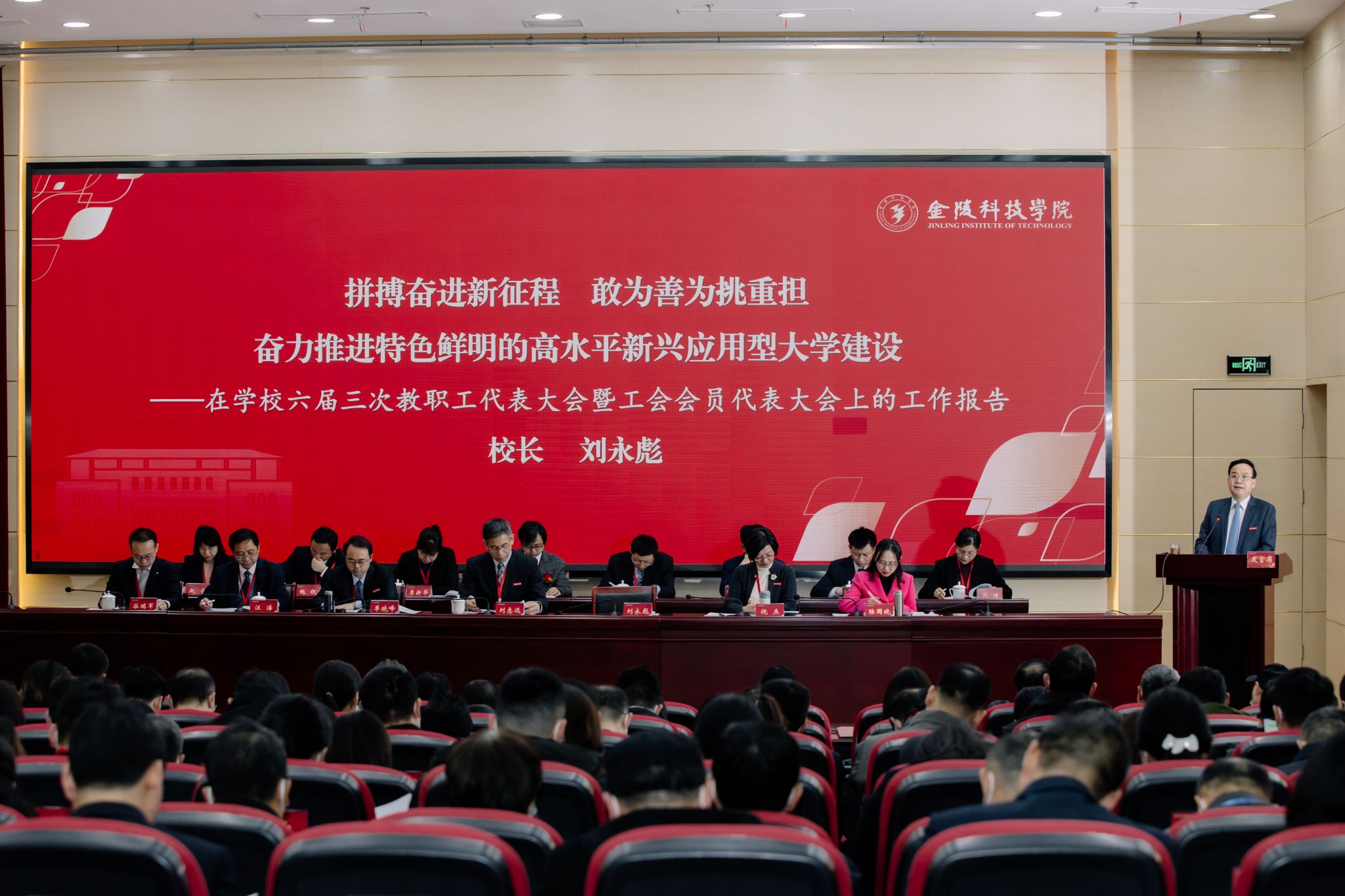 刘永彪代表学校向大会作了题为《拼搏奋进新征程 敢为善为挑重担 奋力推进特色鲜明的高水平新兴应用型大学建设》的工作报告。报告指出,2022年是学校新发展阶段实现跨越发展的关键之年,学校坚持以习近平新时代中国特色社会主义思想为指导,认真落实中央、省市决策部署,紧扣“两全”主题,坚持“两建”目标,深化“两化”战略,不断加强内涵建设,学校事业高质量发展取得新的成效。