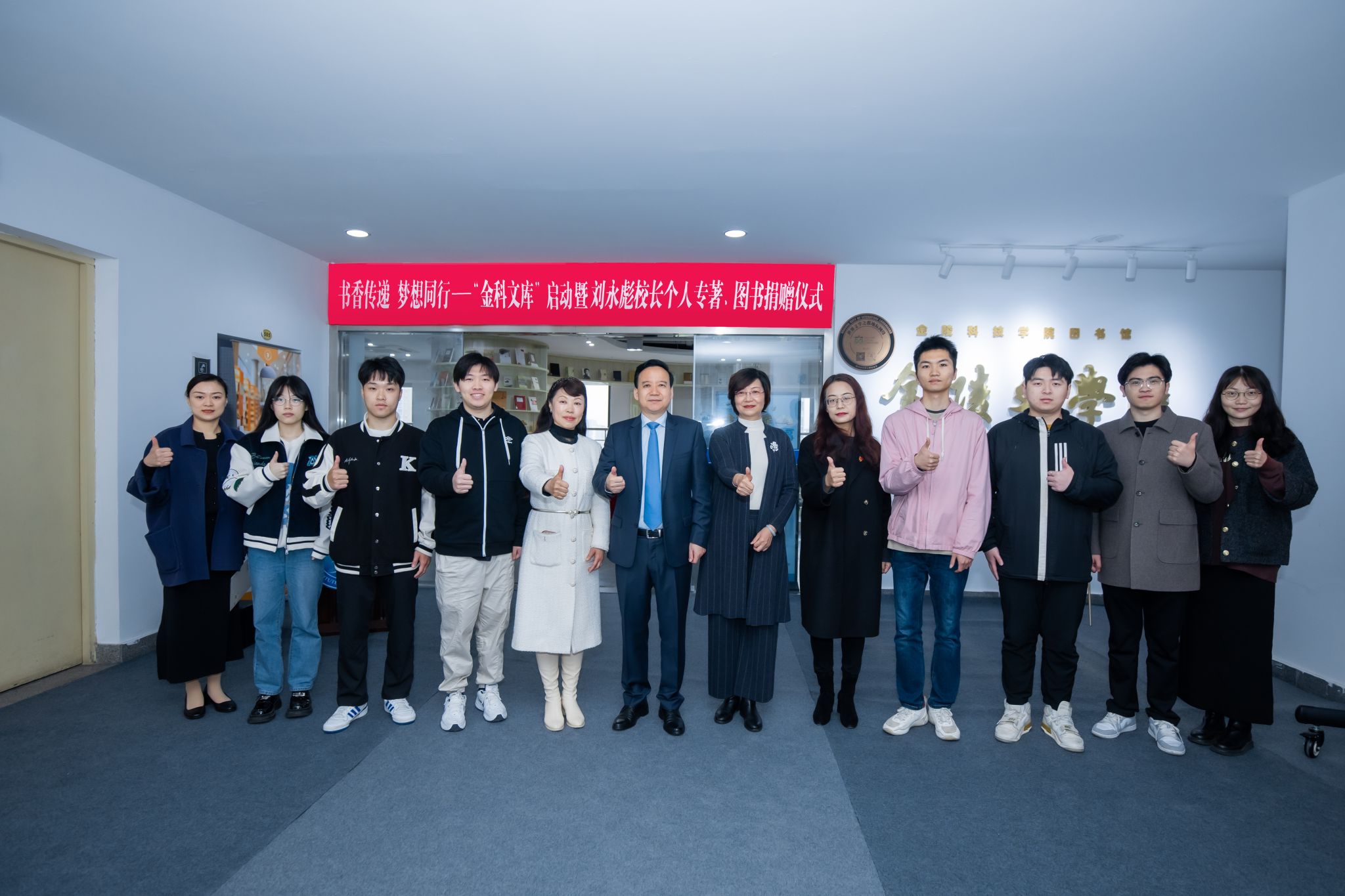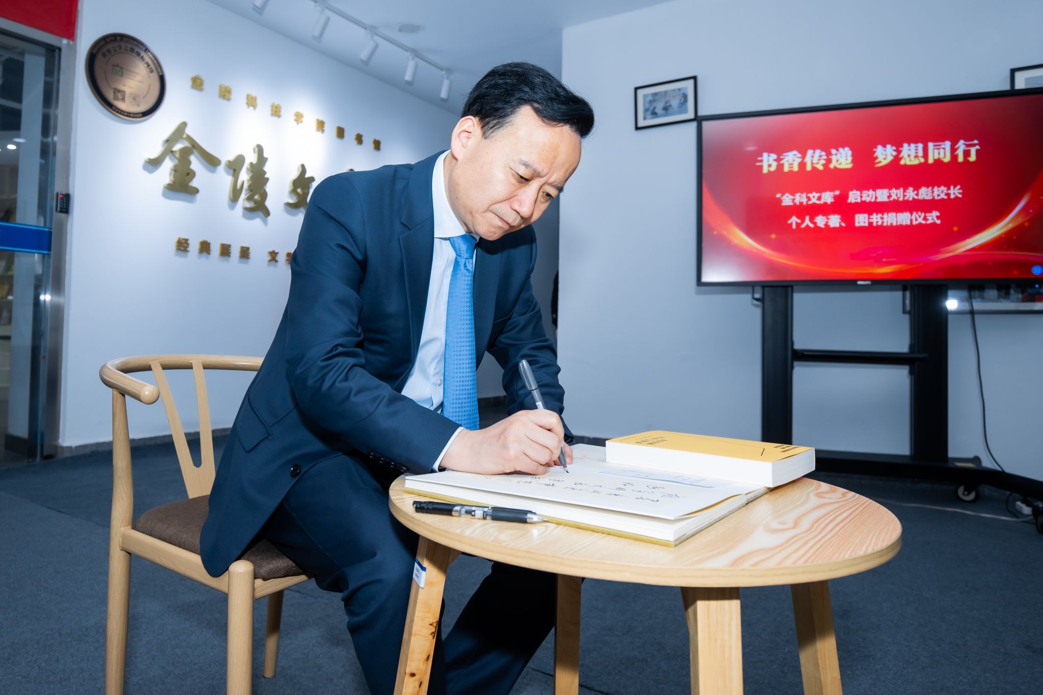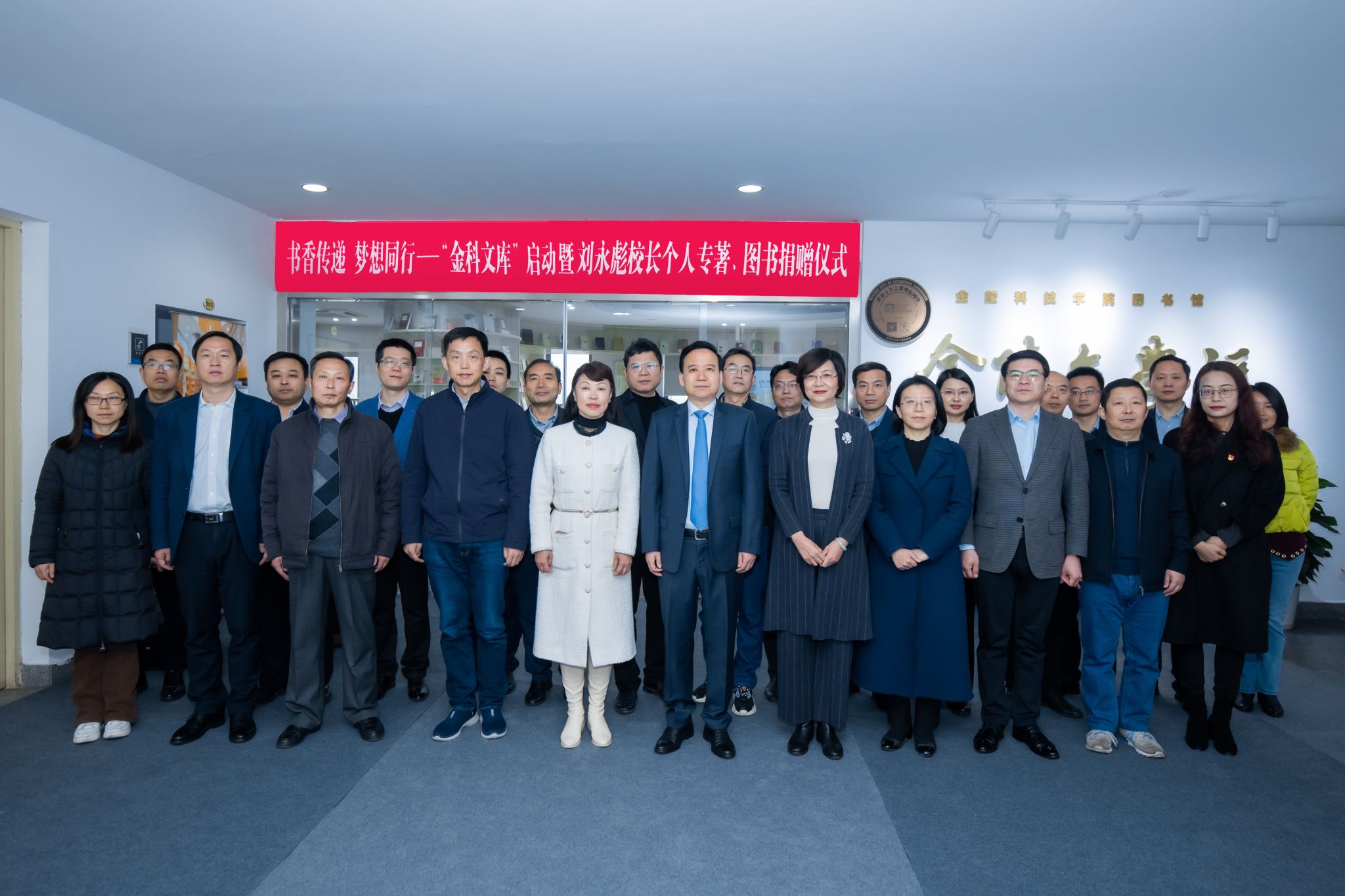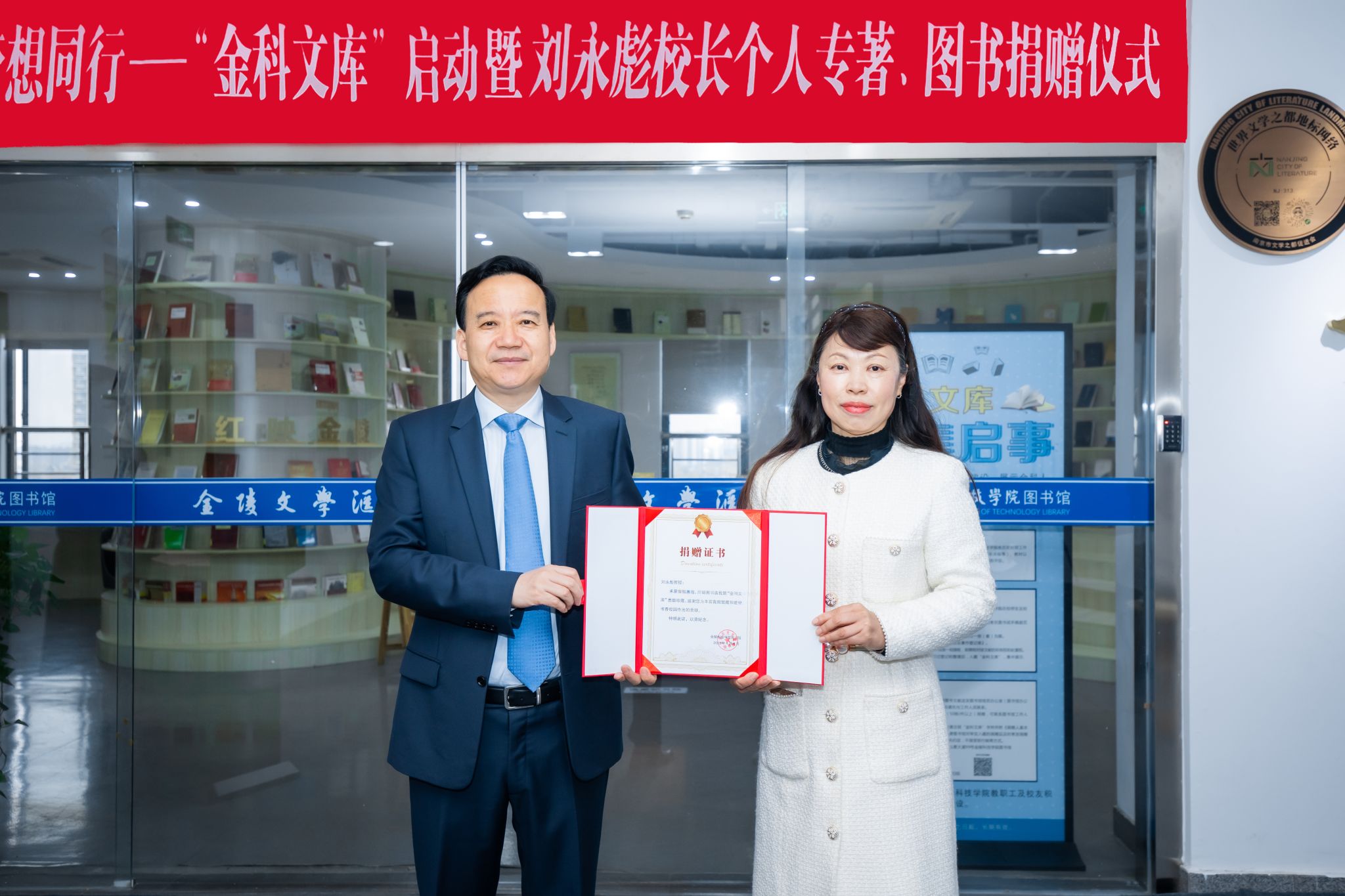 启动仪式后,学校举行了刘永彪校长个人专著、图书捐赠仪式。刘永彪率先向“金科文库”捐赠了个人学术专著以及珍藏的图书文献,图书馆馆长唐亦玲接受了捐赠,并代表图书馆向刘永彪颁发了捐赠证书。此前,刘永彪率先示范,已多次向图书馆捐赠个人专著及珍藏的图书,身体力行地关注和支持图书馆“金科文库”的建设。他捐赠的图书涵盖了政治、经济、管理、文艺等类别,包括其近年来的重要研究成果,具有收藏与阅读推广价值。