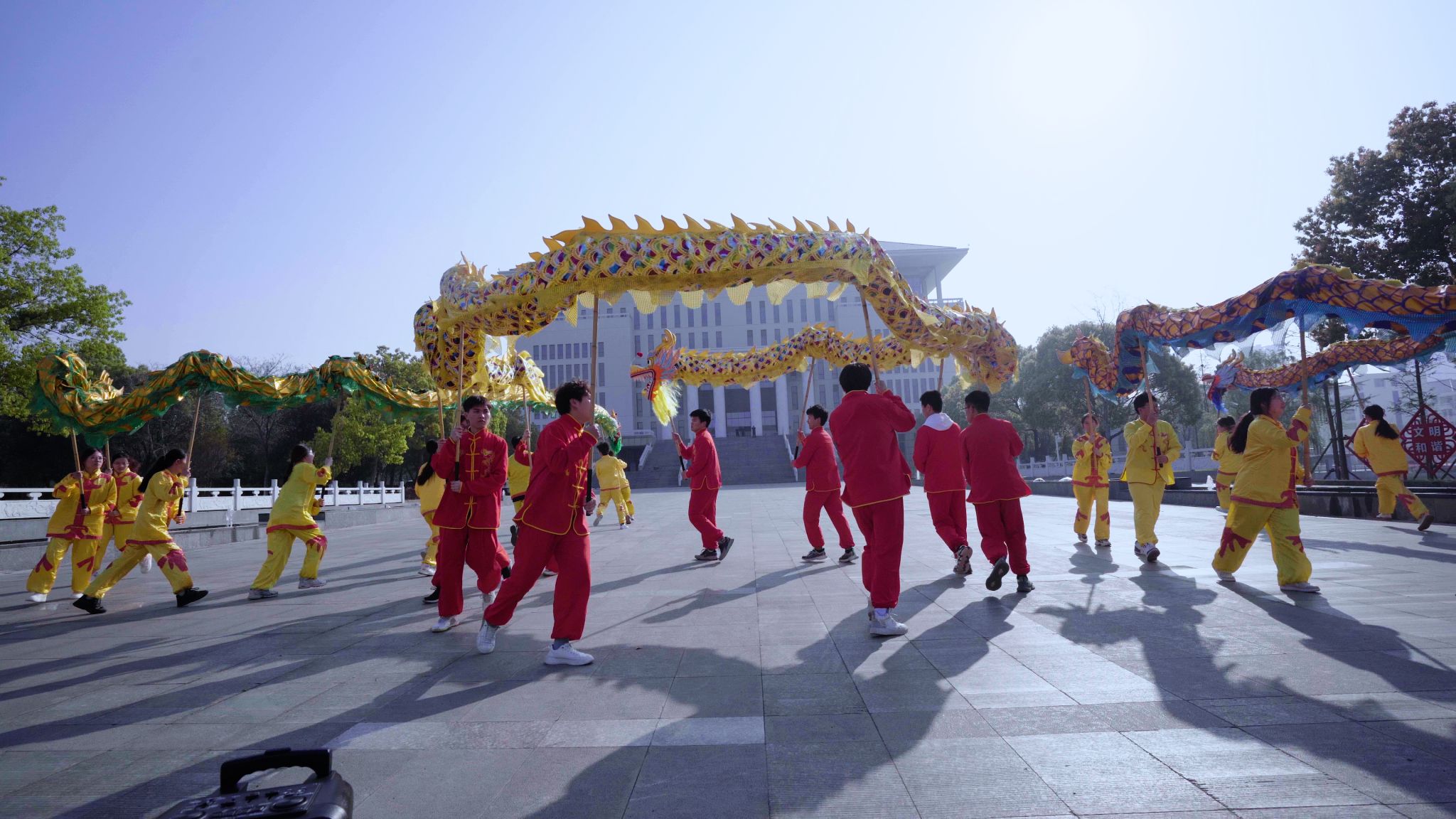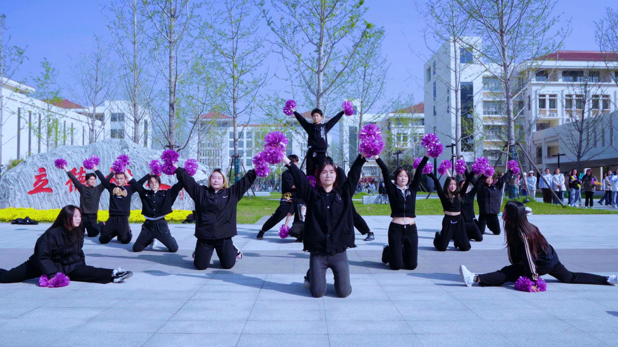 在校园赛道旁,热情的金科青年用表演和欢呼声为跑友加油助威