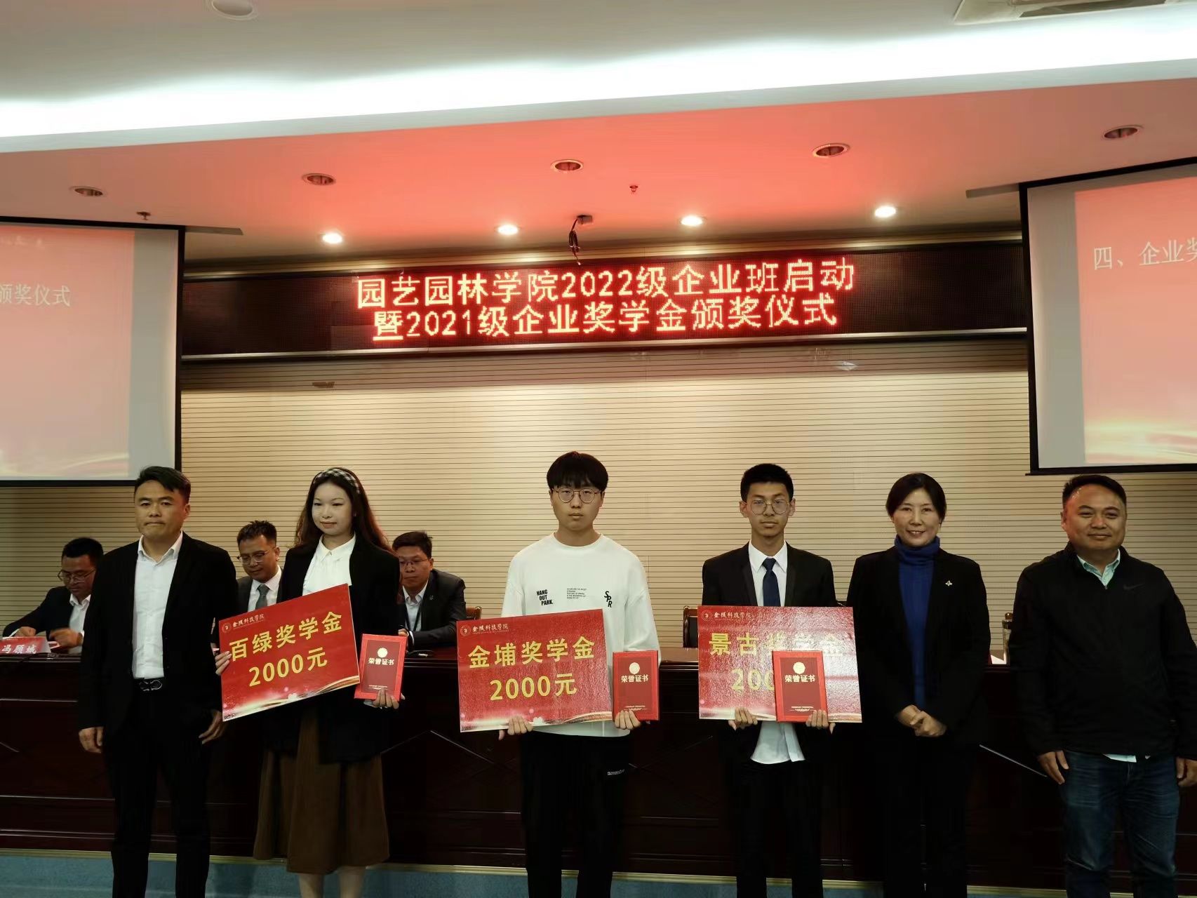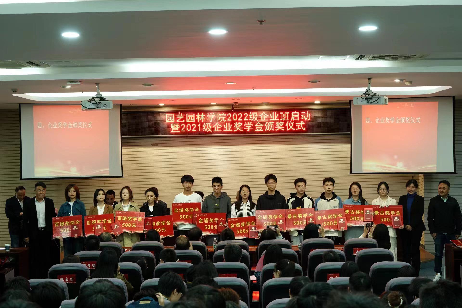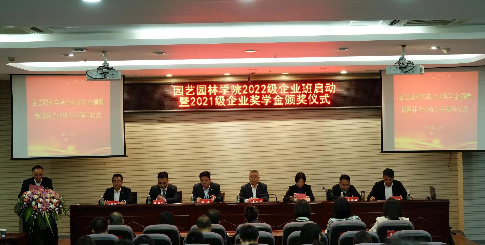 4月12日下午,园艺园林学院在学校幕府校区图书馆报告厅举办2022级企业班启动暨2021级企业奖学金颁奖仪式。副校长高永祥及来自南京逐鹿景观工程有限公司、上海棕源绿谷城镇建设有限公司、南京市溧水区华成蔬菜专业合作社、金埔园林股份有限公司、景古环境建设股份有限公司、江苏百绿园林集团有限公司的企业负责人和“企业班主任”参加了仪式。