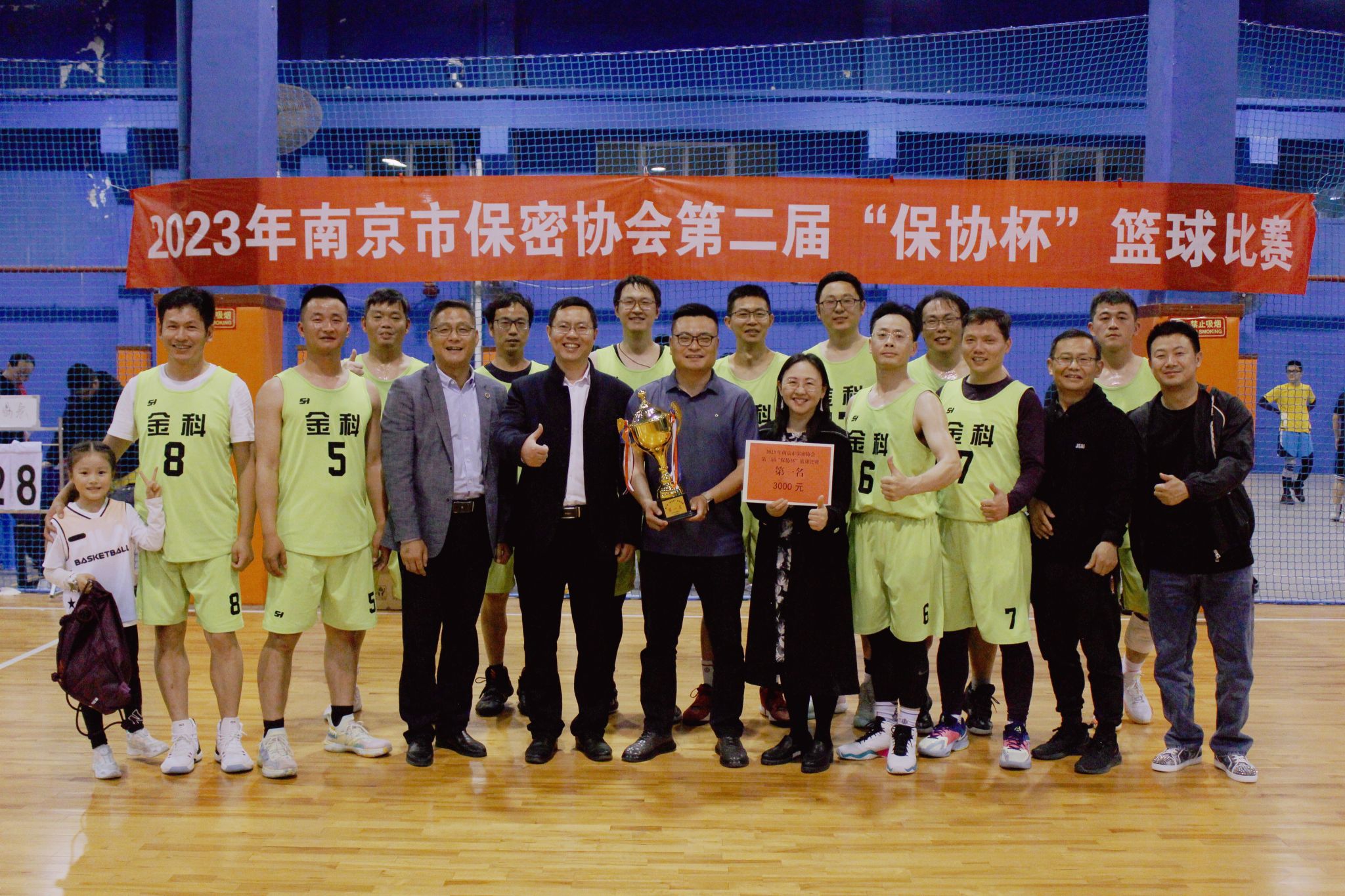 在4月22日闭幕的“保协会”篮球比赛中,我校教职工篮球队顽强拼搏,奋勇争先,以全胜的战绩夺得冠军。“保协会”篮球比赛由南京市保密协会组织开展,今年是第二届比赛,共有15个单位的职工篮球爱好者组成15支球队参赛。我校是首次参赛,由篮球俱乐部的教职工组队参加,党委办公室、工会、体育部对本次比赛给予了大力支持。