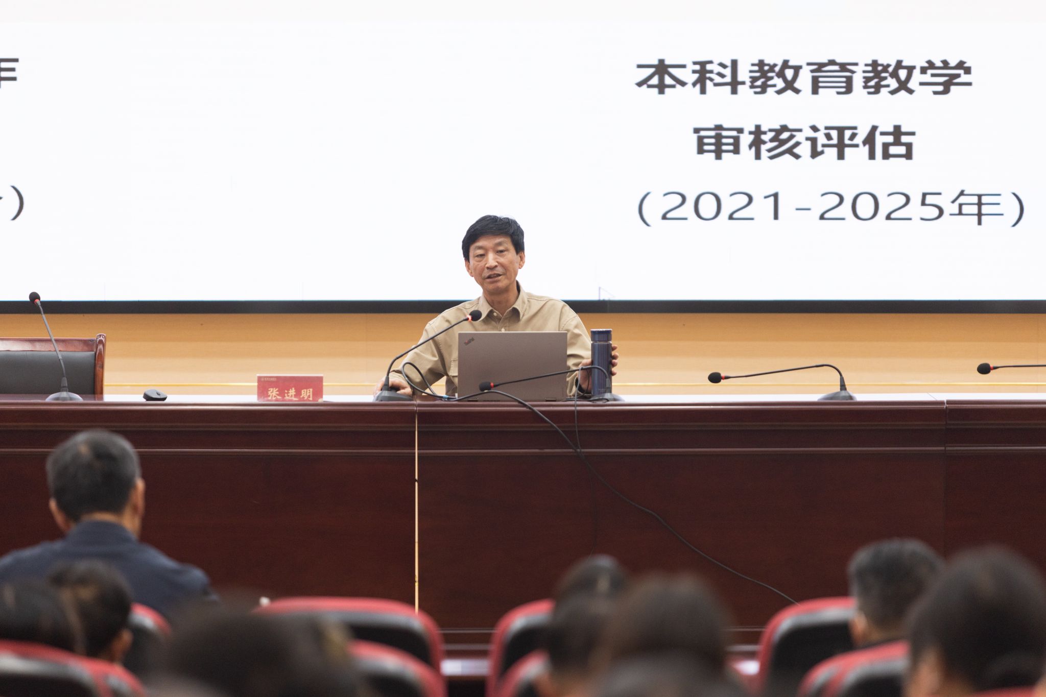 张进明以《审核评估——不被定义,就能创造意义》为题,站位于评估专家的视角,从新一轮评估“新”在哪里、专家组的成果及其形成过程、专家评估关注重点、以评促强的学校建议等几个方面,分享了审核评估工作的经验,提出了改进评建质效的建议。报告站位高、立意深、内容实,主题鲜明、视角新颖、可操作性强,为我校全面理解新一轮本科教育教学审核评估的精髓要义,精准吃透审核评估的理念与标准,加快推进自评自建,稳步做好审核评估攻坚提供了科学指导。
