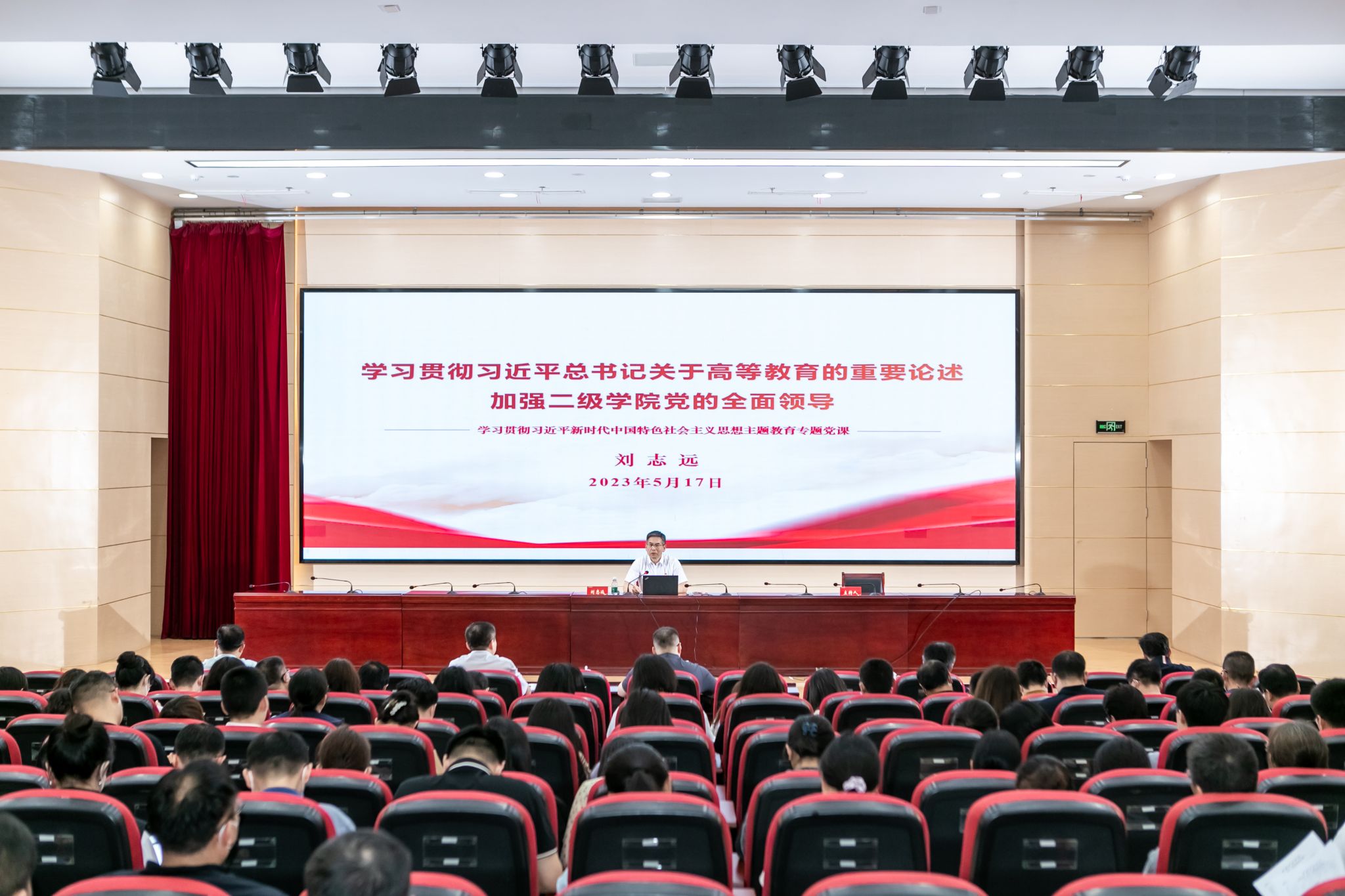 刘志远围绕深入学习习近平新时代中国特色社会主义思想,以《学习贯彻习近平总书记关于高等教育的重要论述——不断加强二级学院党的全面领导》为题,与师生党员们分享了自己学习贯彻党的创新理论的收获和体会,就不断加强二级学院党的建设,讲了自己的深入思考和改进工作举措。