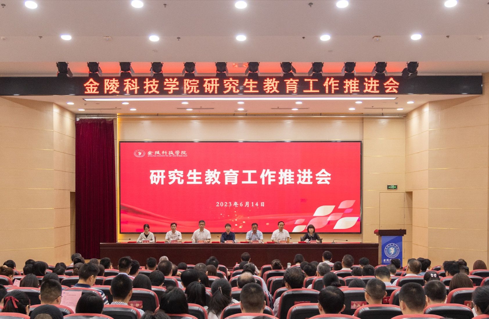6月14日,我校在科技楼报告厅召开研究生教育工作推进会。江苏省教育厅副厅长曹玉梅、南京市教育局副局长潘东标出席会议并讲话,江苏省教育厅研究生处副处长刘江涛、南京市教育局高师处处长王宾、全体校领导、校学位评定委员会委员、各职能部门负责人、二级学院中层以上干部、全体研究生导师、研究生公共课任课教师代表及各专硕点研究生秘书参加会议。会议由副校长叶智锐主持。