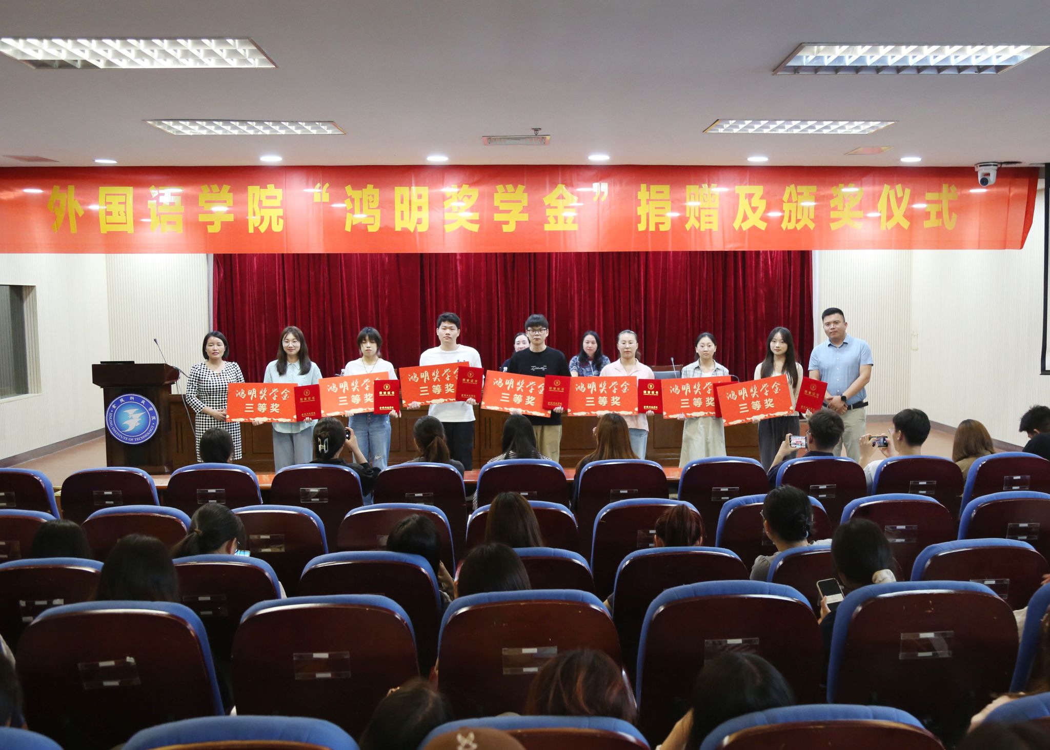 6月16日下午,外国语学院在图书馆第二报告厅举办“鸿明奖学金”捐赠及颁奖仪式,副校长顾晓燕出席活动并讲话,外国语学院领导班子和学生代表参加活动。