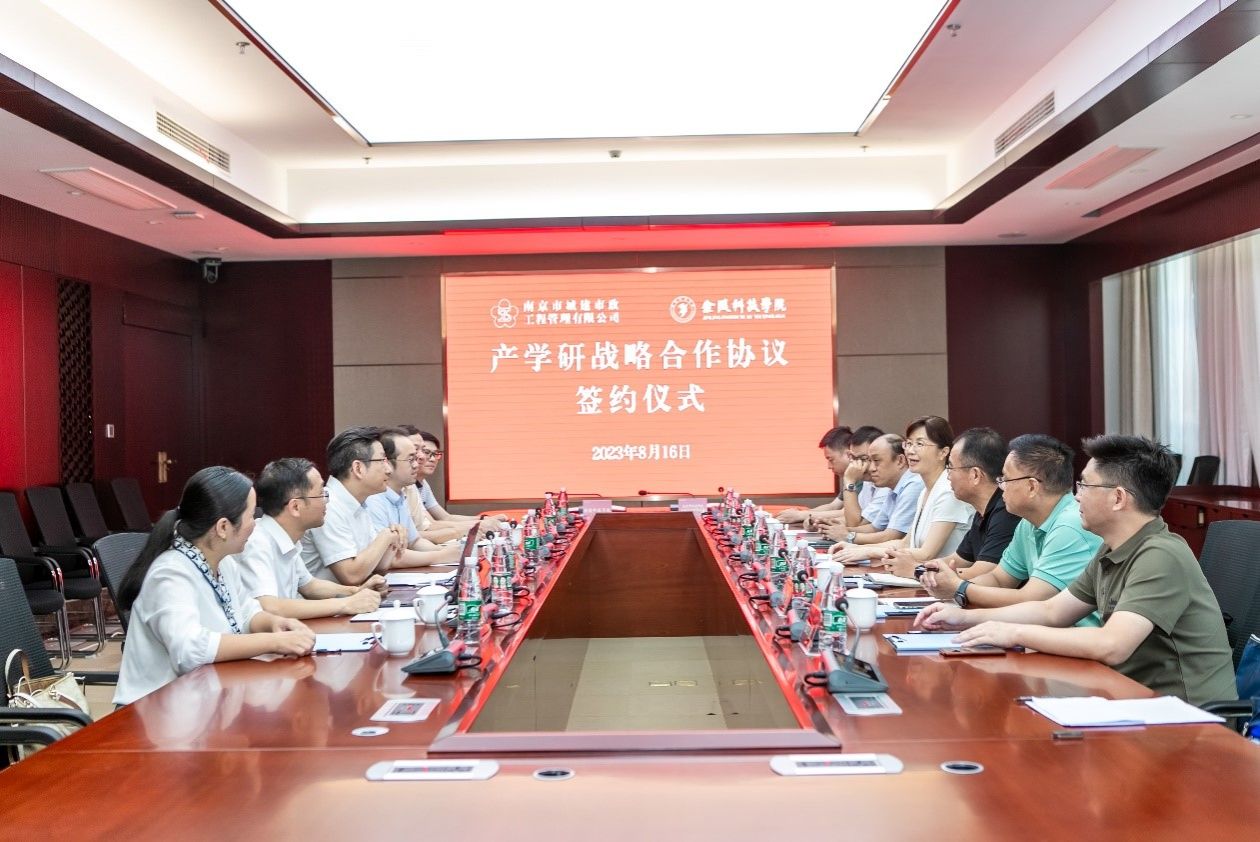 8月16日下午,我校与南京市城建市政工程管理有限公司产学研战略合作签约仪式在江宁校区举行。校党委副书记单晓峰,科技处、学生工作处、校友工作办公室、网络与通信工程学院相关负责人及智慧交通专业教师代表,南京市城建集团党委委员、总会计师陈红,南京市城建市政工程管理有限公司党委书记、董事长、总经理张冬林,党委副书记、董事冯波等人参加签约仪式。