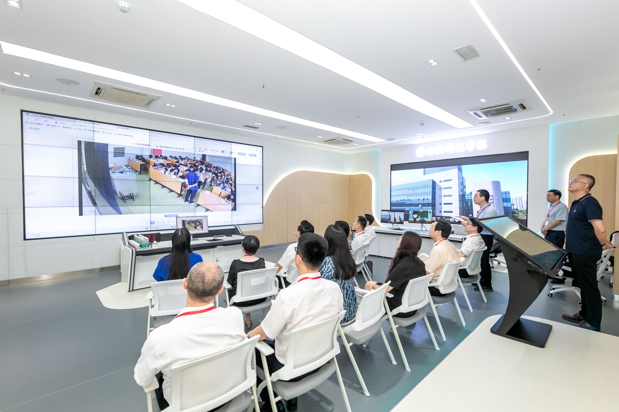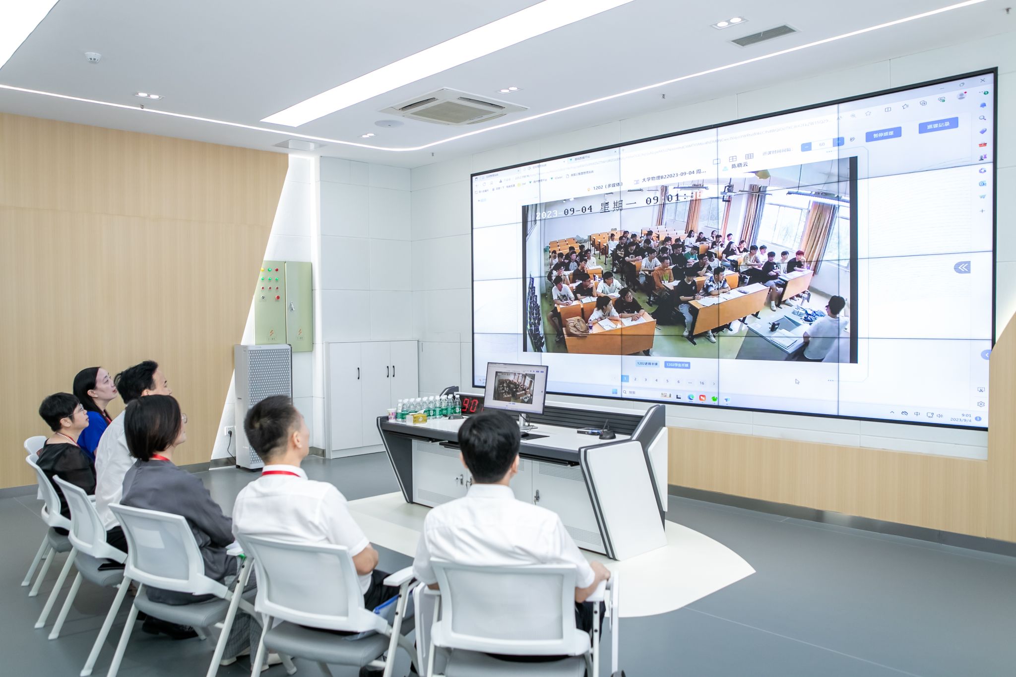 校领导一行前往学校深度教学及管理中心,通过可视化平台在线巡查全校课堂教学运行情况。随机抽查的课堂上,看任课教师精神饱满、态度认真,课堂秩序井然,学生听课状态良好,课堂教学运行平稳。