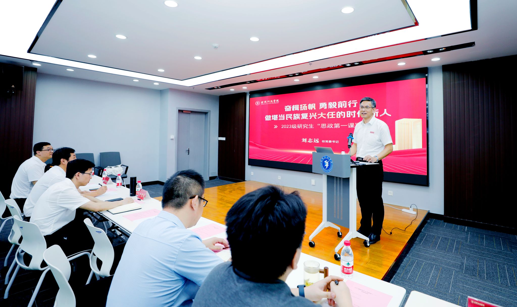 刘志远以《奋楫扬帆 勇毅前行 做堪当民族复兴大任的时代新人》为题,为2023级研究生上了思想政治教育第一课。他从校情校史出发,立足时代背景,分析国际国内环境,鼓励同学们脚踏实地,砥砺奋进,珍惜在研究生阶段的学习时光,始终秉承“厚德兴业”的校训,在担负时代使命中彰显人生价值。他对同学们提出了六点希望:一要坚定理想信念,树立强国报国之志。要将个人前途与国家命运同频共振,顺应时代潮流,把个人成长融入祖国发展需要,努力成长为堪当民族复兴重任的时代新人。二要坚持敢为人先,追寻守正创新之路。要在创新的深度和广度上下功夫,既要聚焦问题、锚定方向,深耕自己的研究领域,又要突破固有认知的局限,以交叉融通启发新思维、开辟新境界、实现新突破。三要找准自身定位,谋定成长发展之策。要时刻关注国家社会的重大需求,密切接触行业、企业,学会从生产生活实践中去发现问题并解决问题,真正实现自己研究生阶段的学习目标。四要学会团结协作,锤炼勇毅前行之力。要善于分享和相互学习,保有敏锐洞察事物的活力,具备持续不懈钻研的毅力,在大胆质疑、勇于尝试中充分激发奇思妙想,不断提升创新创造能力。五要坚持学术规范,恪守学术道德底线。要严于律己、求真务实,踏踏实实写论文,认认真真做科研,求真学问、练真本领。六要积极乐观向上,永葆奋发进取之心。邀养成良好的作息和锻炼身体的习惯,秉承学校“让运动成为习惯、让生命更加精彩”的理念,强体魄、健身心,为自己的学习、生活和工作打下坚实基础。