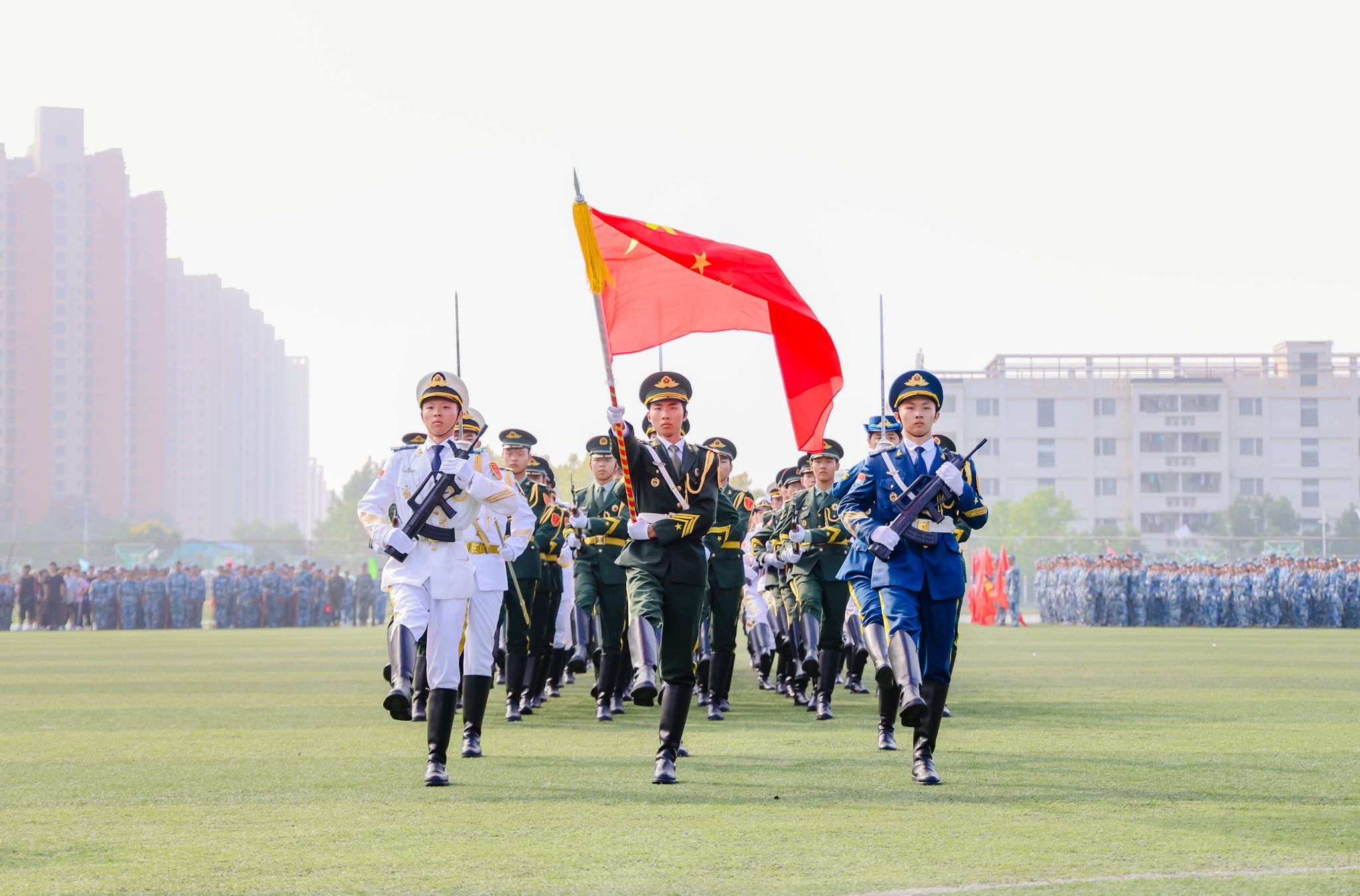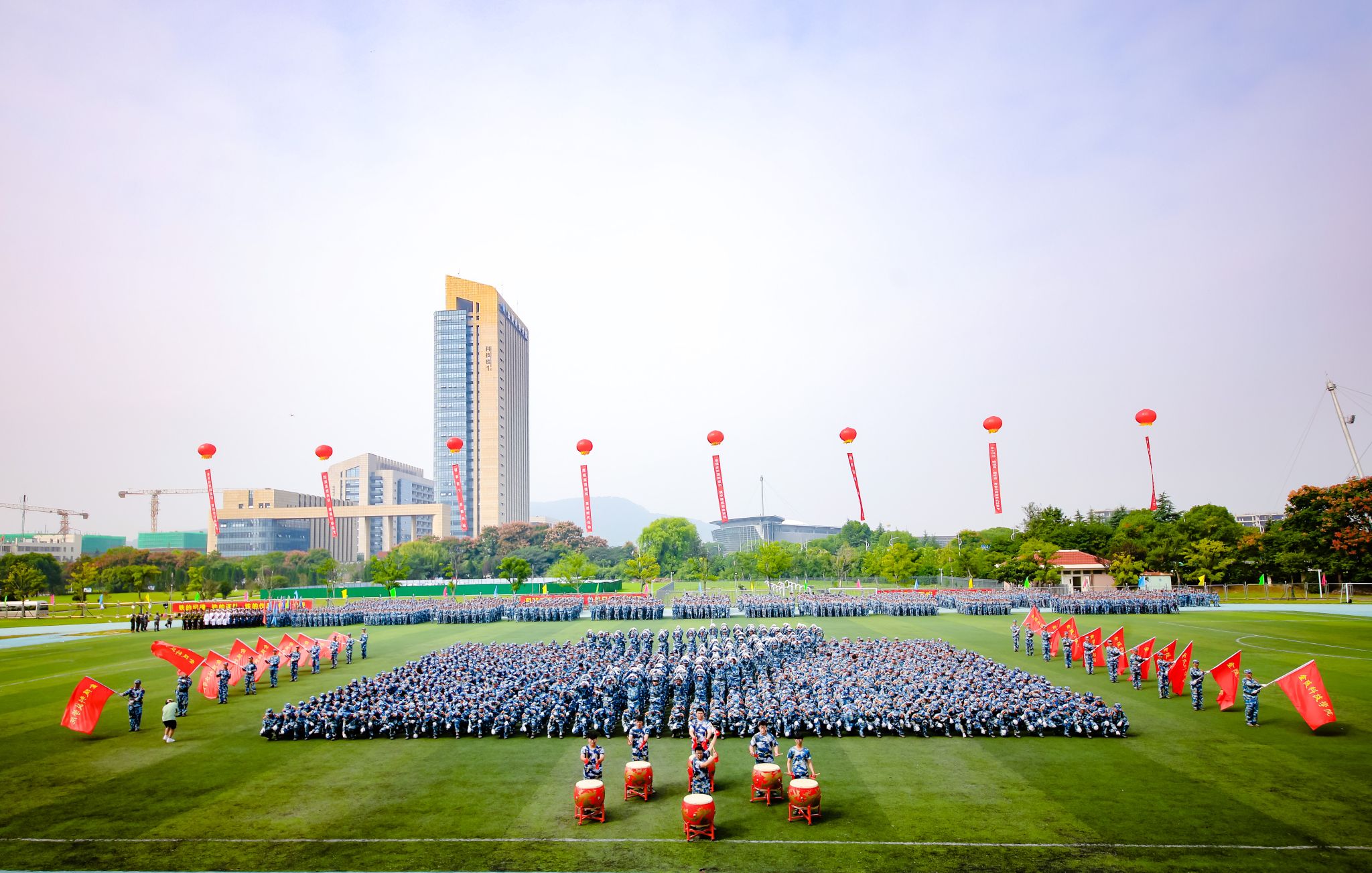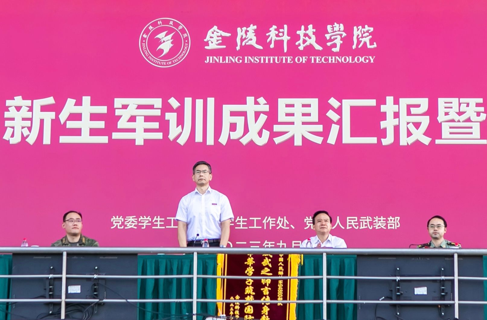 9月27日,我校2023级本科新生军训成果汇报暨表彰大会在江宁校区北运动场举行。校党委书记刘志远、校长刘永彪、党委副书记单晓峰、副校长张燕、副校长倪杰、副校长高永祥、纪委书记王延光、副校长顾晓燕、副校长叶智锐,承训部队首长,相关职能部门负责人、各二级学院党政负责人、新生辅导员和班主任、2023级全体军训团成员参加大会。单晓峰主持大会。