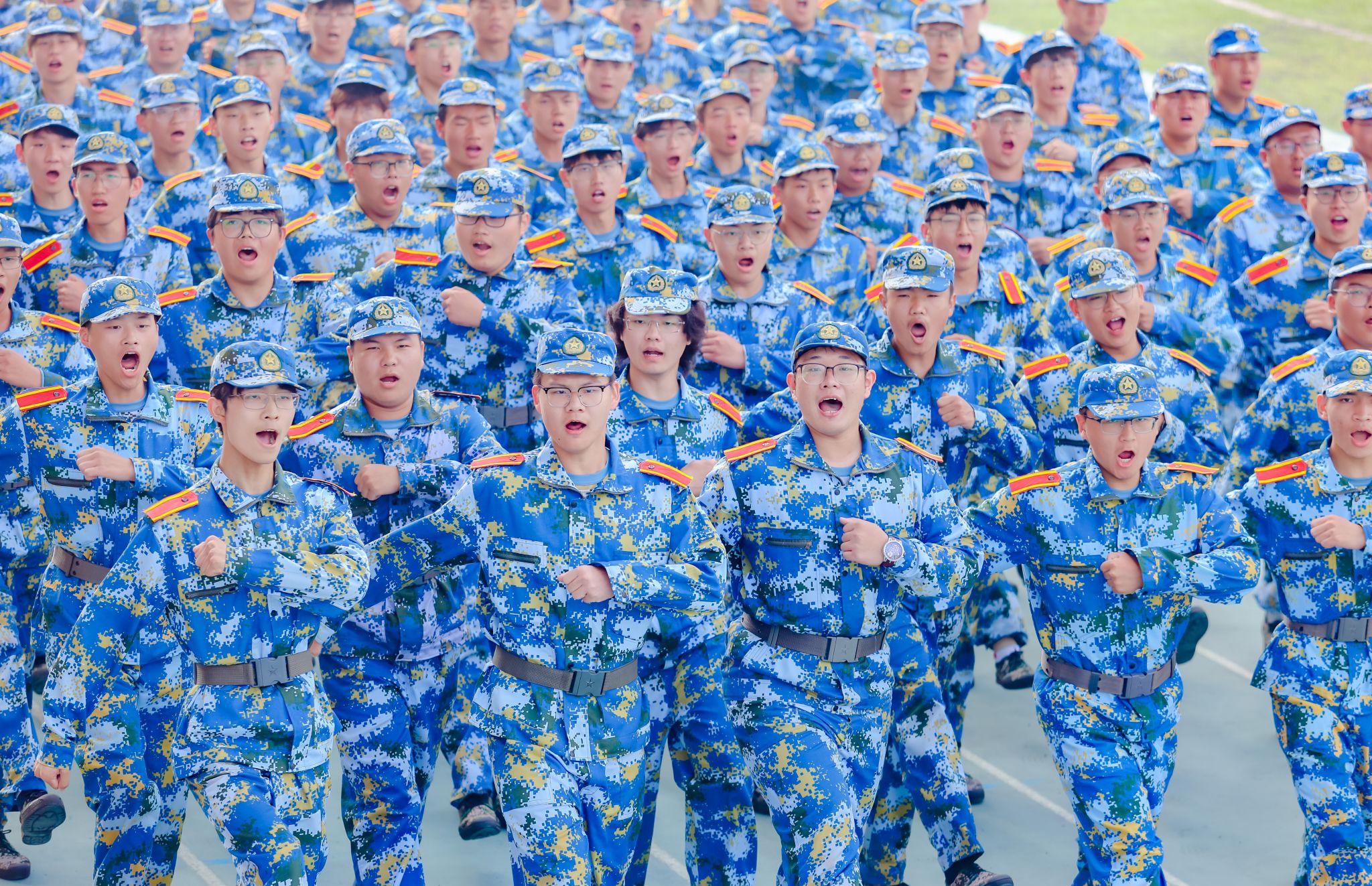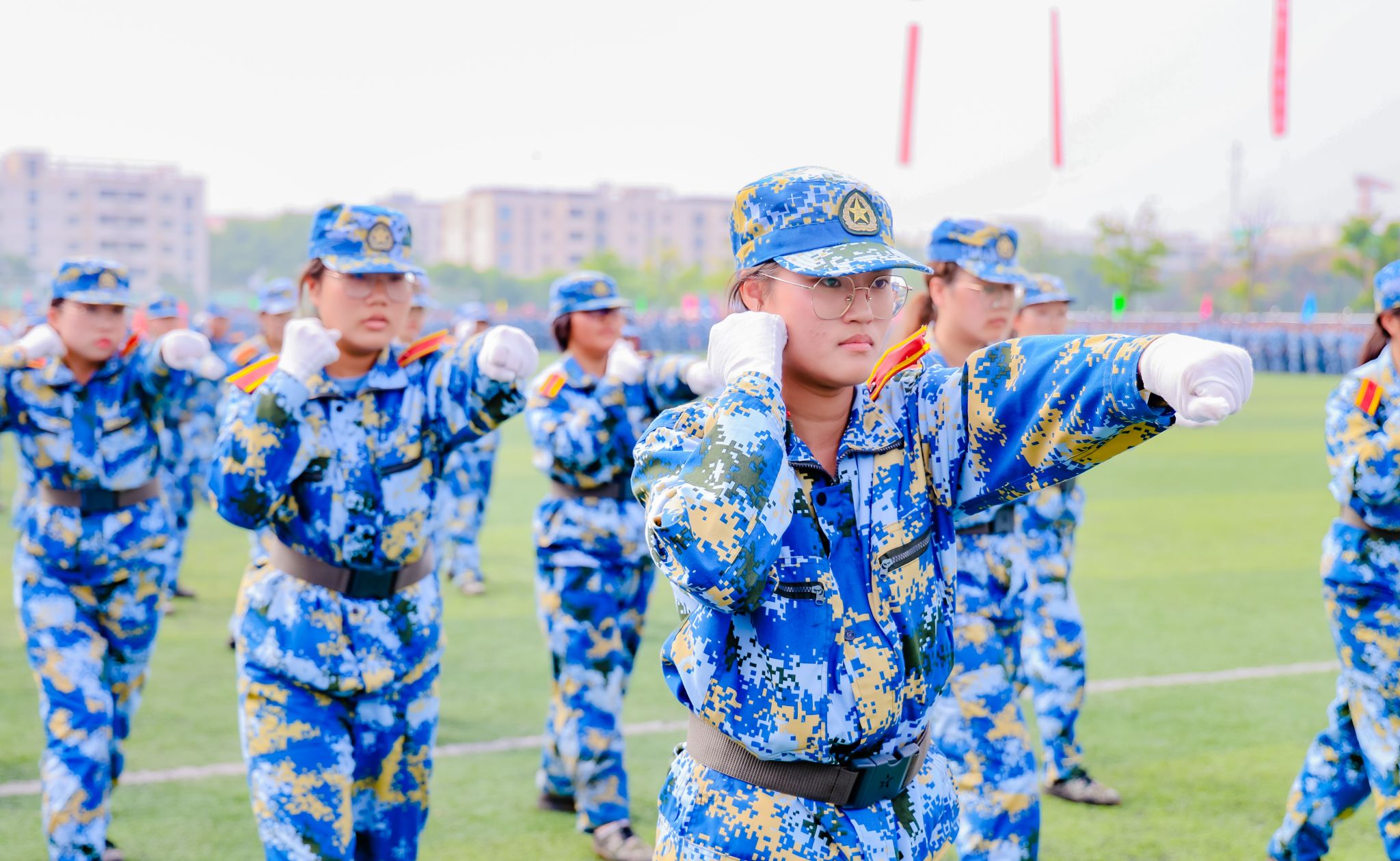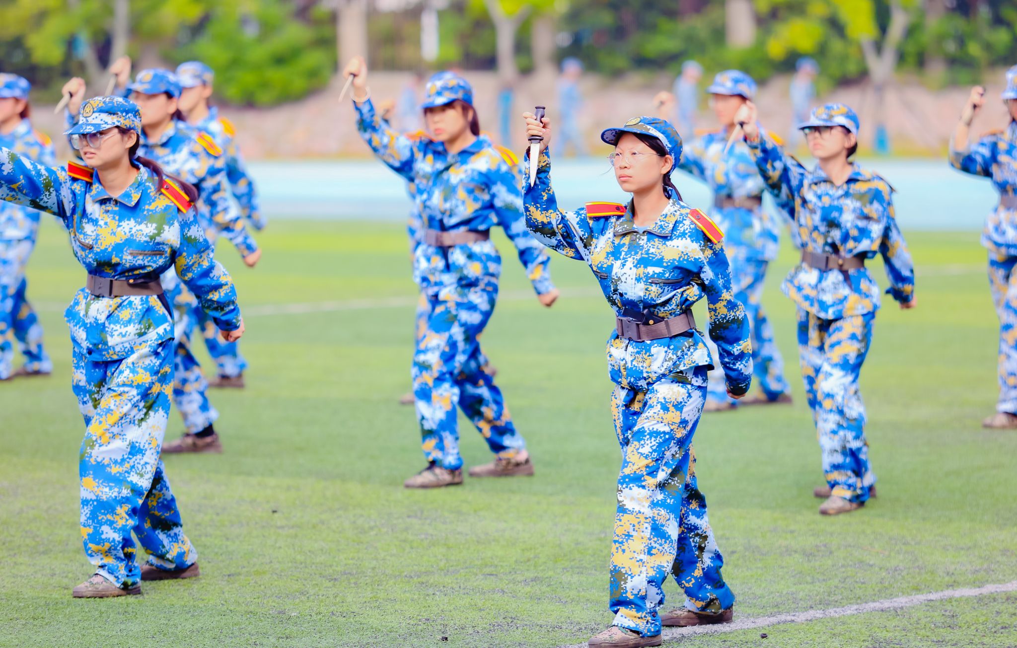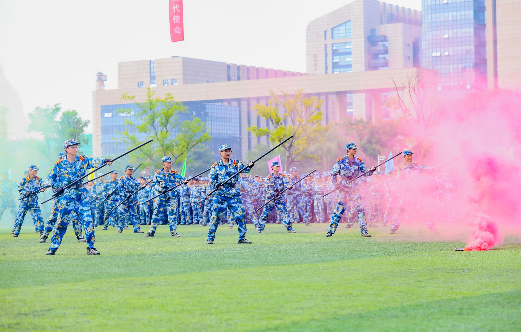 首先举行升国旗仪式,五星红旗在国旗班的护卫下,伴随着雄壮的国歌声冉冉升起。随着刘志远下达“开始”指令,军训汇报正式拉开序幕。分列式上,各学院方阵口号响亮,步伐整齐,展示出良好的军事训练效果。1200名金科学子组成的方阵变化出“2023”“新生”“汇报”“演出”及倒计时的字样,拉开了表演的序幕。擒敌拳、搏击术、匕首操,一招一式行云流水,一进一退攻守兼备,极具视觉冲击。“沉浸式”战术表演使人身临其境,模拟战场狼烟滚滚,将军训成果汇报表演推向高潮。来自商学院的8名退役复学学生代表向母校报到,充分展示了退役不褪色、换装不换志的军人担当。