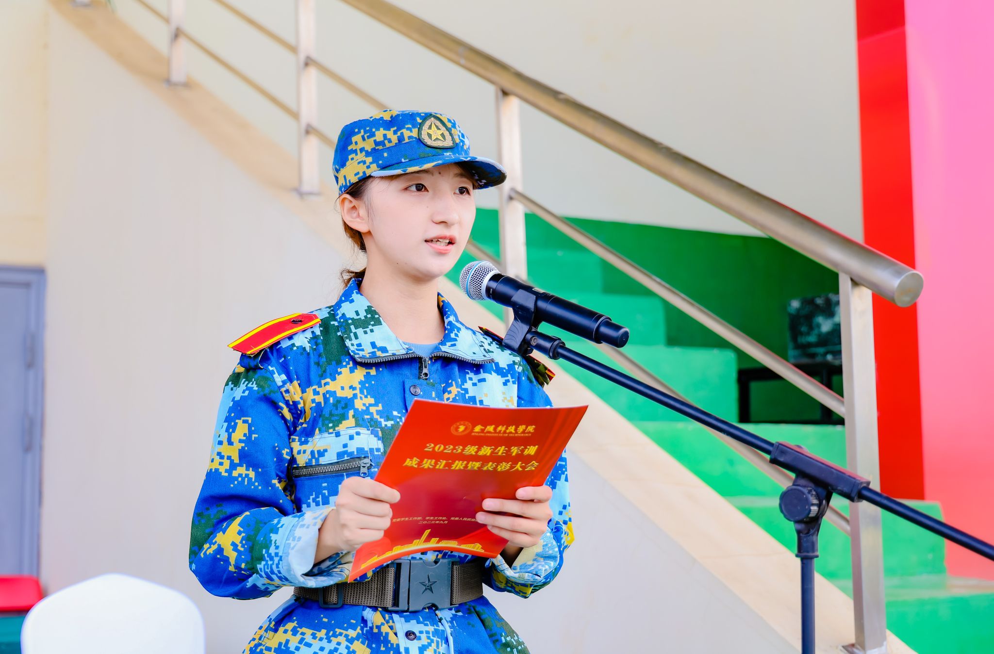 表彰环节,刘永彪向承训的94860部队赠送锦旗,顾晓燕宣读《关于表彰开云在线二〇二三级学生军训“优秀学员”的决定》,人文学院新生段雨君作为优秀学员代表上台发言。