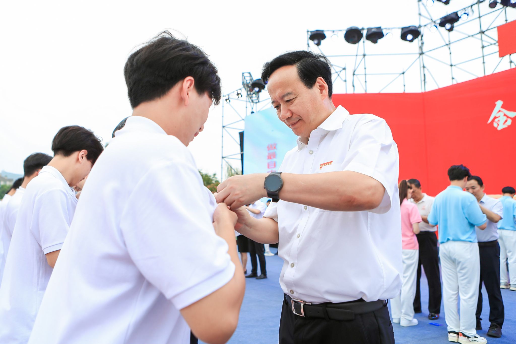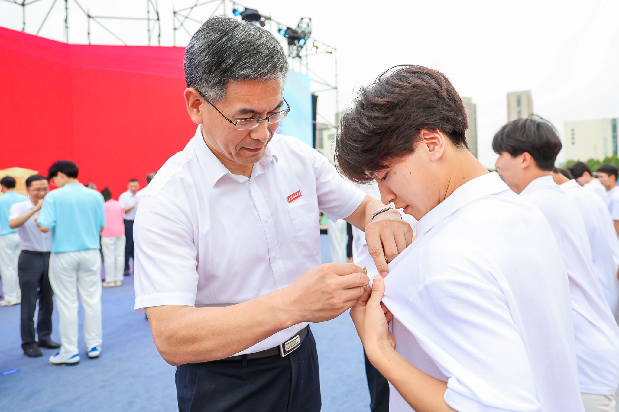 活动现场,全体校领导、相关部门负责人、各二级学院书记、院长为新生代表佩戴校徽。伴随着歌声,校旗在新生中传递,寓意着奋斗新征程的金科精神在一代又一代金科学子手中接续相传、生生不息。