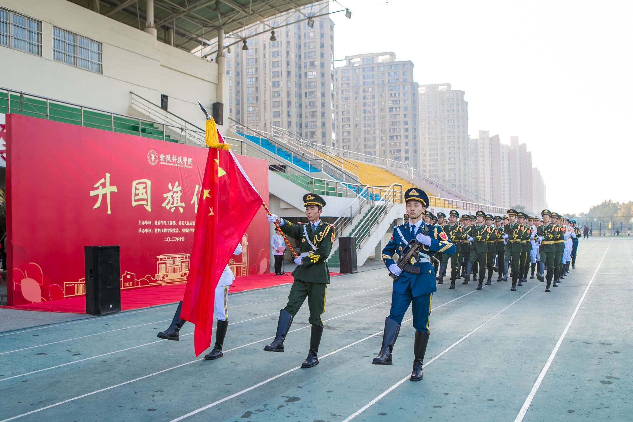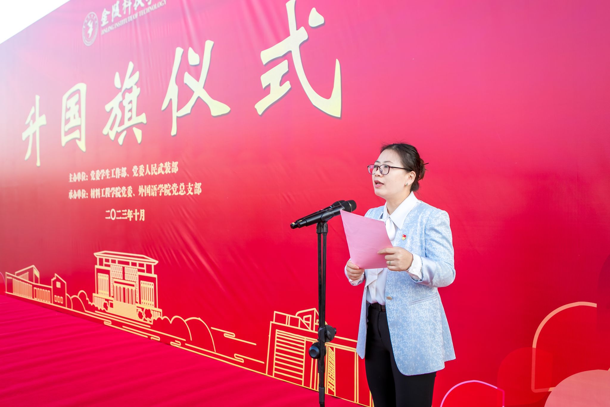 10月30日清晨,我校800余名师生齐聚江宁校区北区田径场,隆重举行升国旗仪式,共上“国旗下的思政课”。副校长顾晓燕出席仪式,党委学生工作部、党委人民武装部、材料工程学院和外国语学院党政负责人及师生代表参加活动。升旗仪式由党委学生工作部、党委人民武装部主办,材料工程学院党委和外国语学党总支部承办。