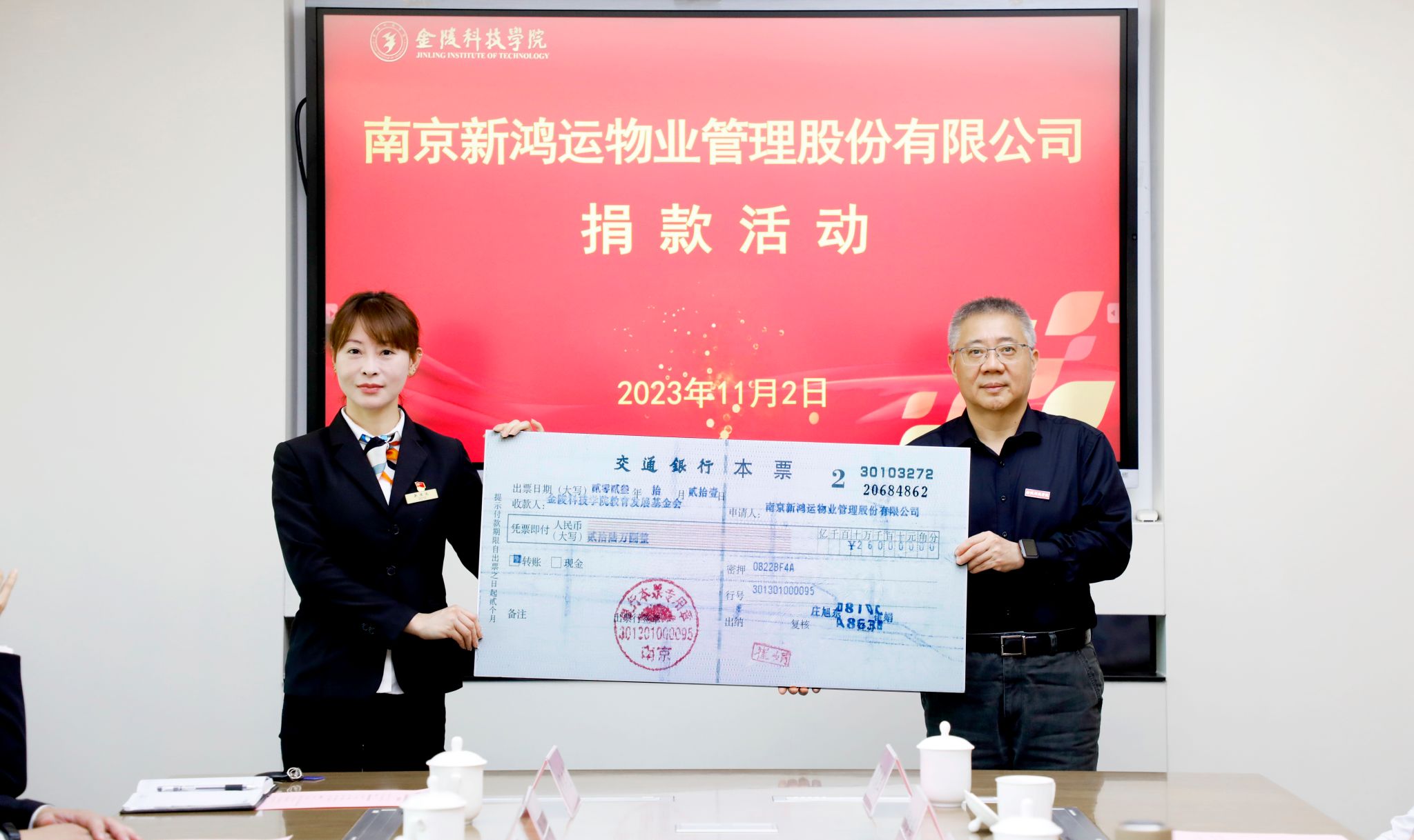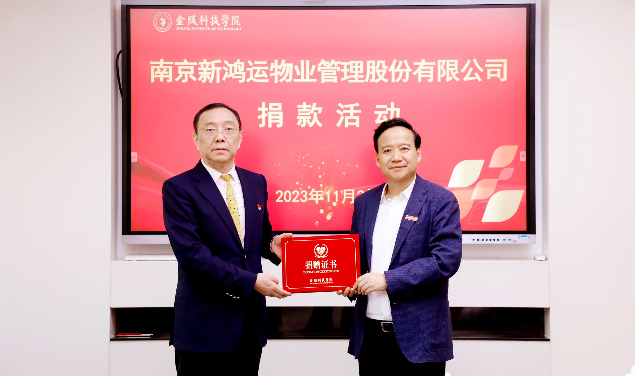 11月2日上午,南京新鸿运物业管理股份有限公司捐款活动在江宁校区行政楼319会议室举行。新鸿运公司董事长王中宁、副总经理徐敏及培训部负责人和项目经理,我校校长刘永彪、副校长高永祥及校长办公室、学生工作处、后勤管理处、后勤实业总公司及教育发展基金会负责人参加捐款活动。活动由高永祥主持。