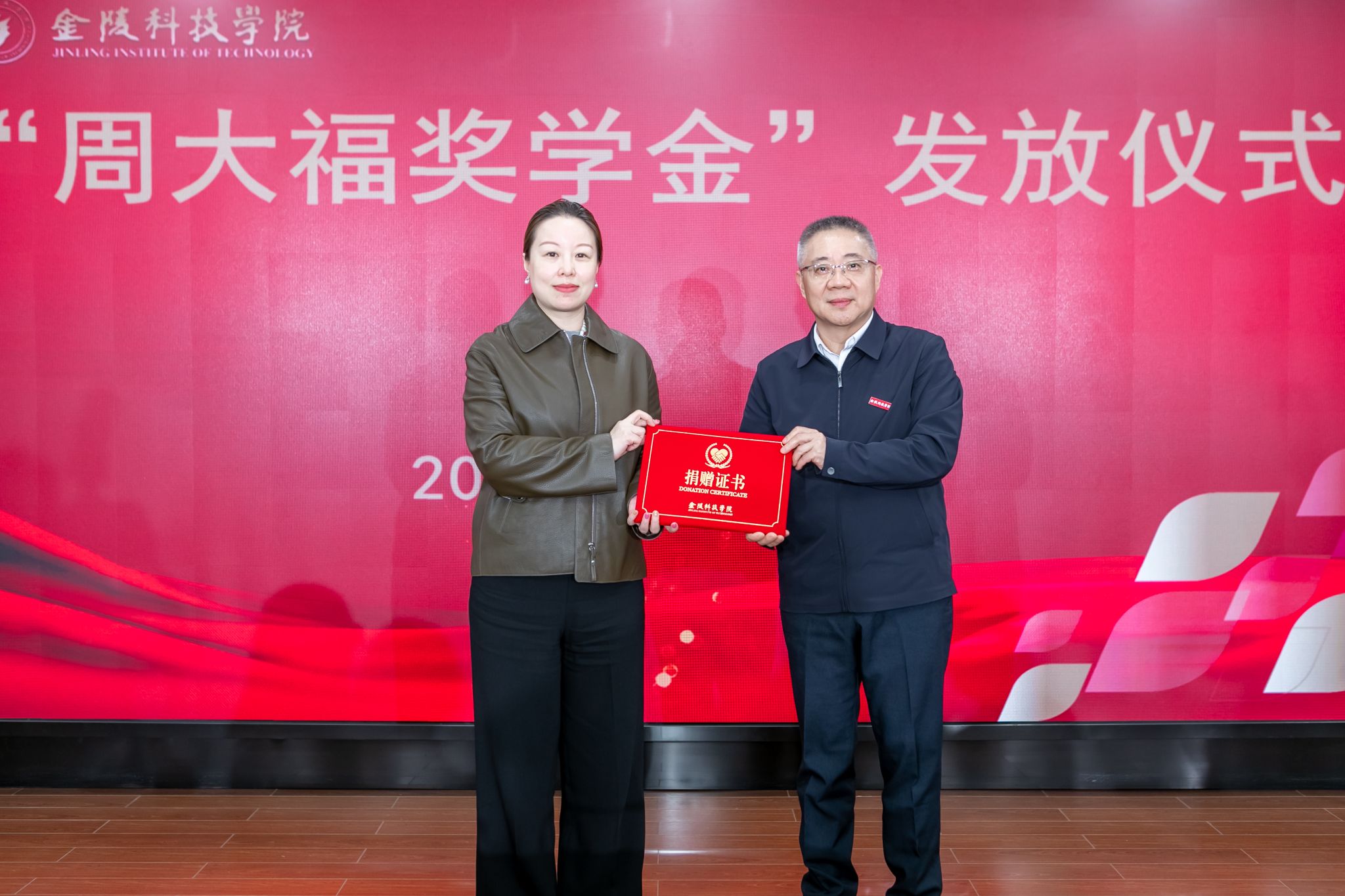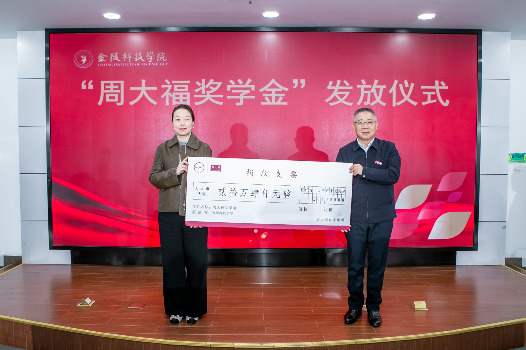 孙媛对我校近年来取得的成绩表示赞许,对获得奖学金的同学表示祝贺,并介绍了周大福珠宝集团有限公司的发展历程、业务内容、公司文化、校企合作等情况。她表示,公司长期重视企业的社会责任,通过捐资助学等公益活动积极回馈社会,促进教育事业发展。她希望双方在人才培养、产学研合作、科技创新等方面进一步深化合作,携手共进。她热忱欢迎学校广大师生到公司参观交流,在深化产教融合校企合作等方面进一步加强合作,共促事业高质量发展。