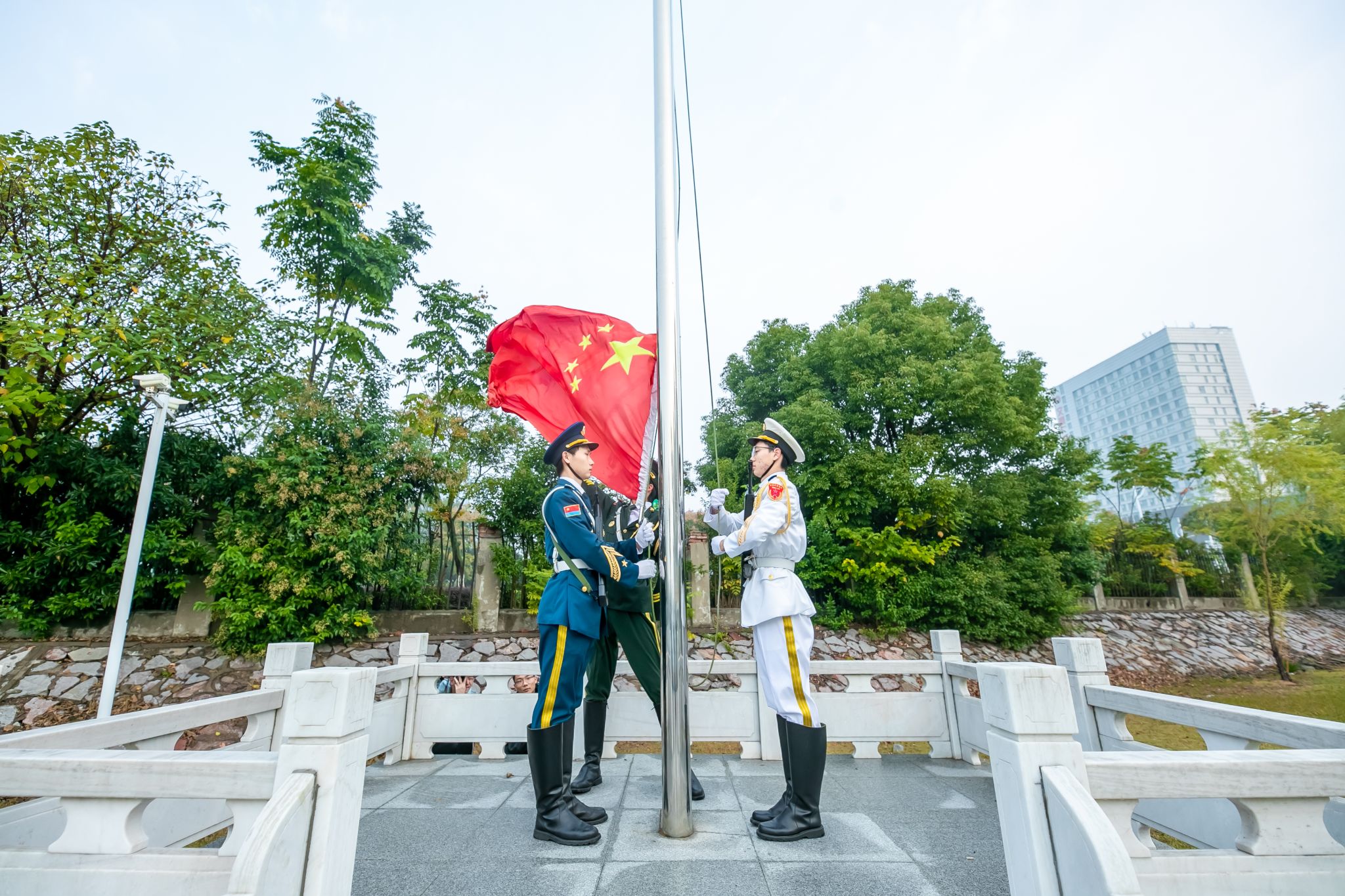 7点30分,升国旗仪式正式开始。国旗护卫队迈着整齐有力的步伐护送国旗至升旗台。在雄壮的国歌声中,鲜艳的五星红旗冉冉升起,师生齐唱国歌。