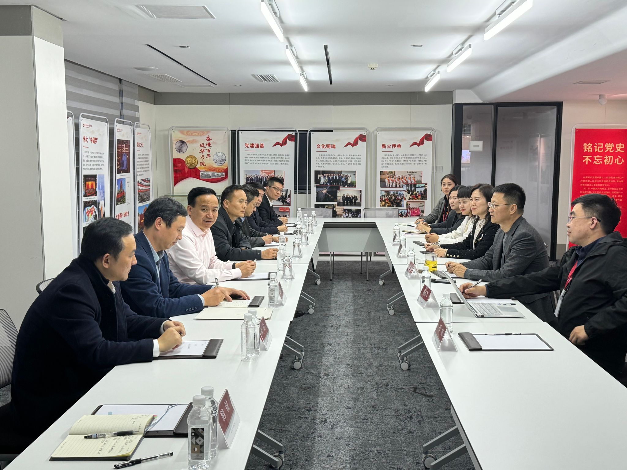 11月20日下午,校长刘永彪带队赴永银文化集团开展合作洽谈。校纪委书记王延光及校长办公室、合作与发展规划处、科技处、商学院、人文学院、艺术学院、动漫学院相关负责人参加了活动。永银文化集团董事长陈永带领党总支书记肖东柯、HR负责人杨志昂、永银钱币博物馆运营总监祁敏、永银体育总经理史学荣参加合作洽谈。