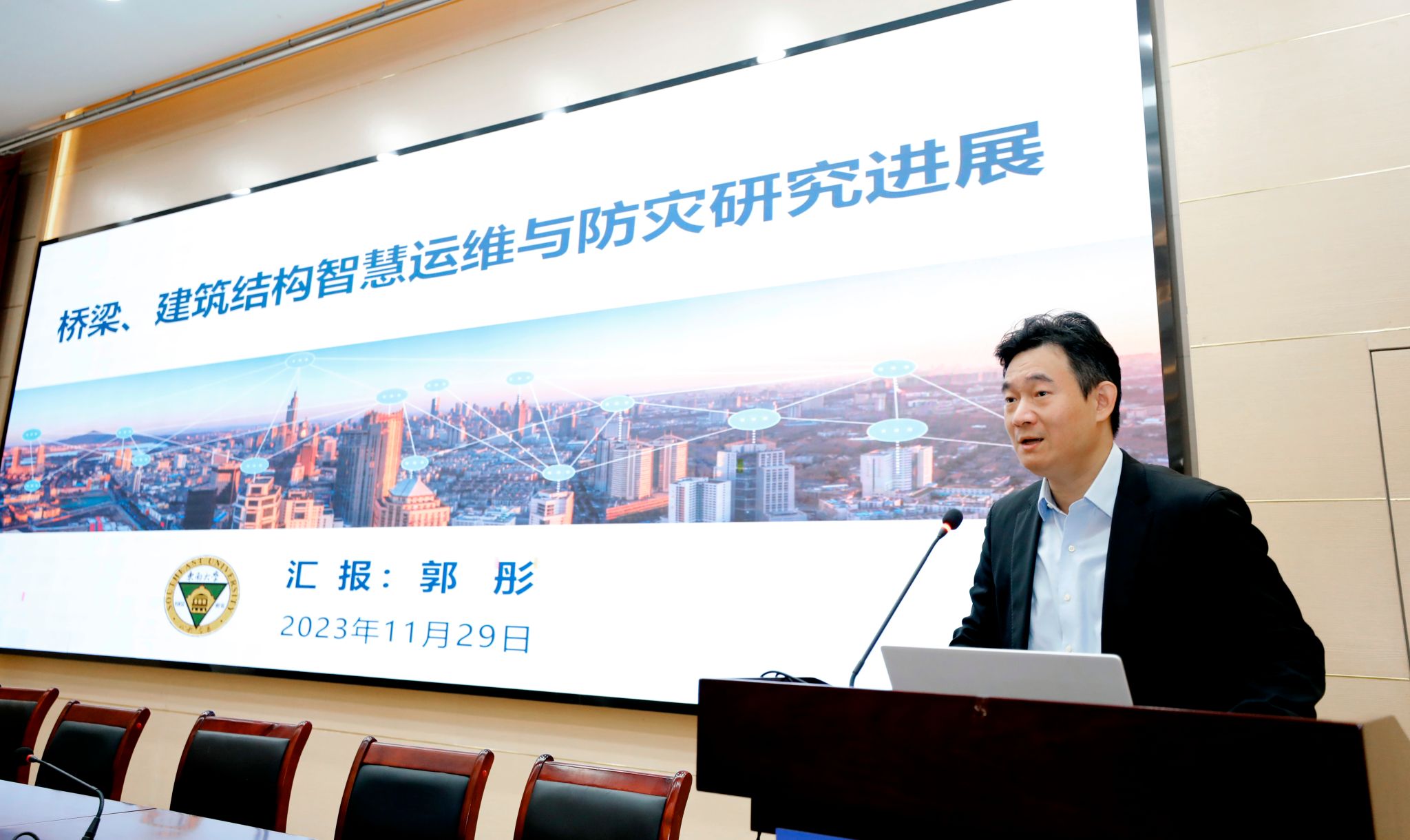 11月29日,国家杰出青年基金获得者、东南大学土木工程学院院长郭彤教授应邀做客金科学术讲堂,为我校师生作题为《桥梁、建筑结构智慧运维与防灾研究进展》的学术报告。报告由副校长叶智锐主持。