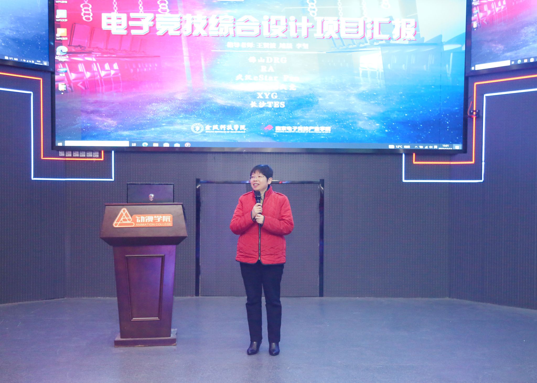 12月15日下午,南京电子竞技产业学院在7100未来人类电竞馆举行了《电子竞技综合设计》课程结课成果汇报会,副校长张燕、江宁高新区数字经济与未来产业部副部长钱晶晶、南京云锦研究所自媒体负责人汪夏阳、南京Hero久竞俱乐部总经理梁祎阳、江宁电竞中心馆长钱莹莹、棱镜建筑设计有限公司法人兼执行董事肖龙兵、苏青S+新兴青年群体联盟副秘书长、电竞小组组长随予洁、江苏省电子竞技运动协会副秘书长墙晟、苏州博派科技未来人类电竞战队教练李坚参加汇报会。动漫学院院长王贤波主持汇报会。